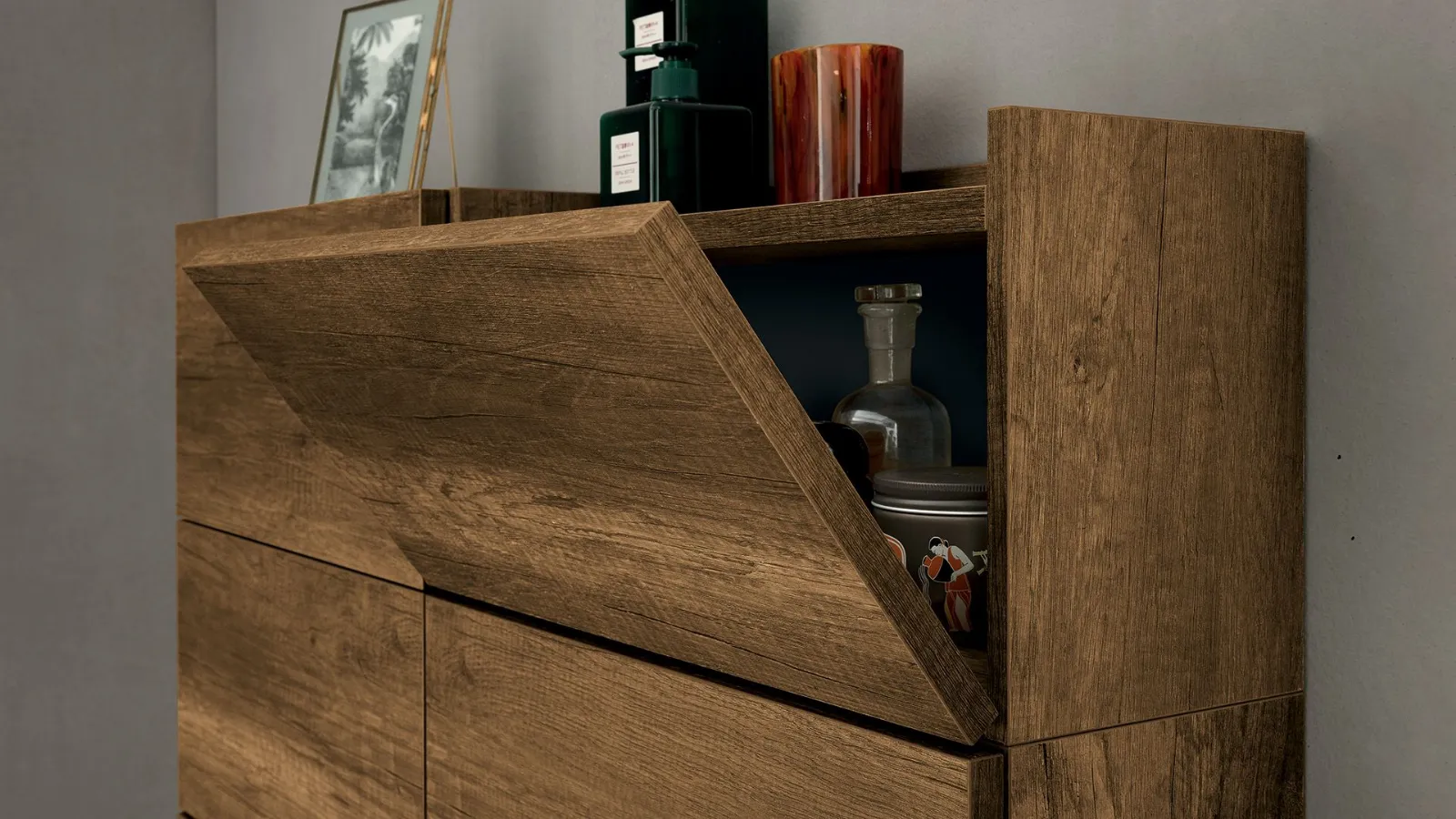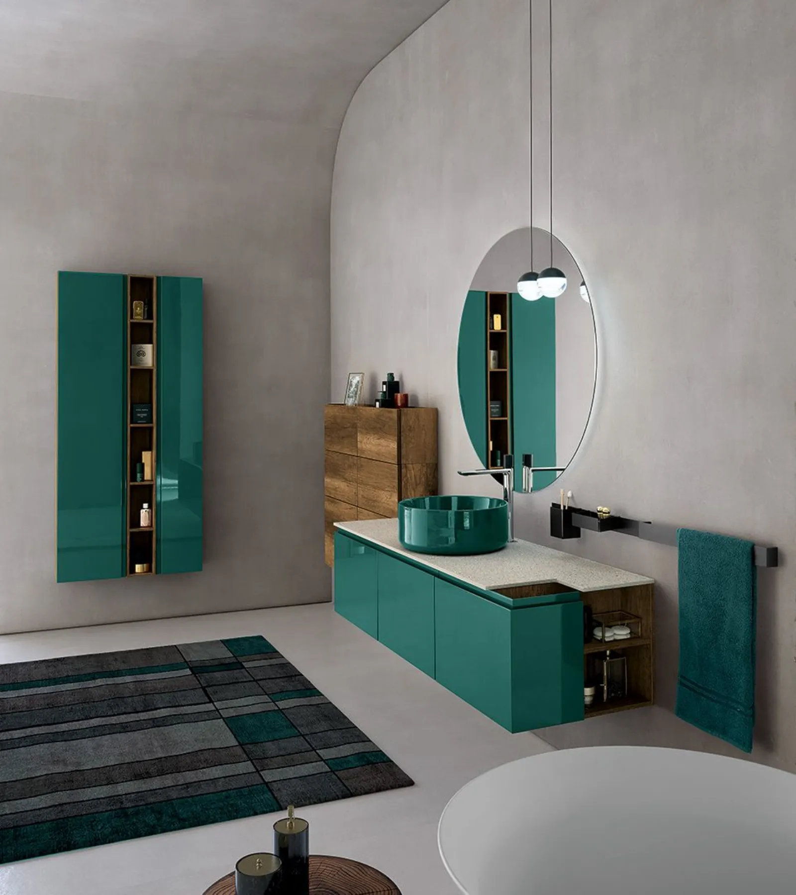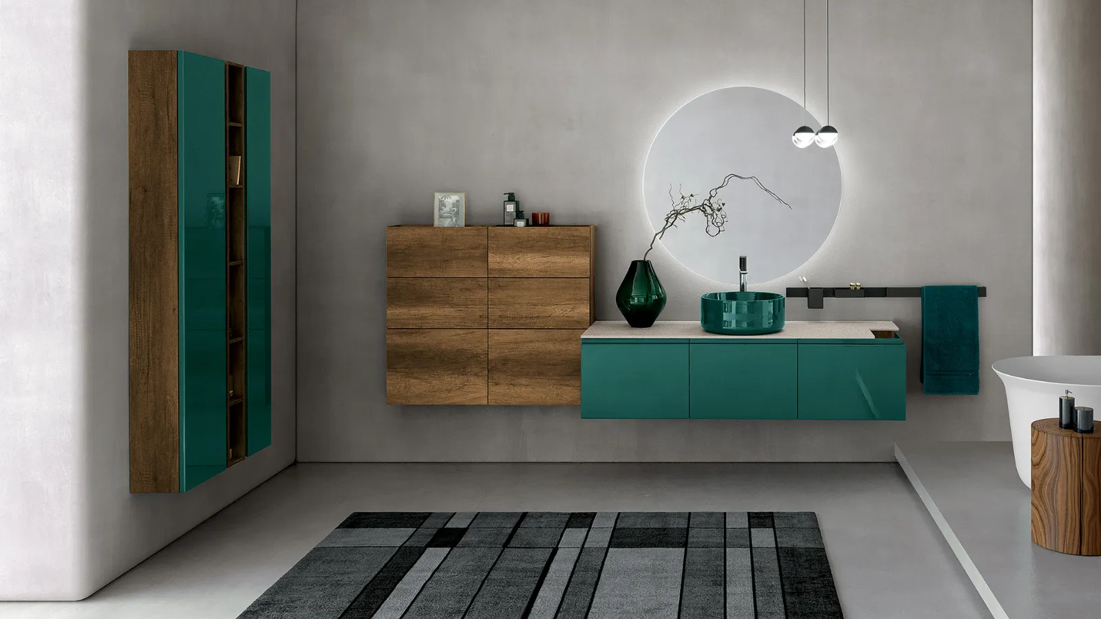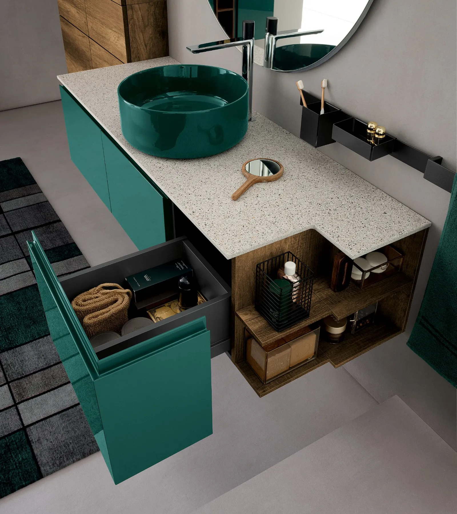 Laccato Canapa Opaco, elemento a giorno Laccato Grafite Opaco, top Deimos Stone texture Sabbia, lavabo incasso in Deimos Stone Sabbia, specchio profilo alluminio e lampada Clio Slim.
