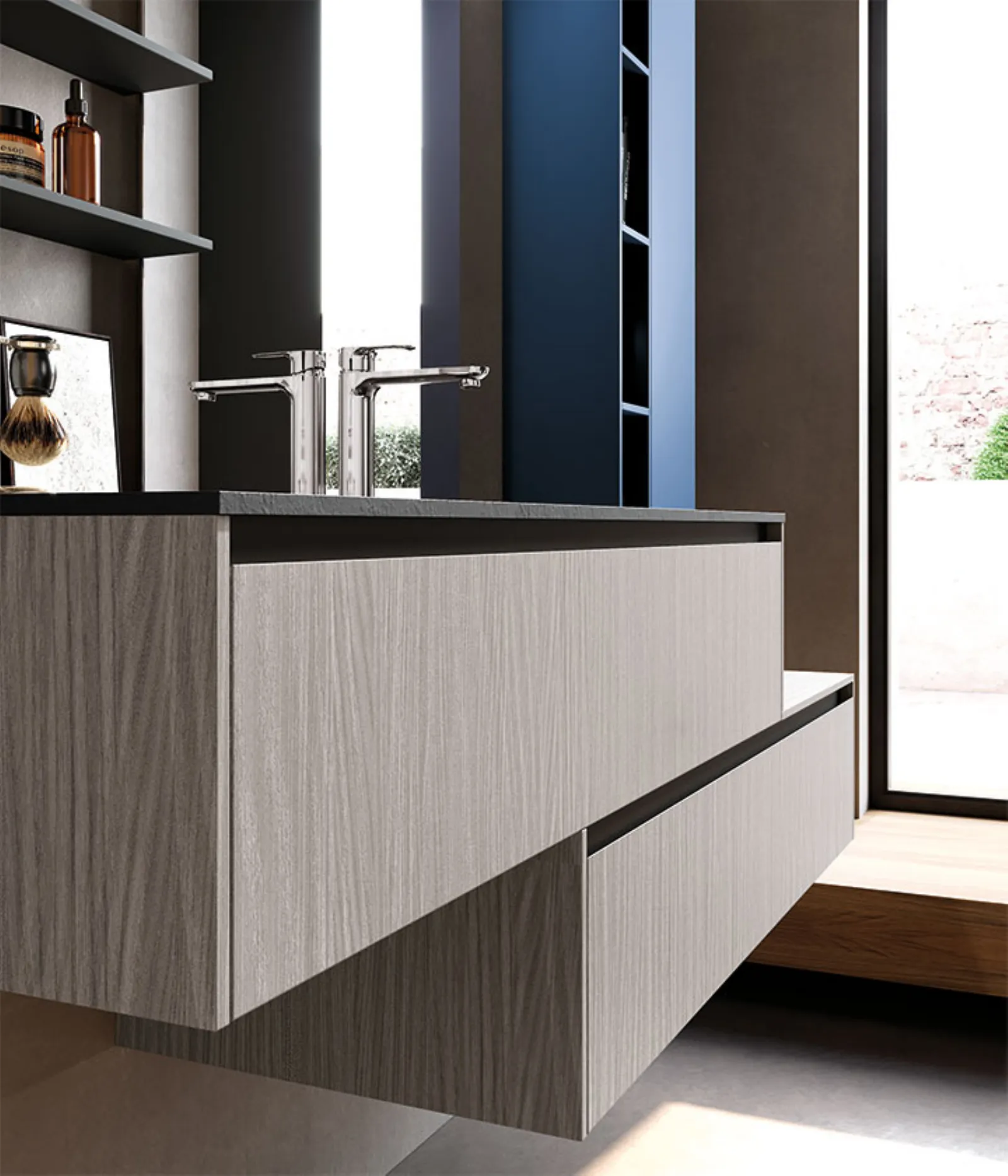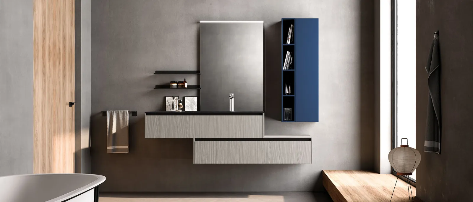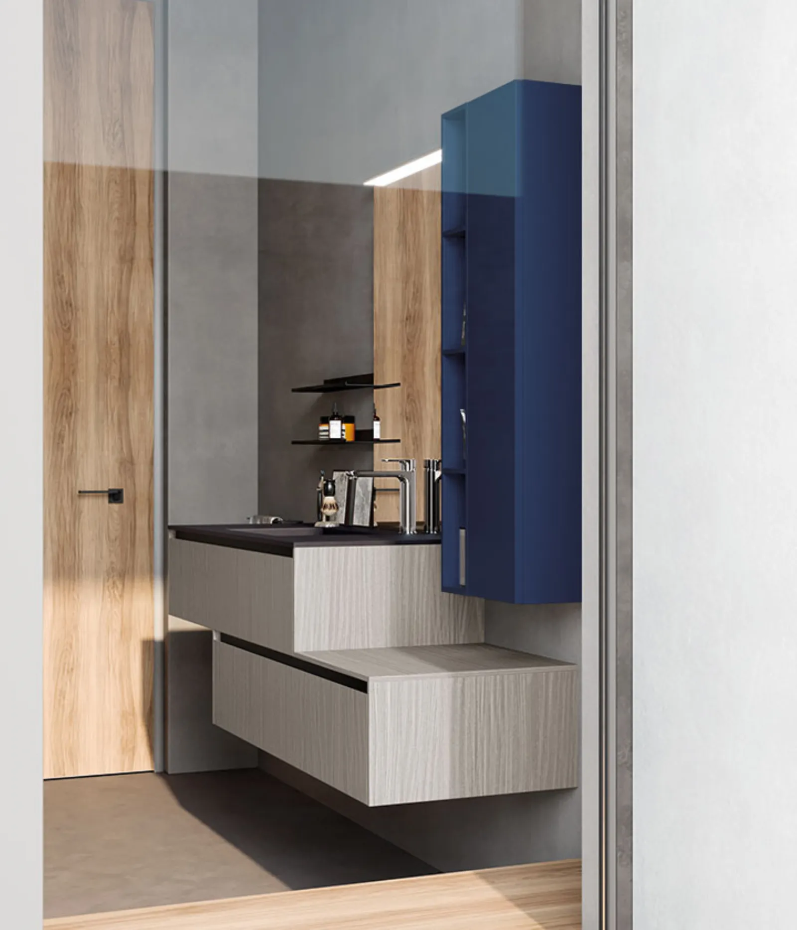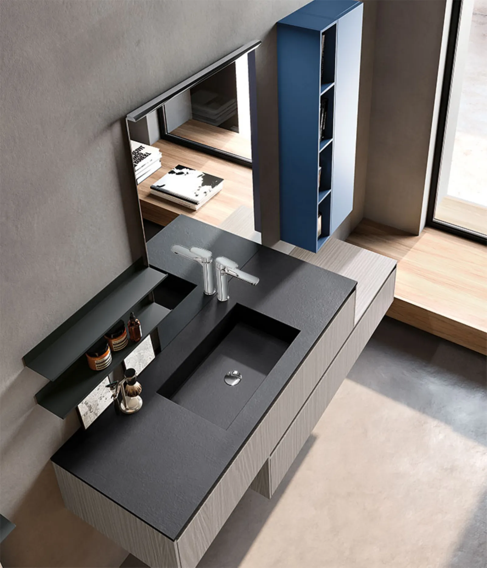 Skin grigio e blu Moby opaco. Top in Gres pietra di Savoia antracite con vasca integrata “GF”, specchio Filo con lampada Metro.