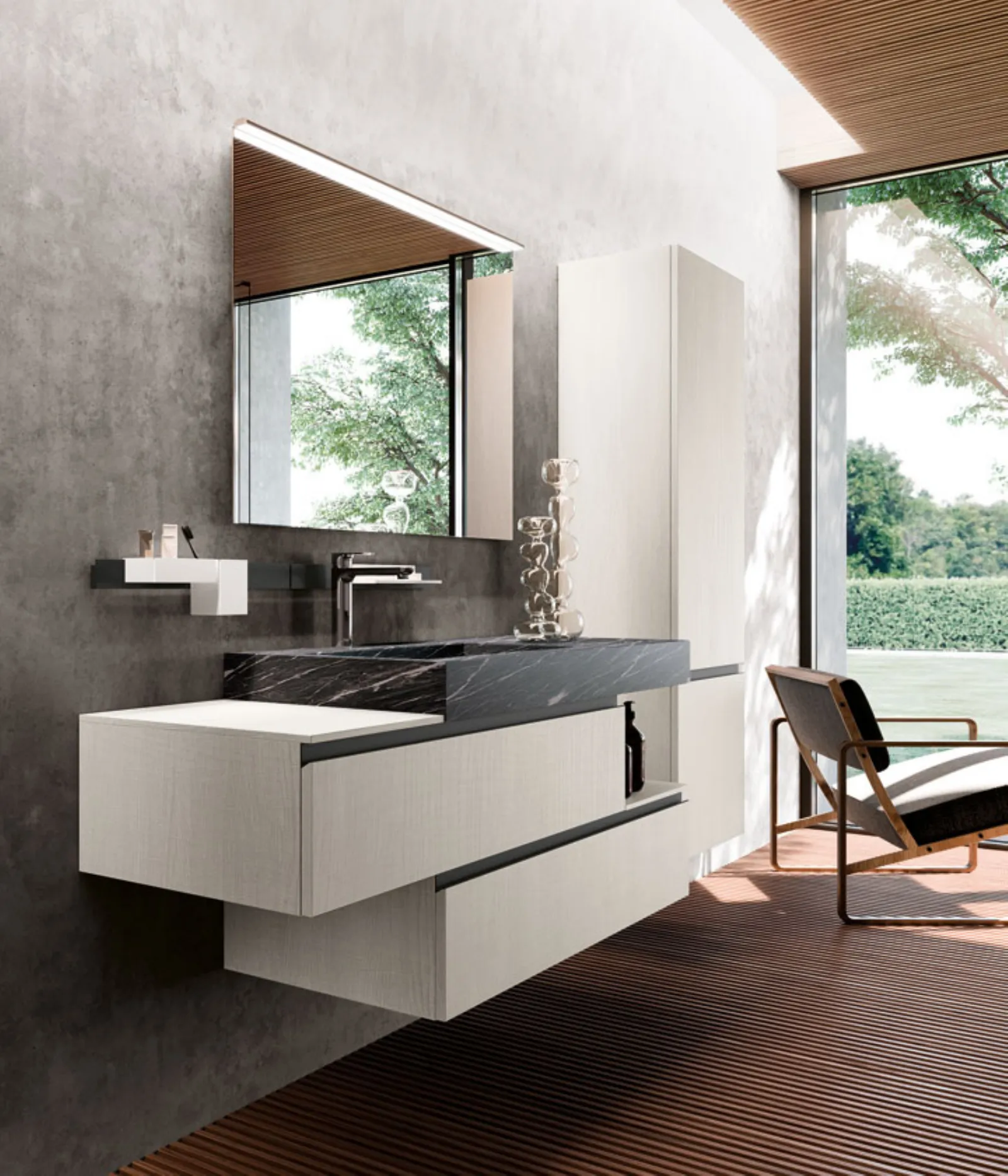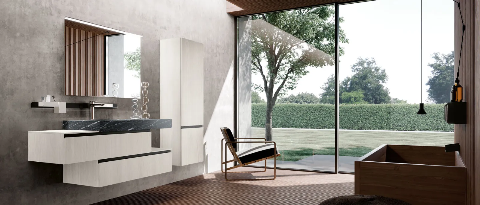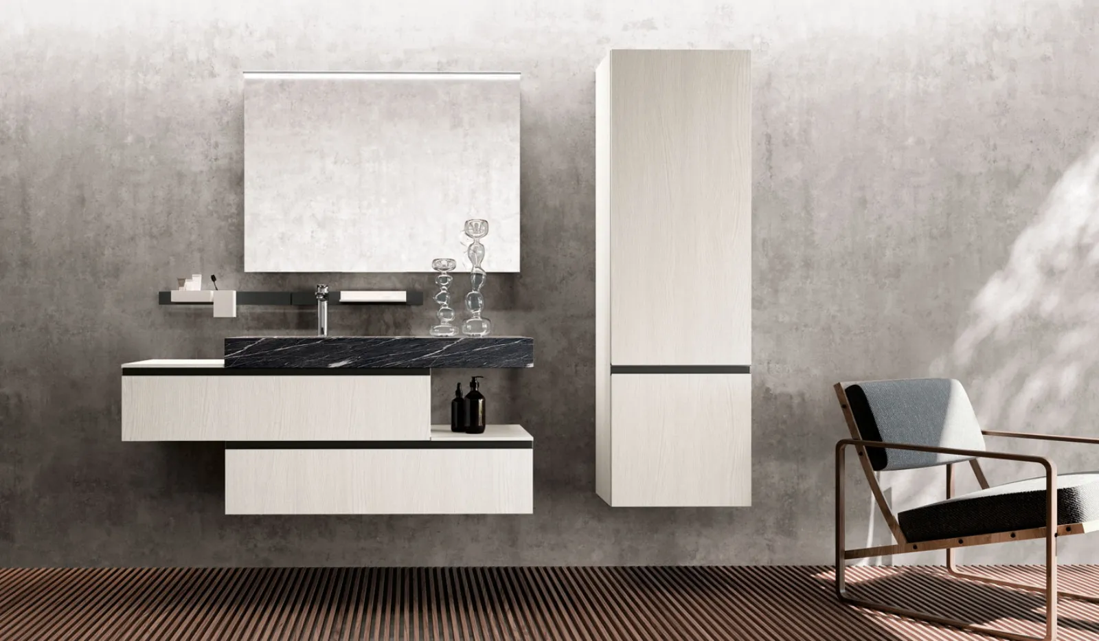 Skin Bianco con maniglia Titanio. Top hpl Calypso 435 sp. 10 cm con vasca integrata “HF”, specchio Filo con lampada Metro
