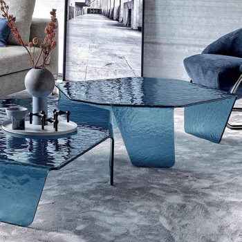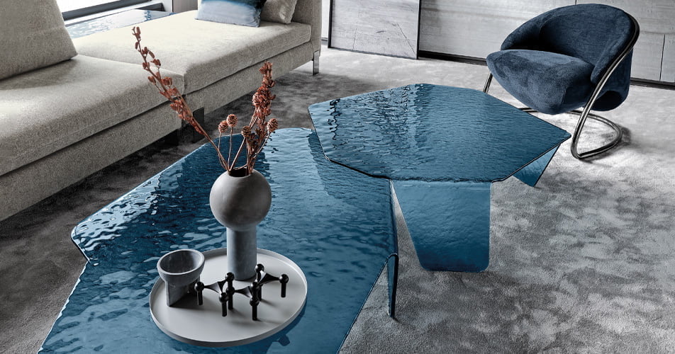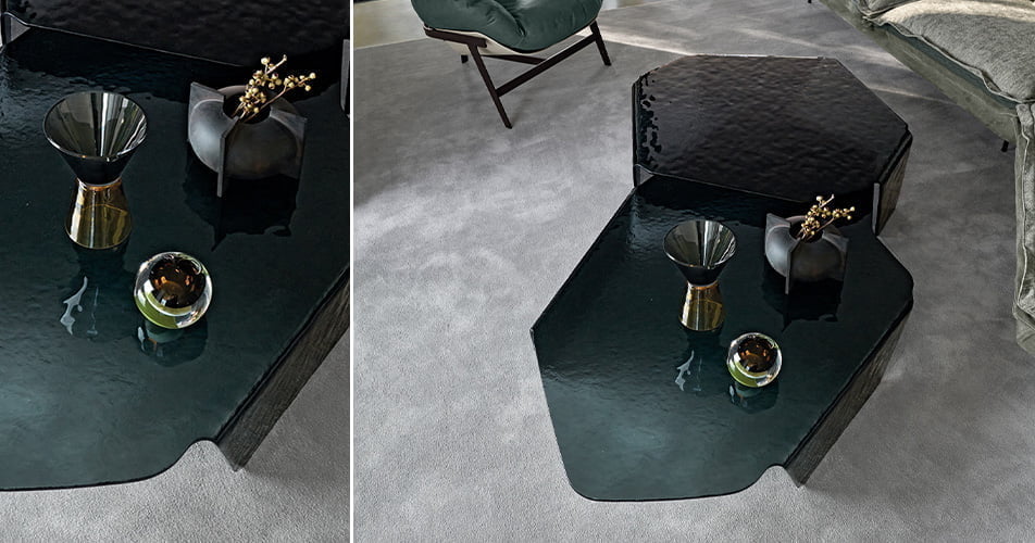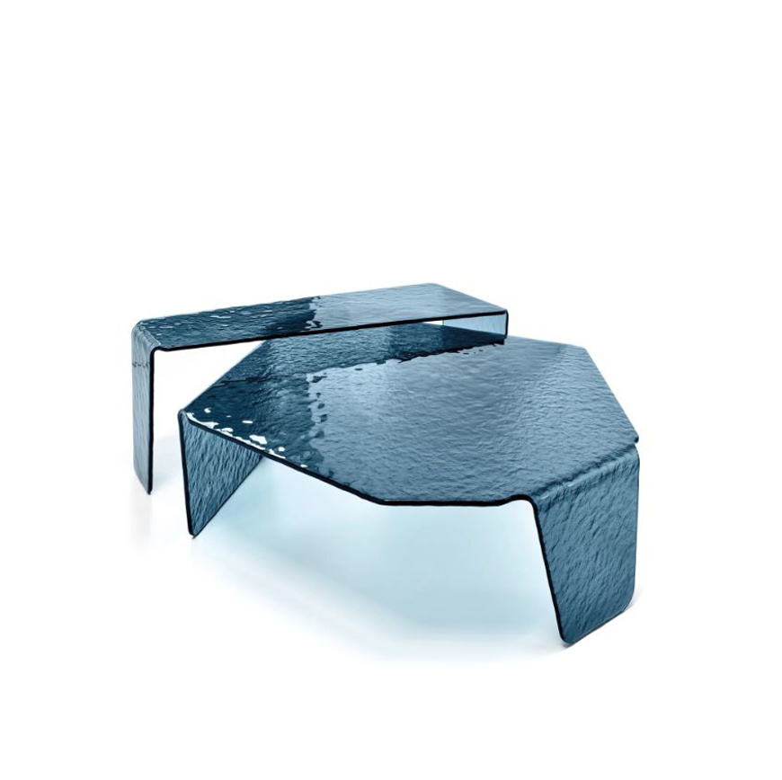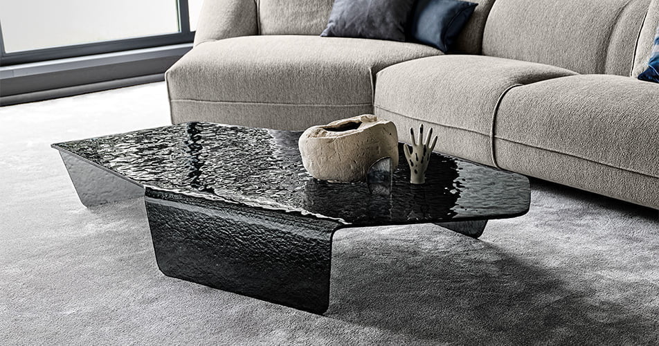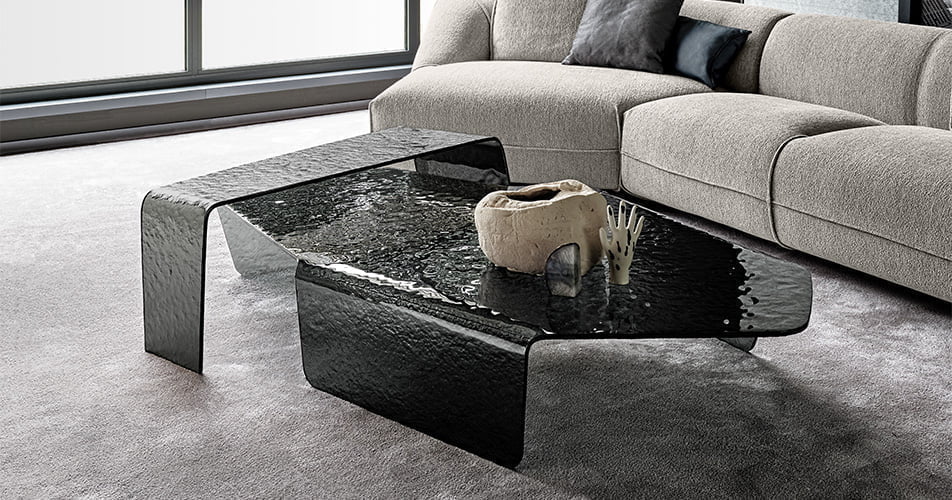 Realizzato in vetro curvato e martellato color fumé, il tavolino stupisce per le forme sinuose del piano che curva in tre punti strategici, abbracciando la struttura di sostegno. La speciale lavorazione del vetro dà vita a un gioco di luci che crea l'illusione di onde mosse dal vento.