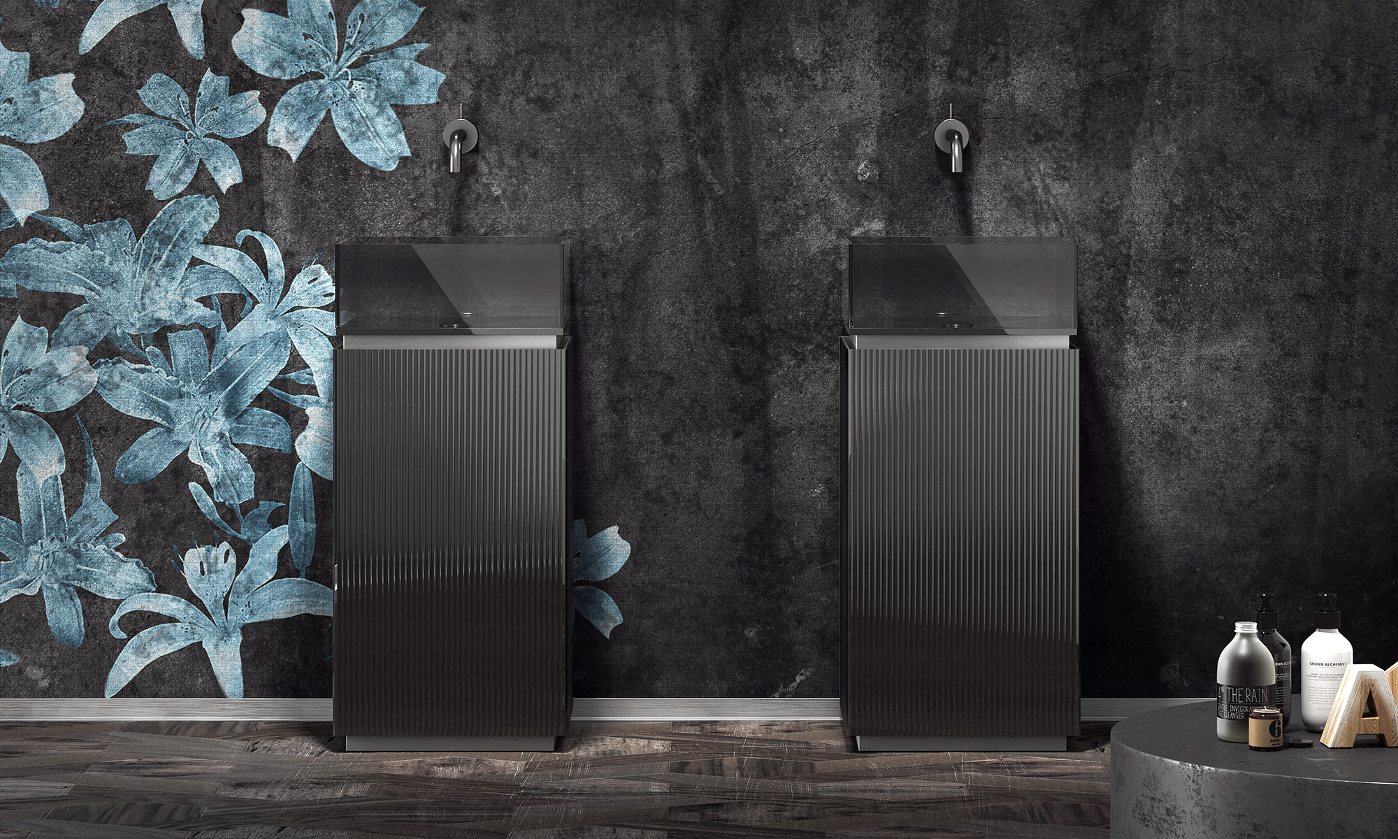 Sintesi tra rigore formale ed eleganza materica, la collezione Plissé dà vita ad una serie di totem lavabo contenitivi realizzati totalmente in vetro con particolari in metallo.