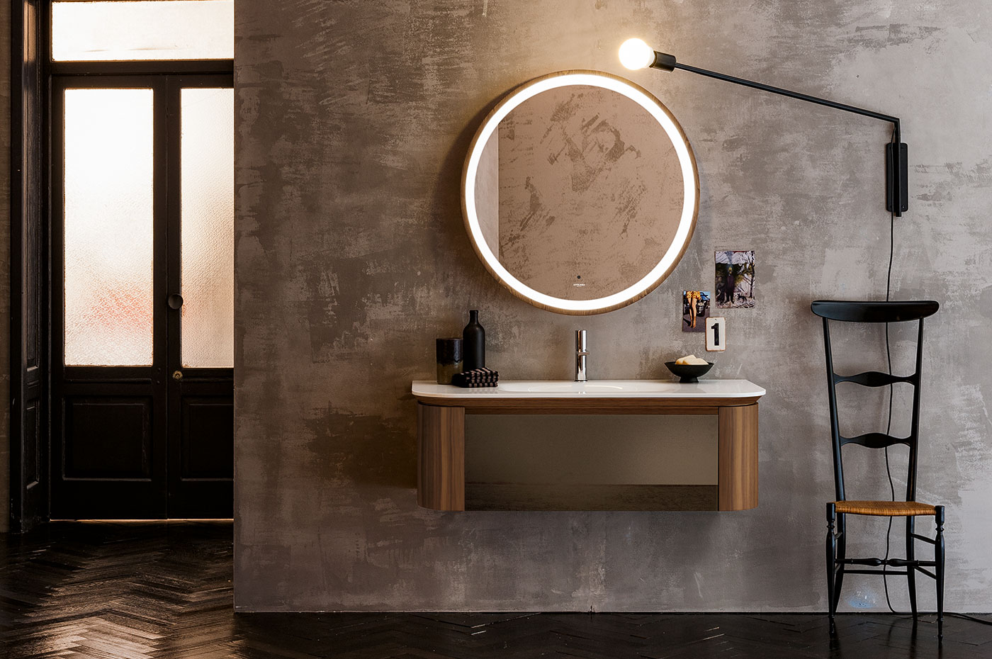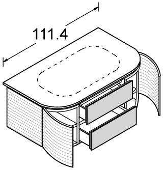 Portalavabo con struttura in nobilitato melaminico idro RAL7010 rivestita in FRASSINO laccato finitura Cotone, Canapa, China o NOCE CANALETTO NATURALE. Frontali cassetto/cestone in cristallo smaltato o decorato (Bianco assoluto 30/ specchio). Apertura/ chiusura manuale.