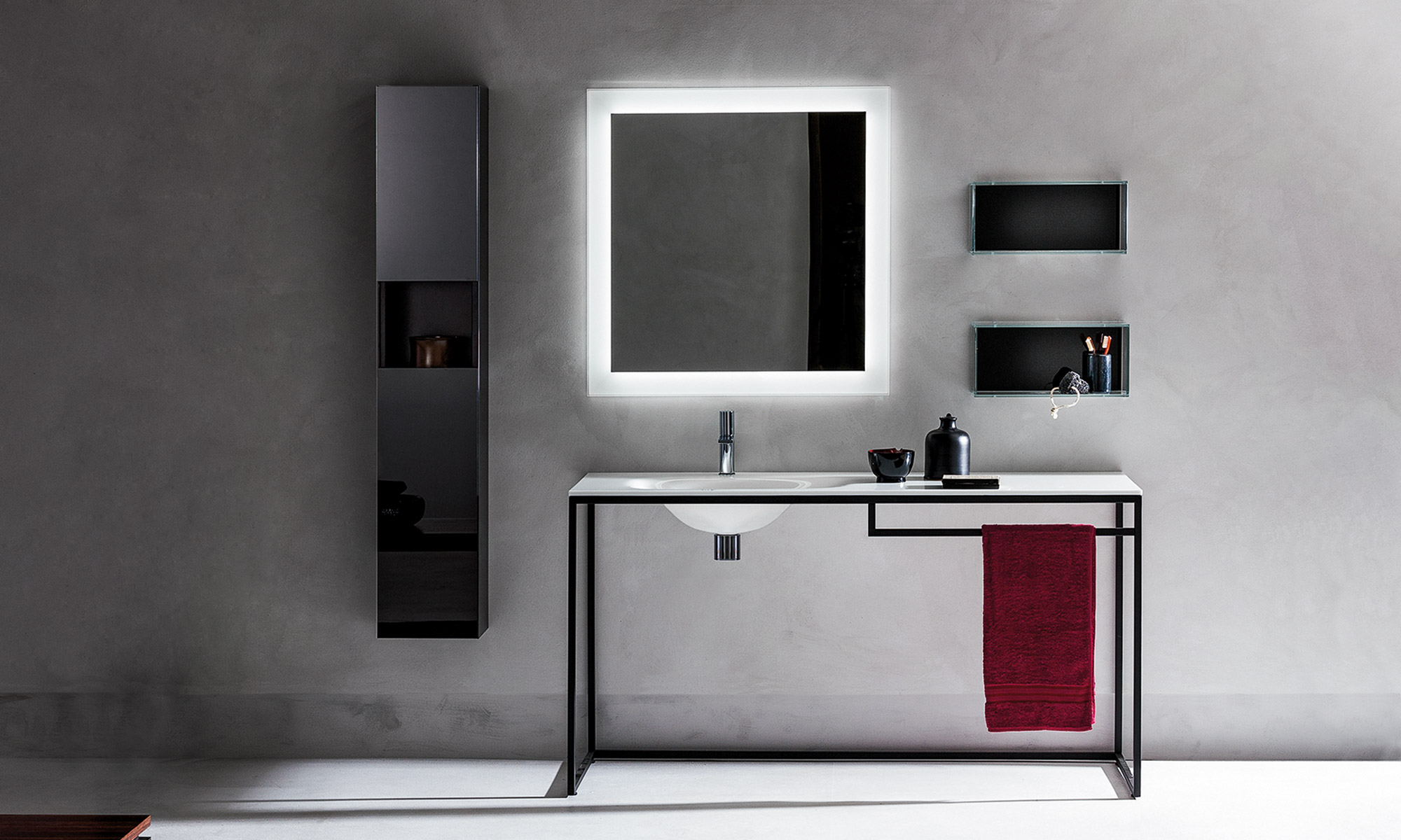 Struttura lineare e forme pulite. La collezione in acciaio verniciato nero opaco si combina perfettamente con la fusione del basintop di serie proposto in Opalite bianca o nera. Modularità e accessori abbinati, completano questa linea dal gusto contemporaneo.
