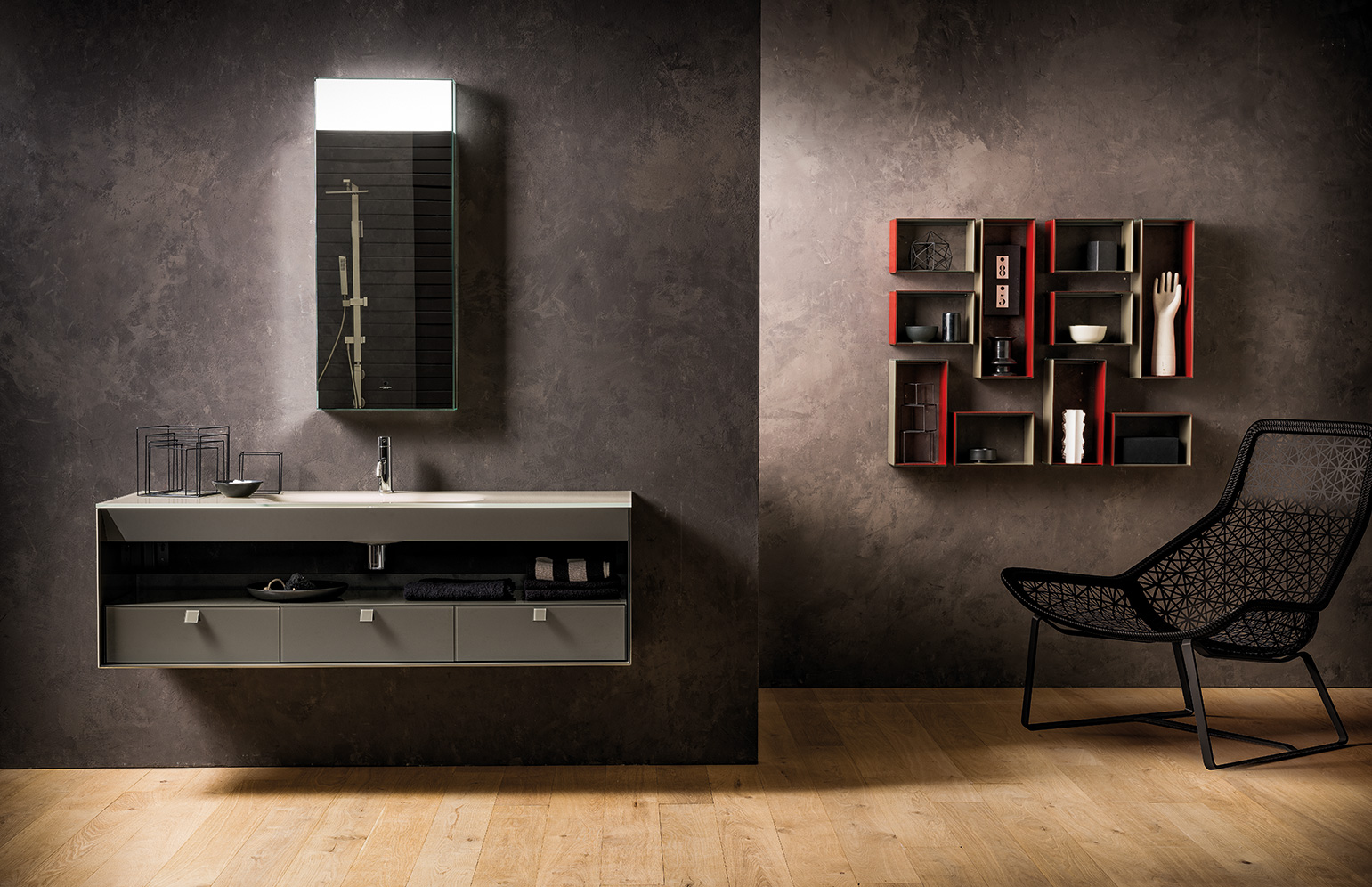 La razionalità del disegno del monoblocco è sdrammatizzata sia dalla componibilità interna data dai cassetti e dai vani a giorno, posizionabili liberamente all’interno dello spazio, sia dalla possibilità di abbinare colori diversi, grazie a Dualite.