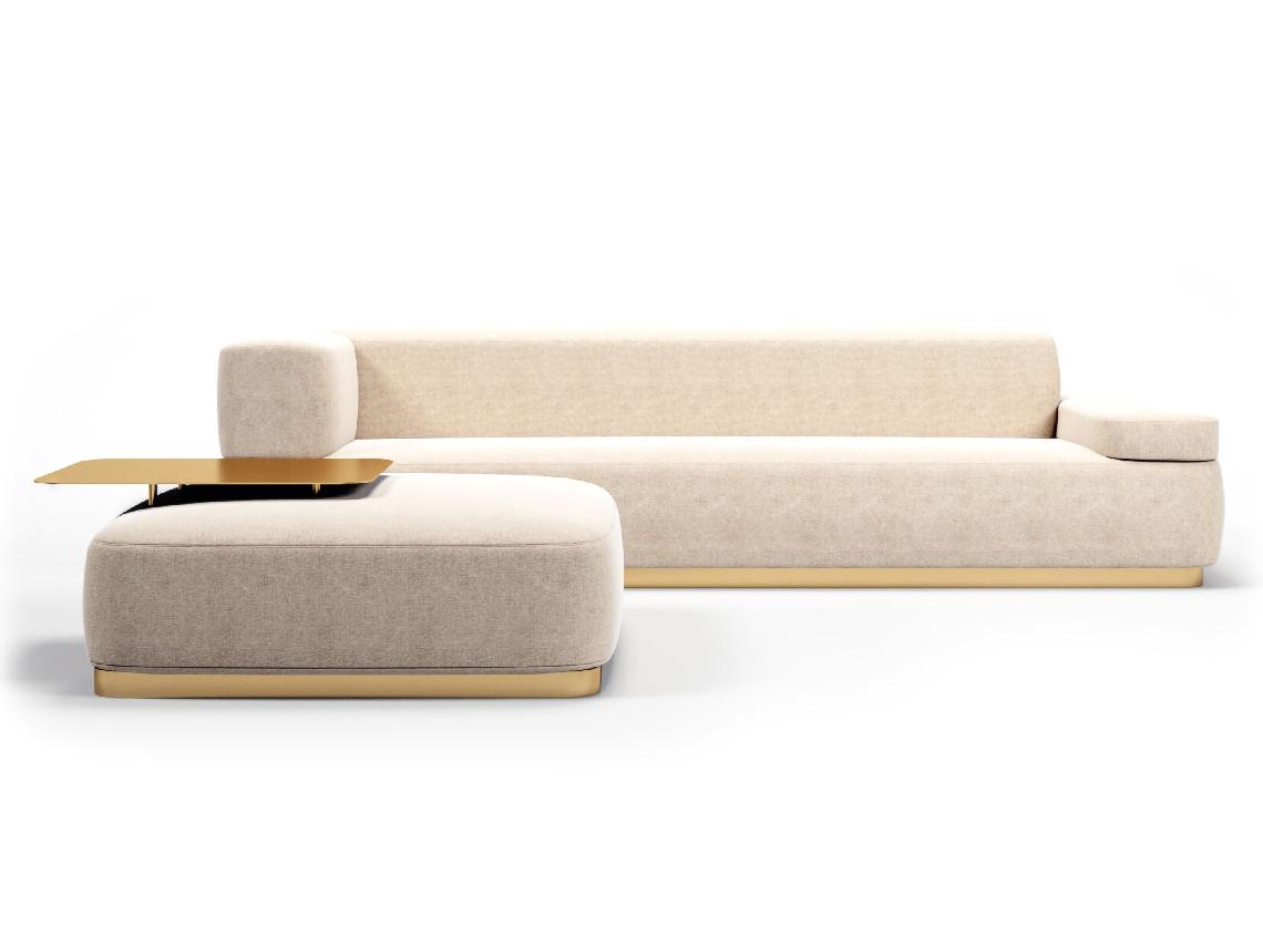 Pouf with tray, cm 116x100x46h Upholstery in Nabuk col. Sand, metal base & tray in light gold sateen