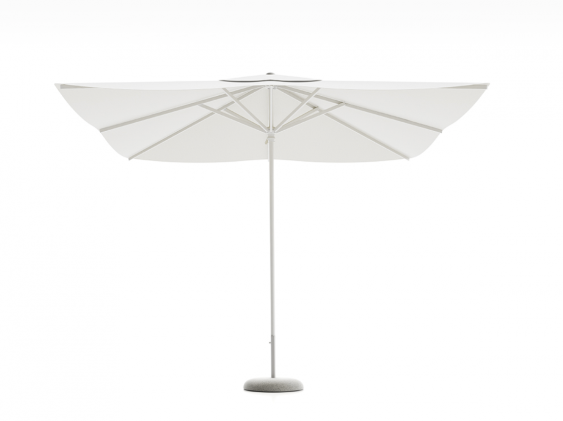 Telaio in alluminio verniciato grigio o bianco. Tessuto acrilico gr. 320 in colore bianco o ecrù. Completo di soffietto antivento, apertura a carrucola, corone in resina.