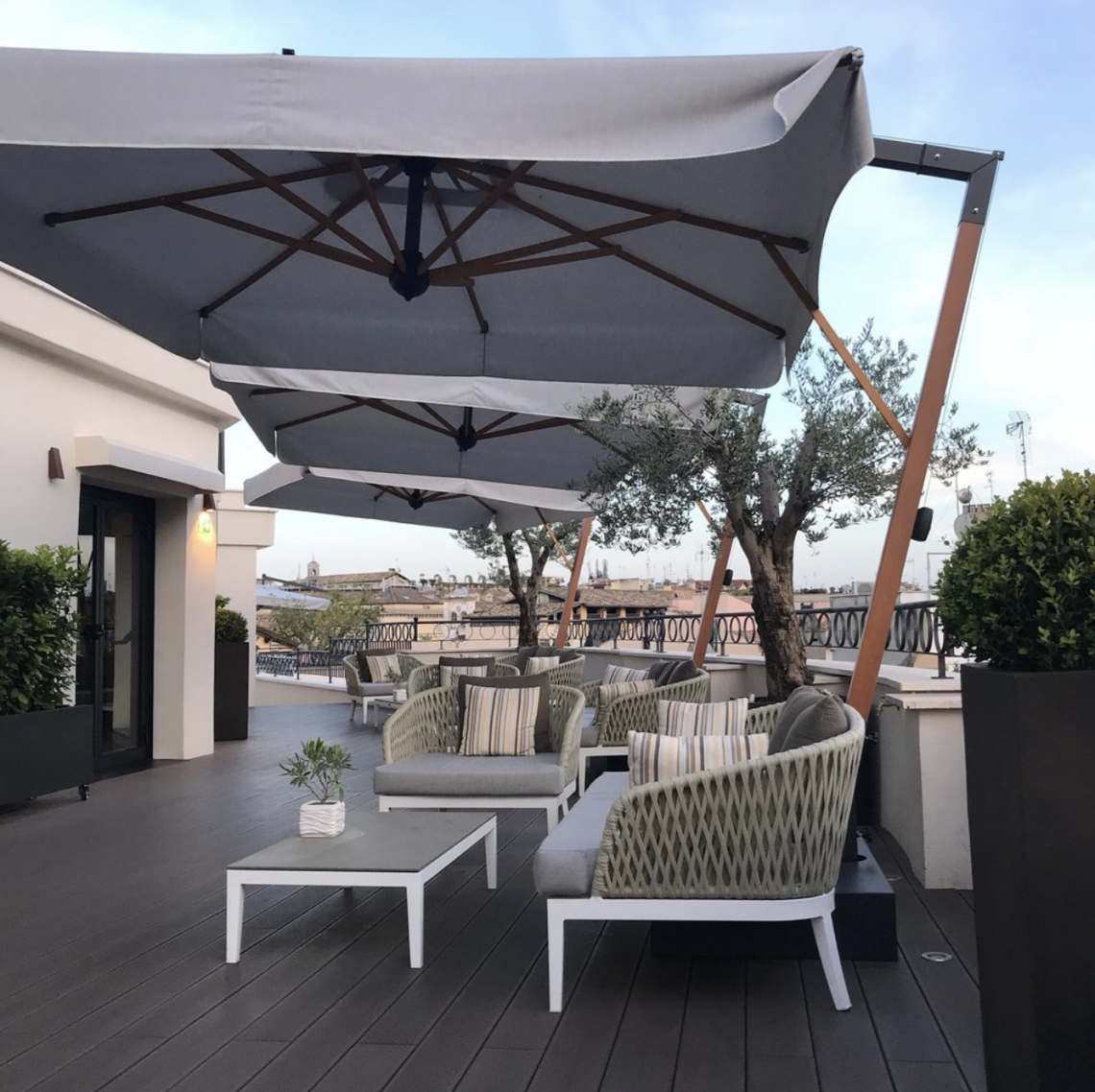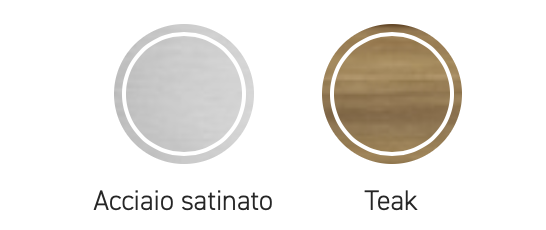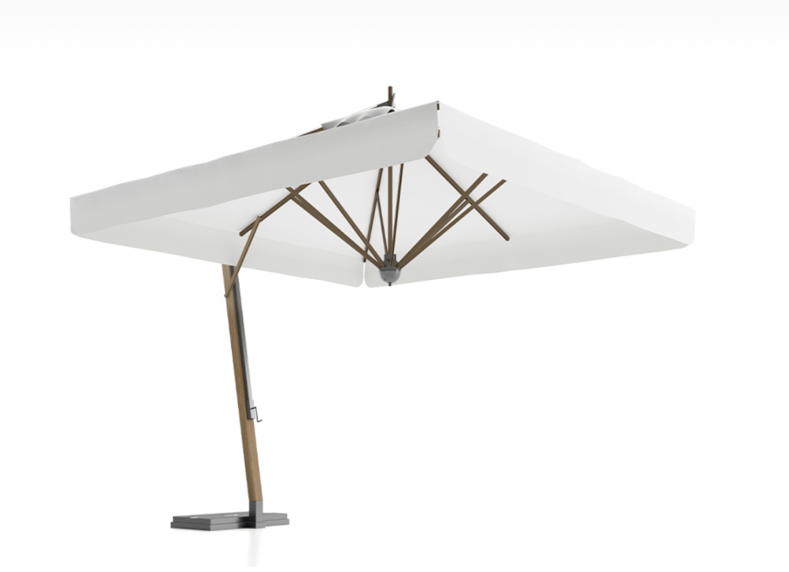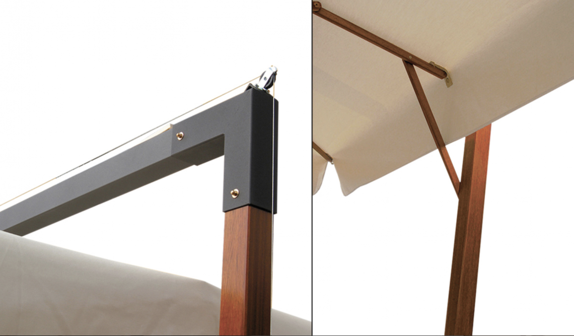 Palo verticale in legno di iroko. Palo orizzontale in alluminio grigio. Componenti in acciaio zincato e verniciato. Tessuto acrilico gr. 320 in colore bianco.