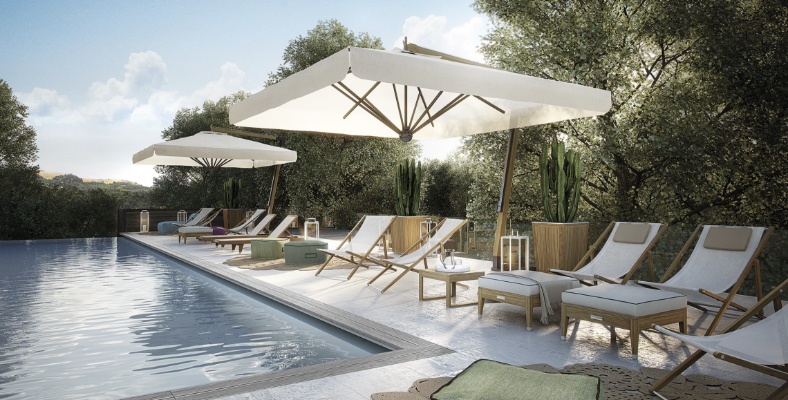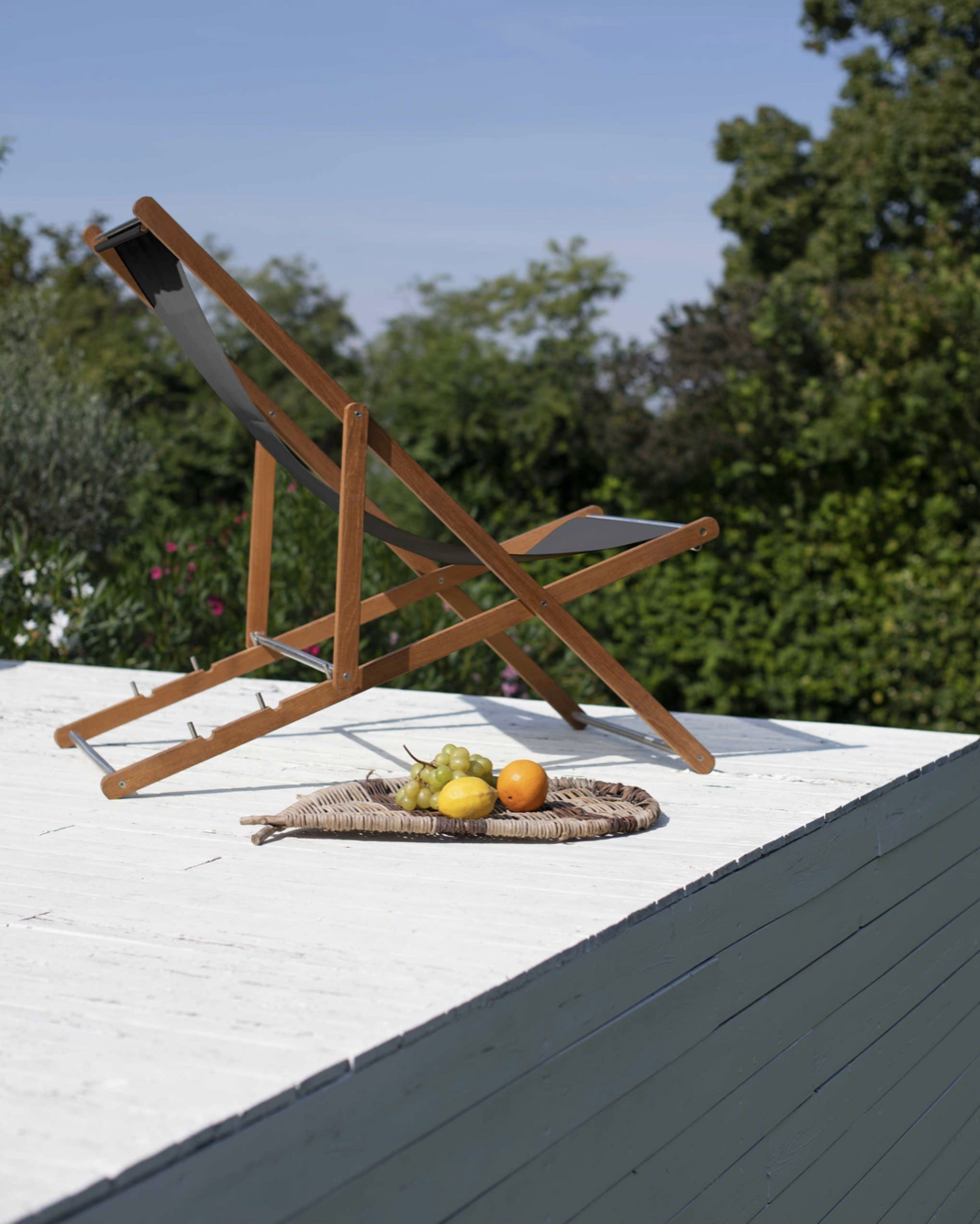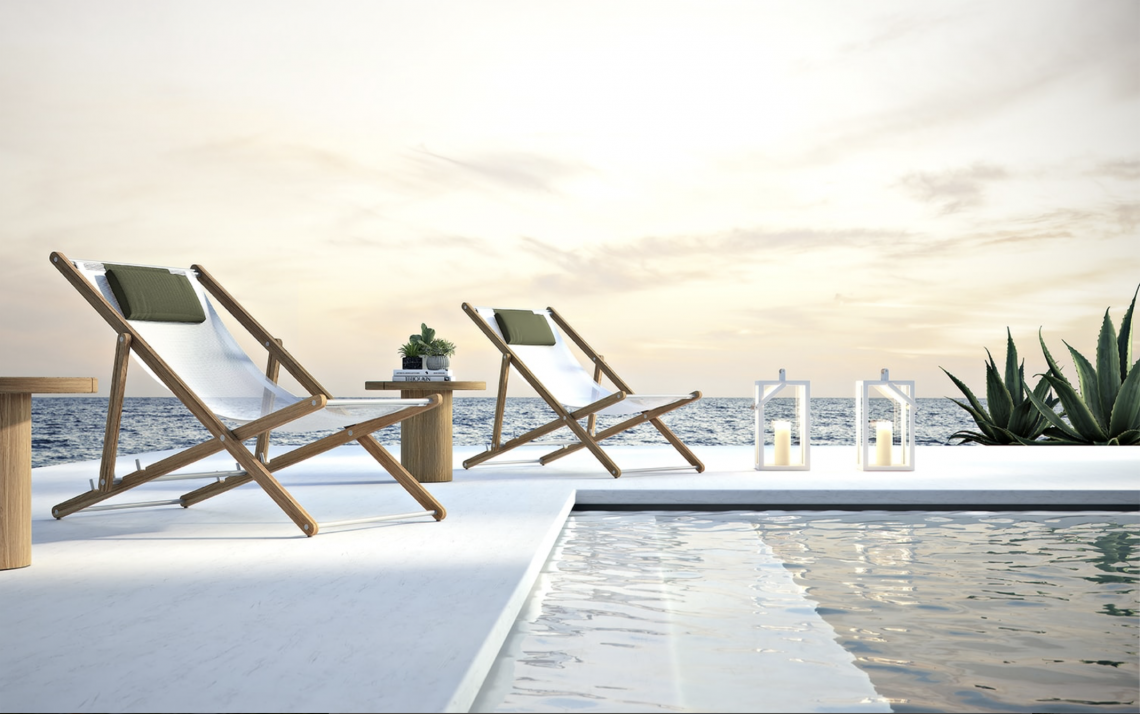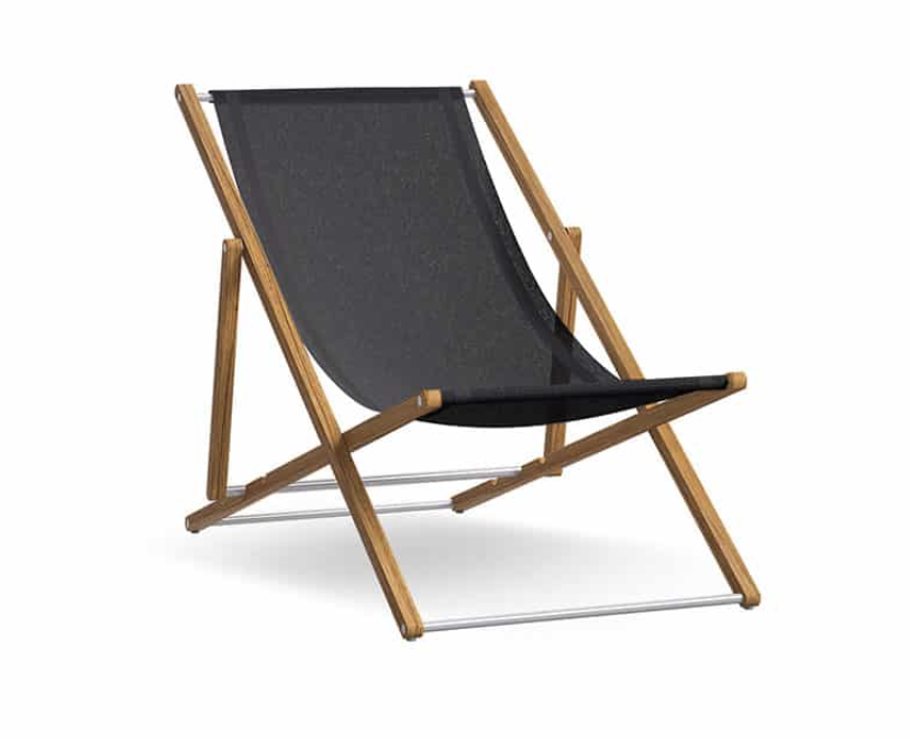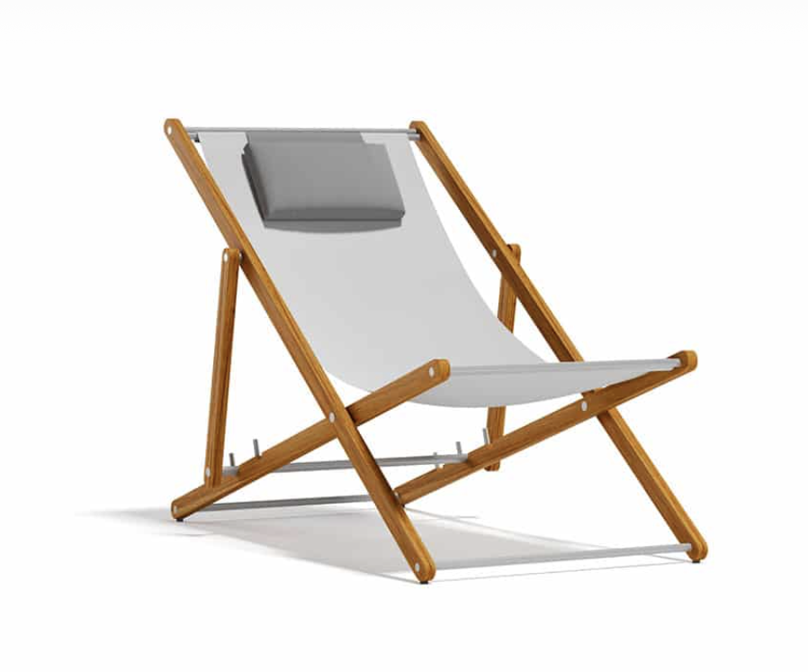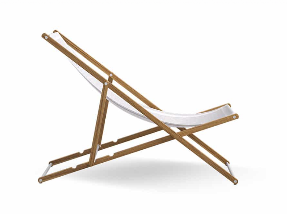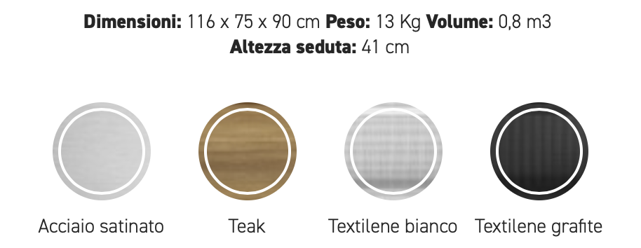 Strutture in TEAK massiccio Asiatico e dettagli in acciaio satinato. Seduta in tessuto termosaldato per esterni textilene bianco o nero.