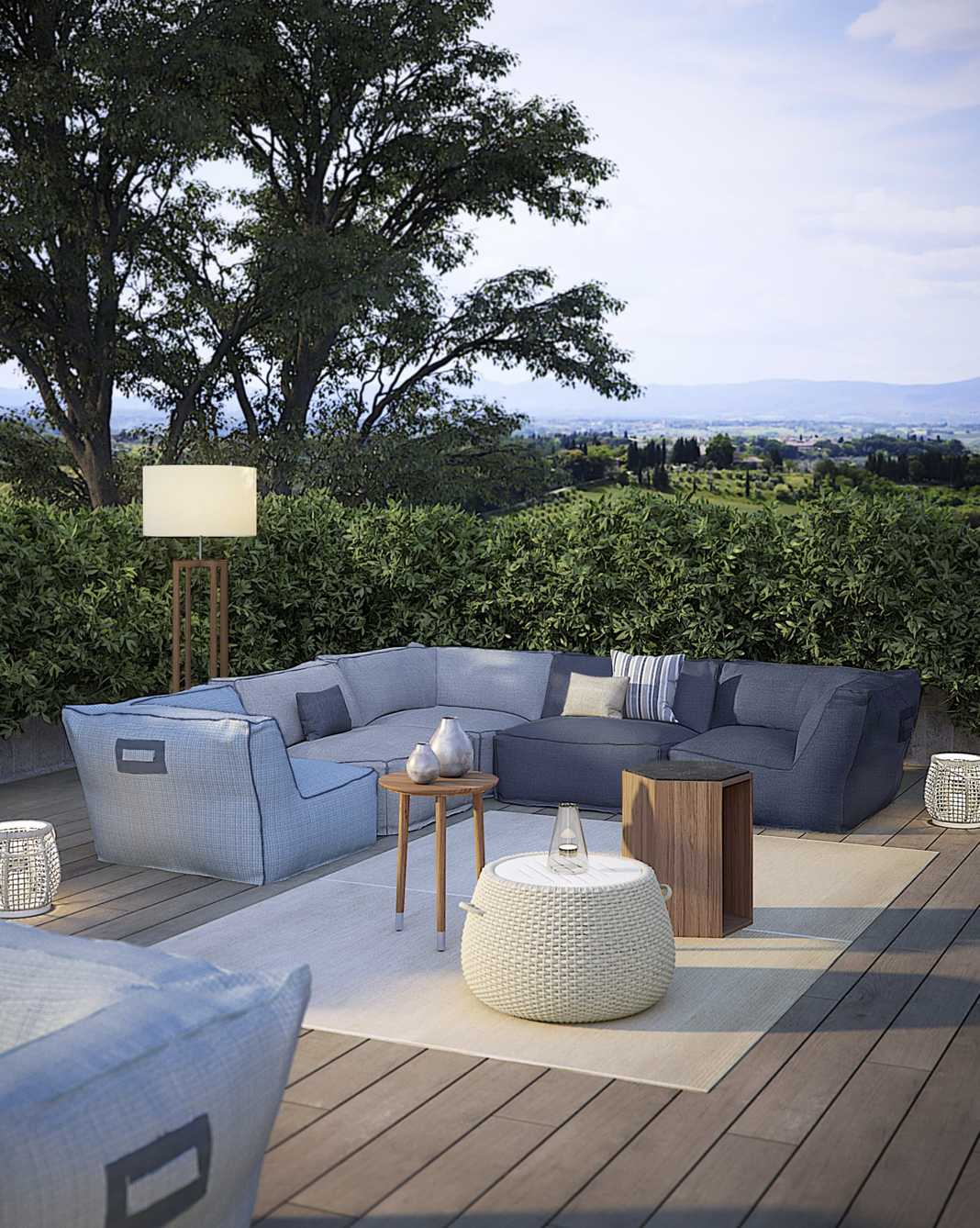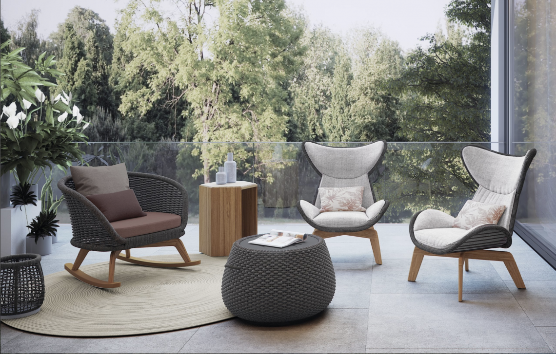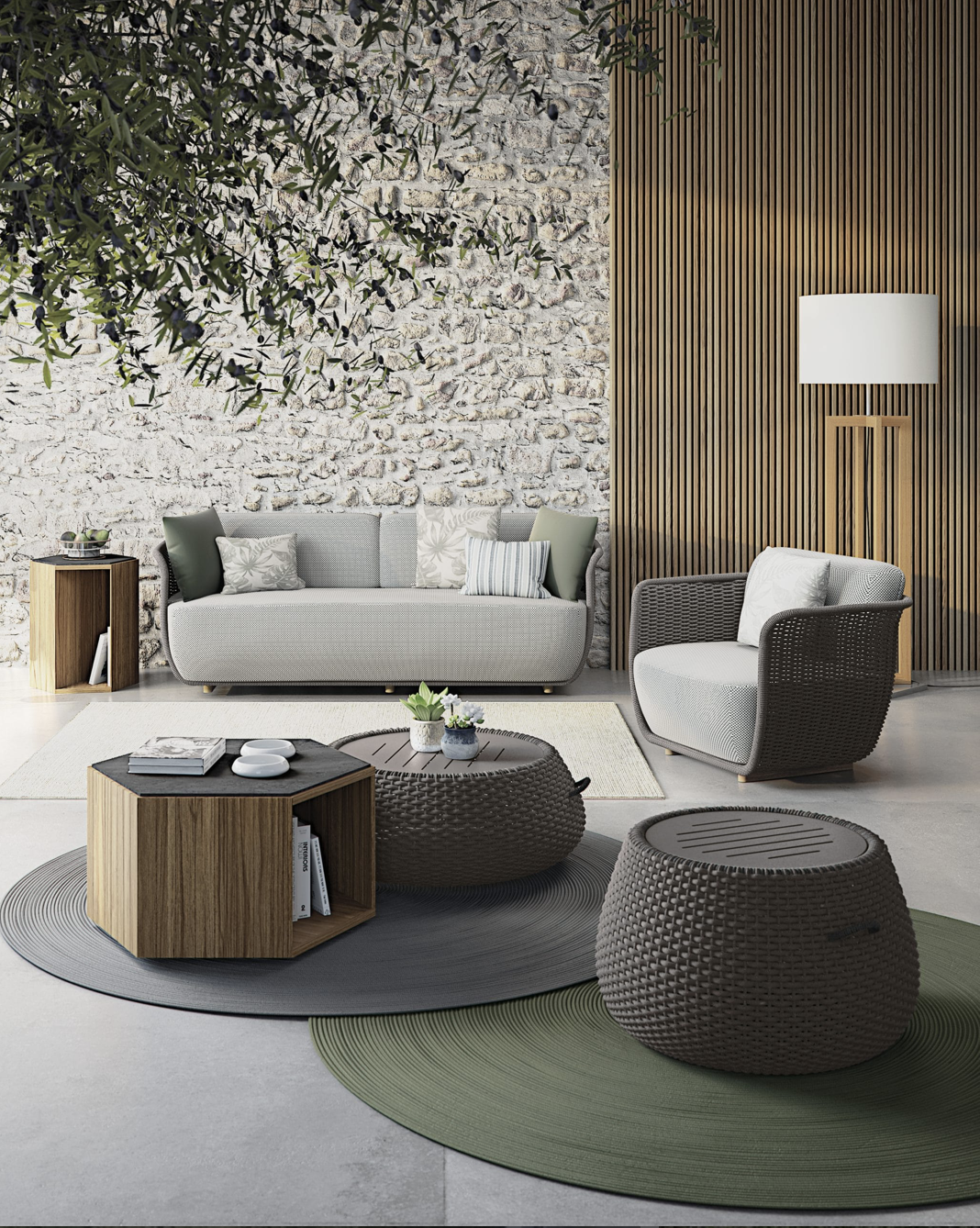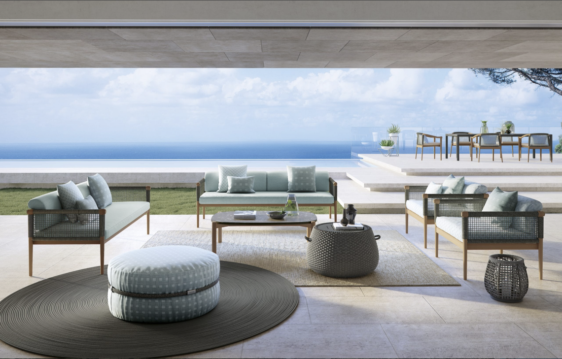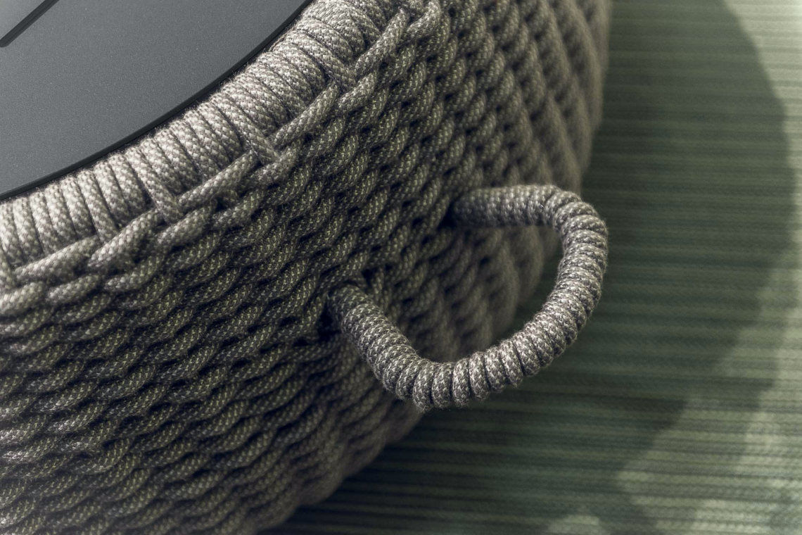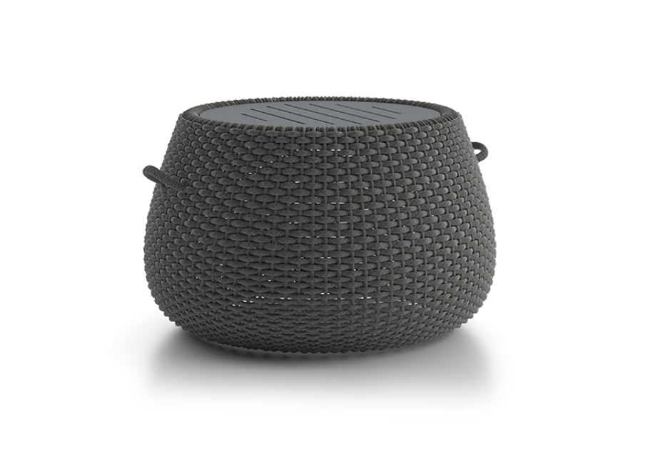 Tavolini con una struttura in alluminio abbinata a corde intrecciate a mano in fibra acrilica di Teflon, a sezione tonda, resistenti all’acqua e di facile pulizia. Il materiale presenta un appeal morbido e raffinato simile ad intrecci tessili. Si caratterizza per la sua resistenza ai raggi UV e per la velocità di asciugatura.