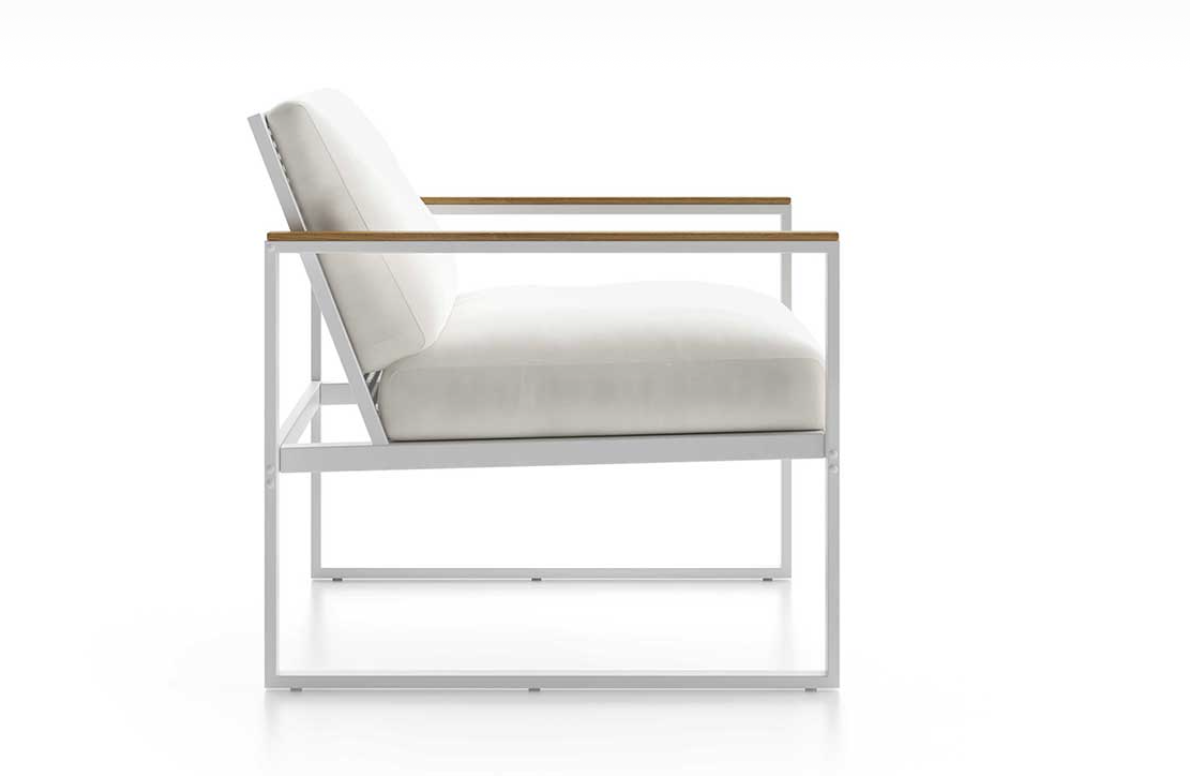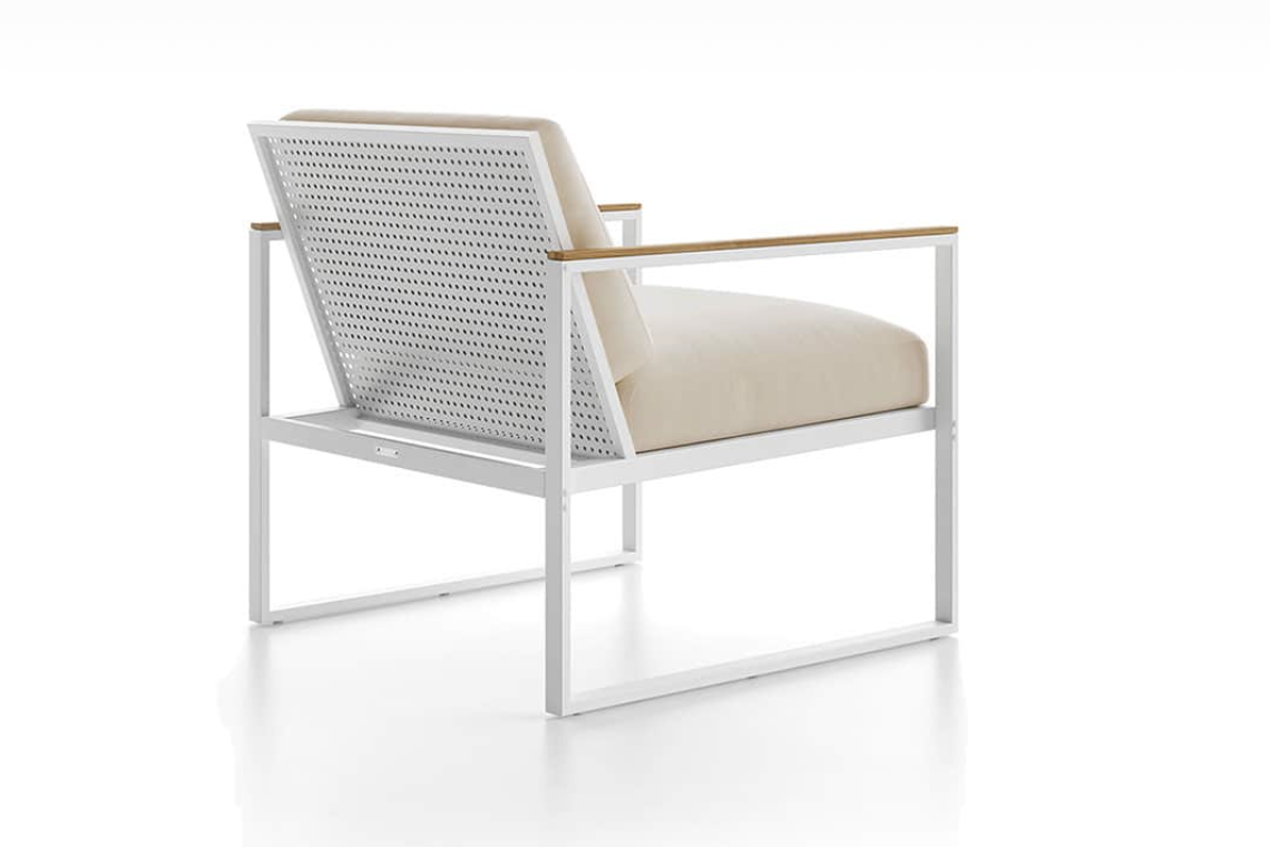Le facce del cubo evolvono in braccioli rivestiti da dettagli in teak e schienali caratterizzati da lamiere forate.