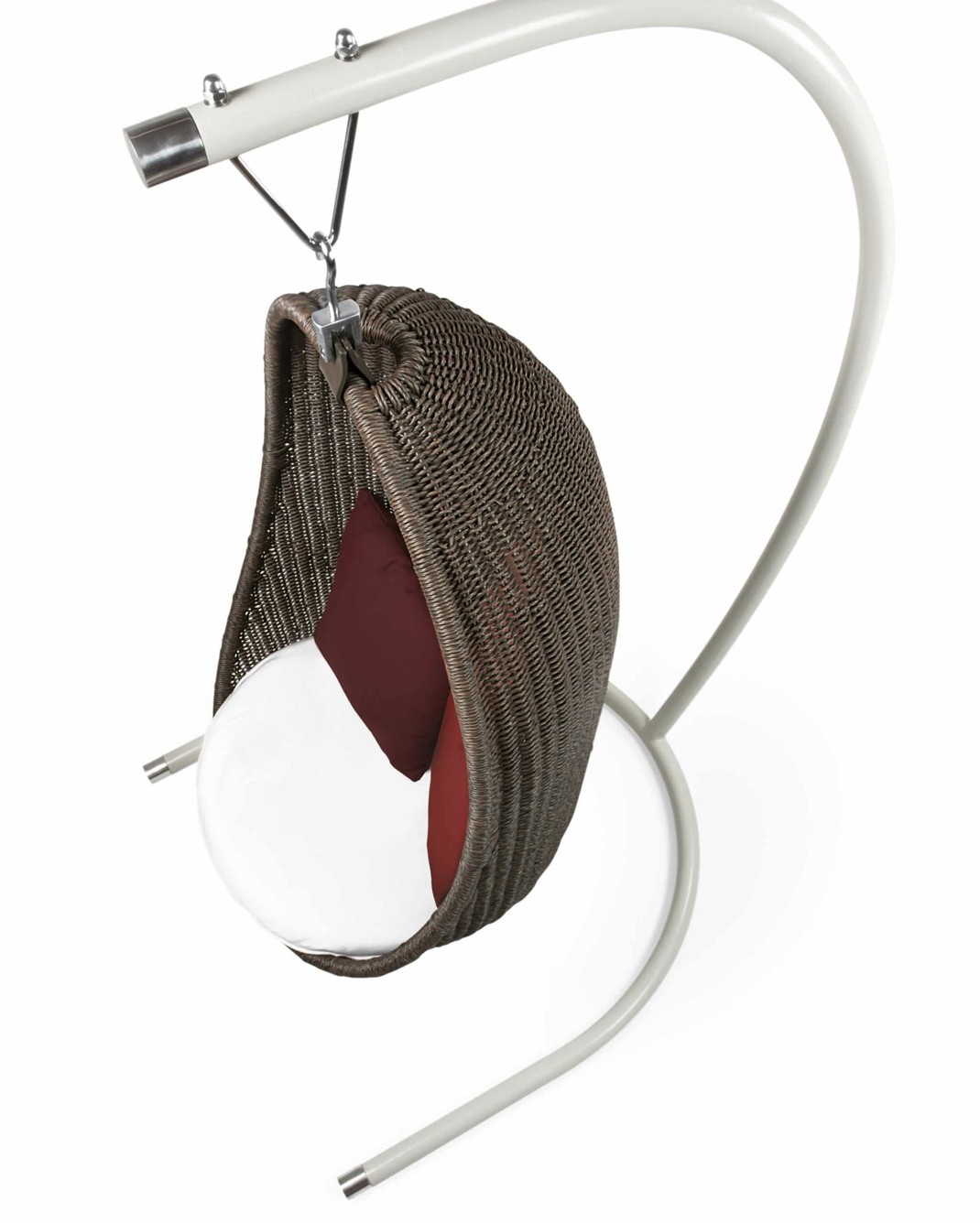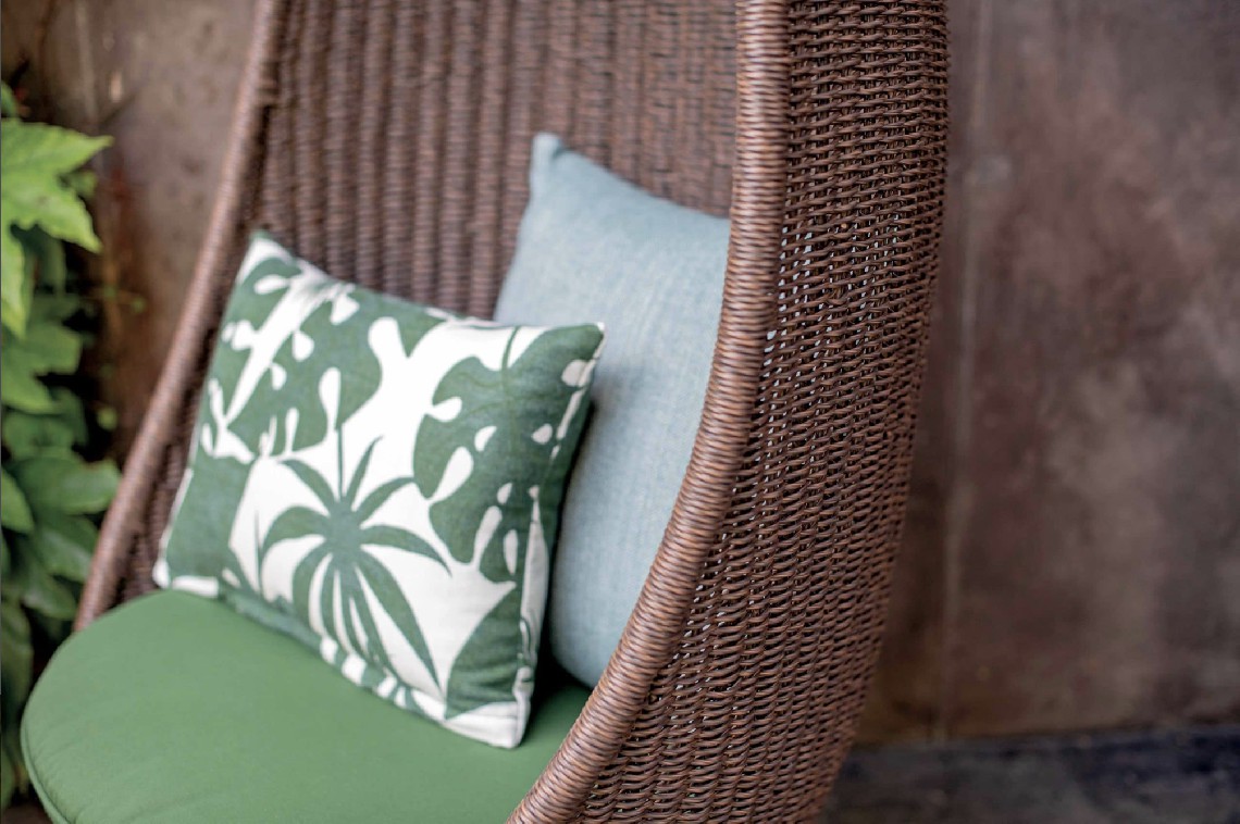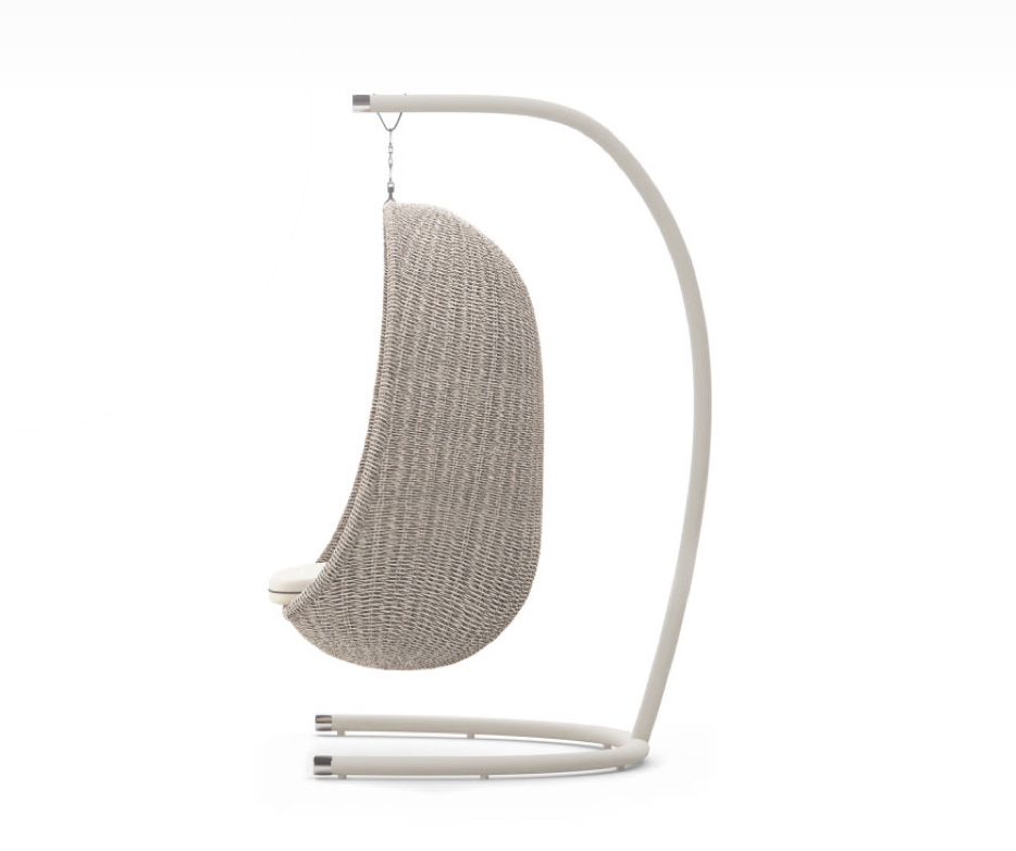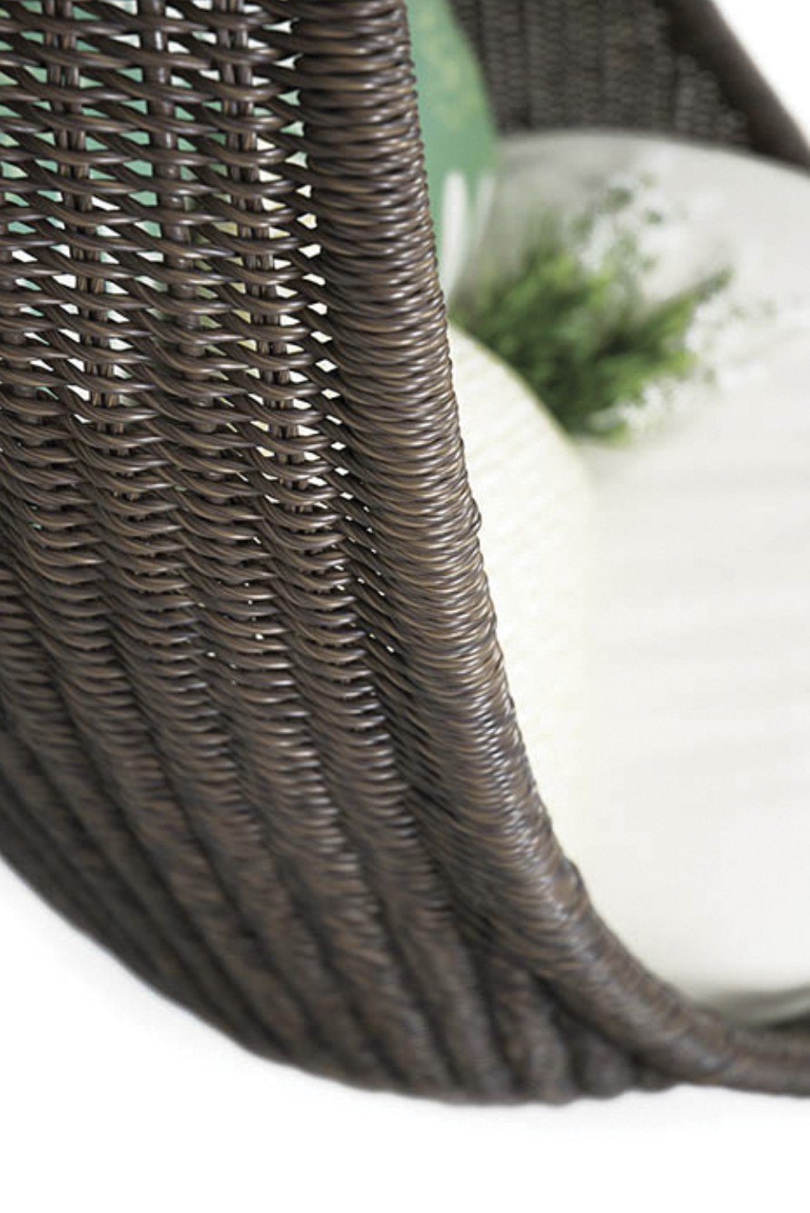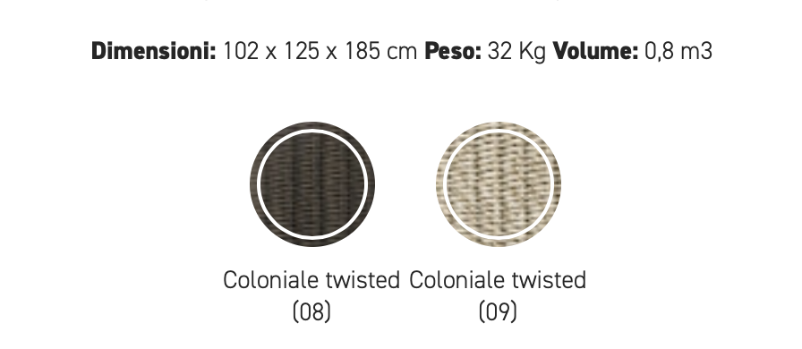 Strutture in alluminio verniciato epossidico per esterni. Intreccio in estruso di polietilene solidificato ad acqua, intrecciato a mano.