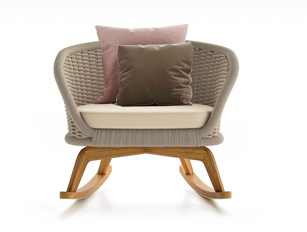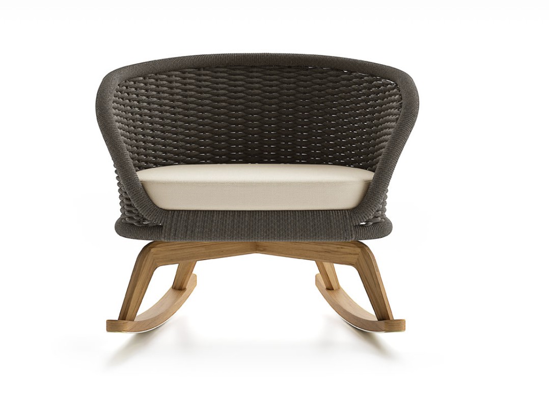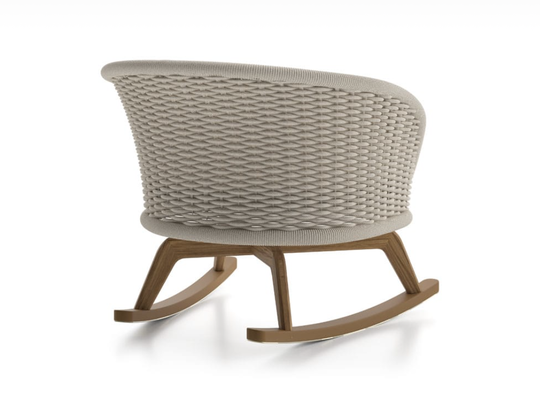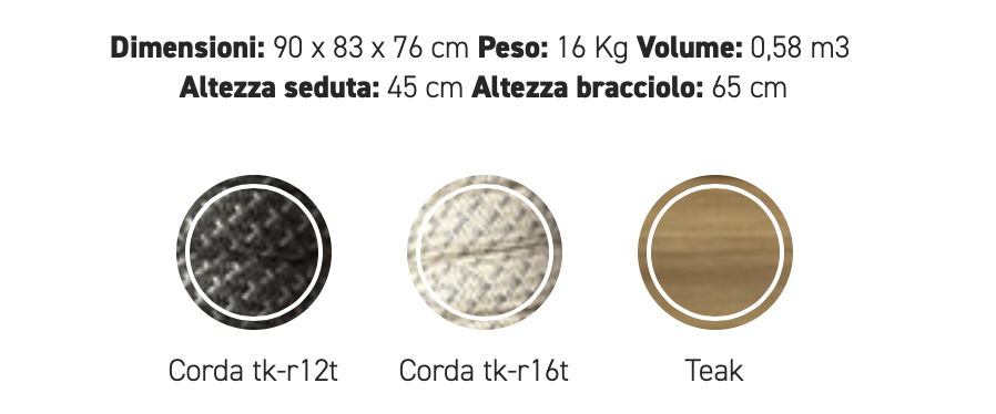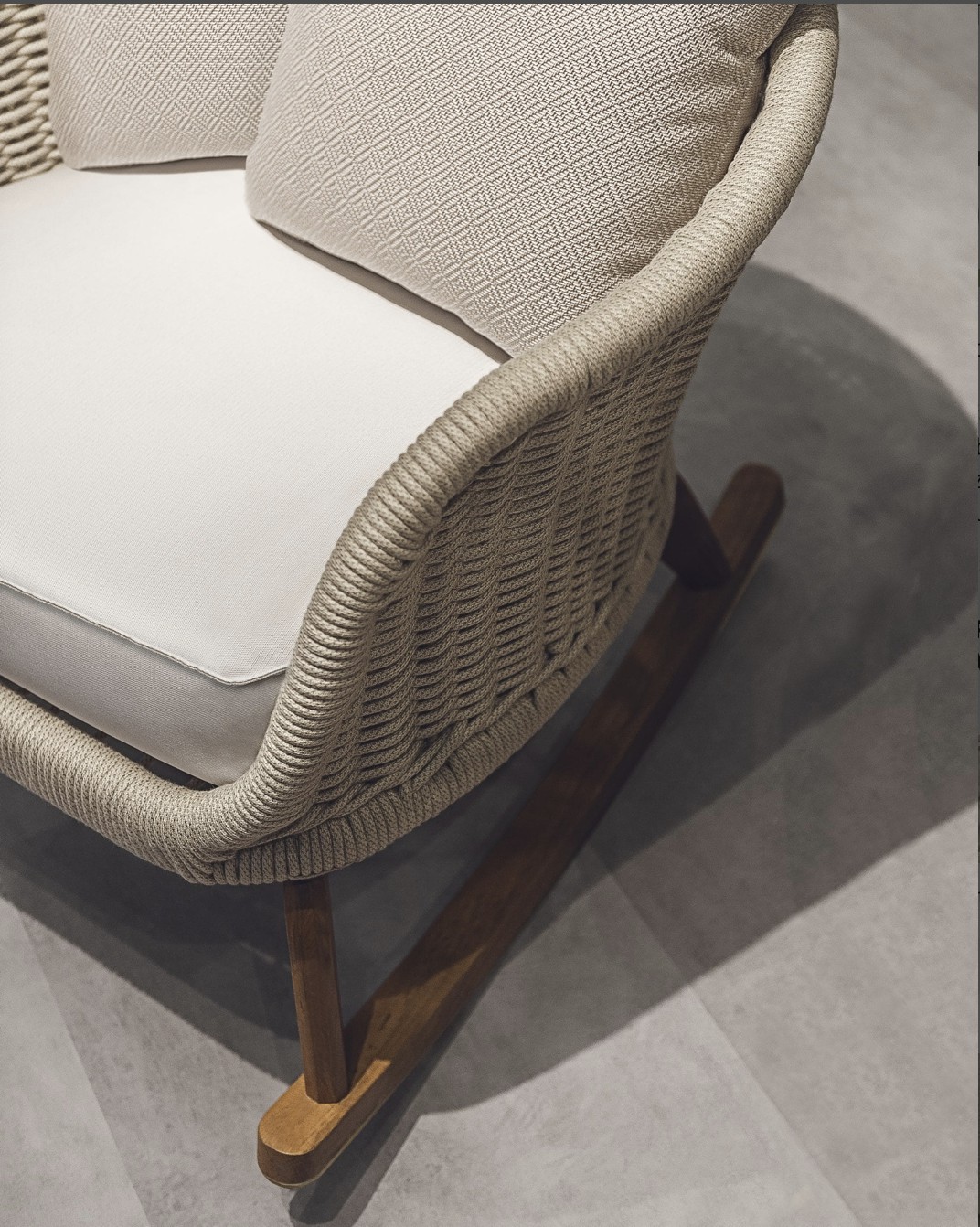 Poltrona con base in teak abbinata a corde intrecciate a mano in fibra acrilica di Teflon, a sezione tonda, resistenti all’acqua e di facile pulizia. Il materiale presenta un appeal morbido e raffinato simile ad intrecci tessili. Si caratterizza per la sua resistenza ai raggi UV e per la velocità di asciugatura.