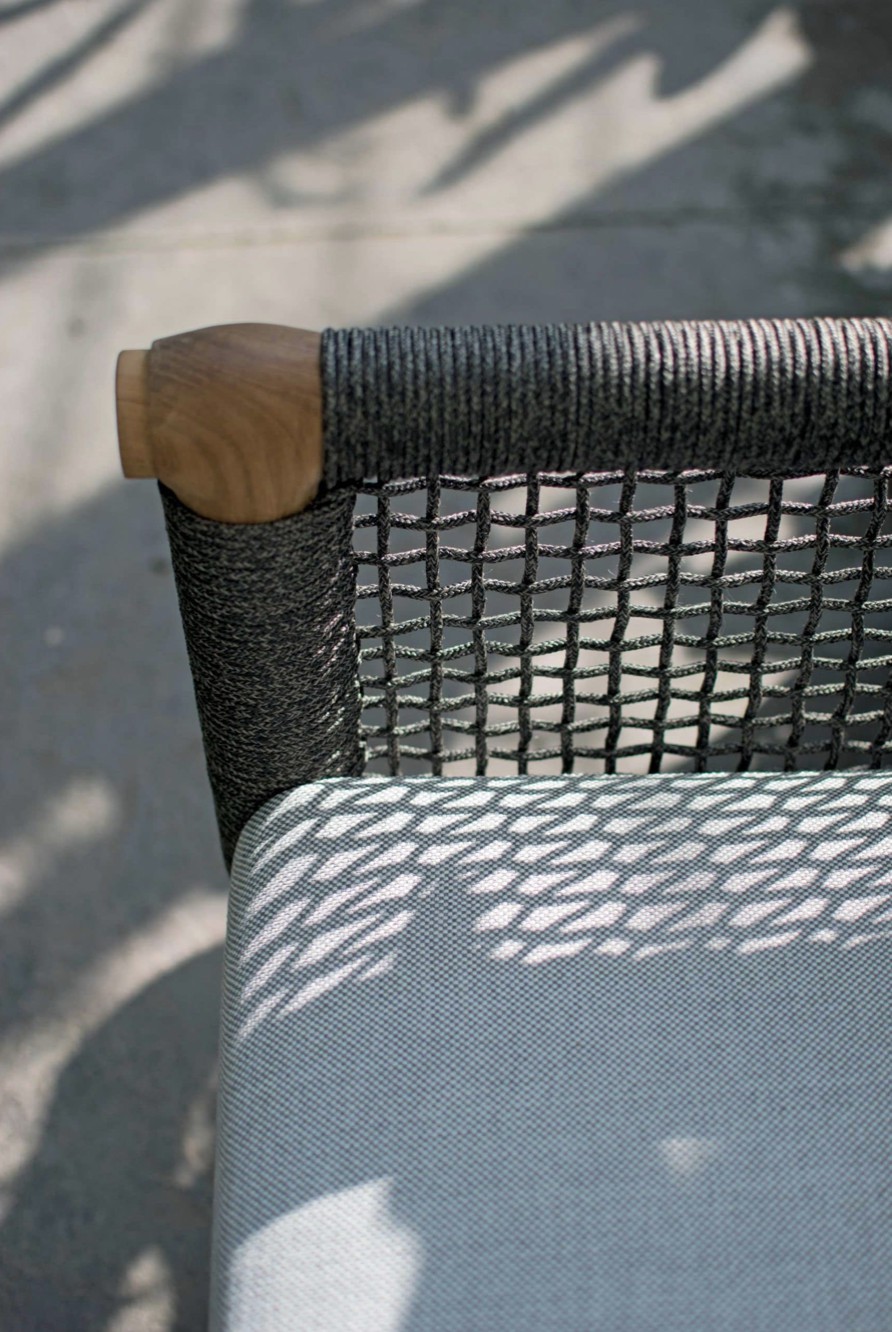 Design pulito e minimale descritto in una struttura completamente in teak intrecciata da una corda rotonda che crea una maglia morbida e di forte tenuta. Un nido accogliente diventa spazio di conversazione e lettura.