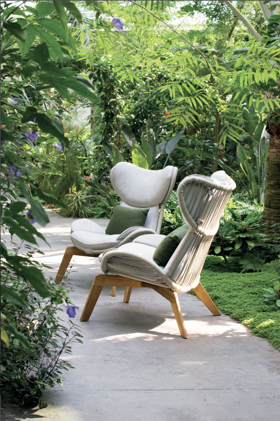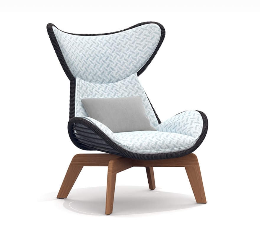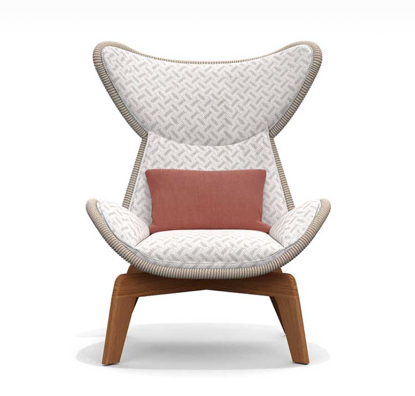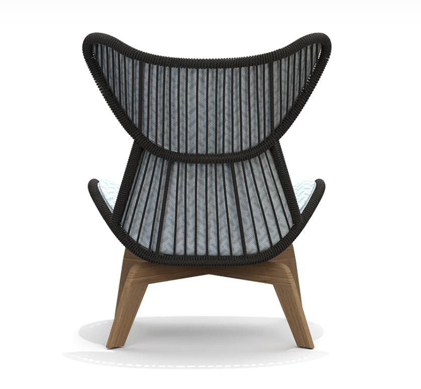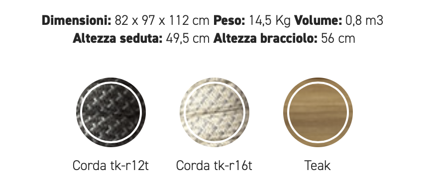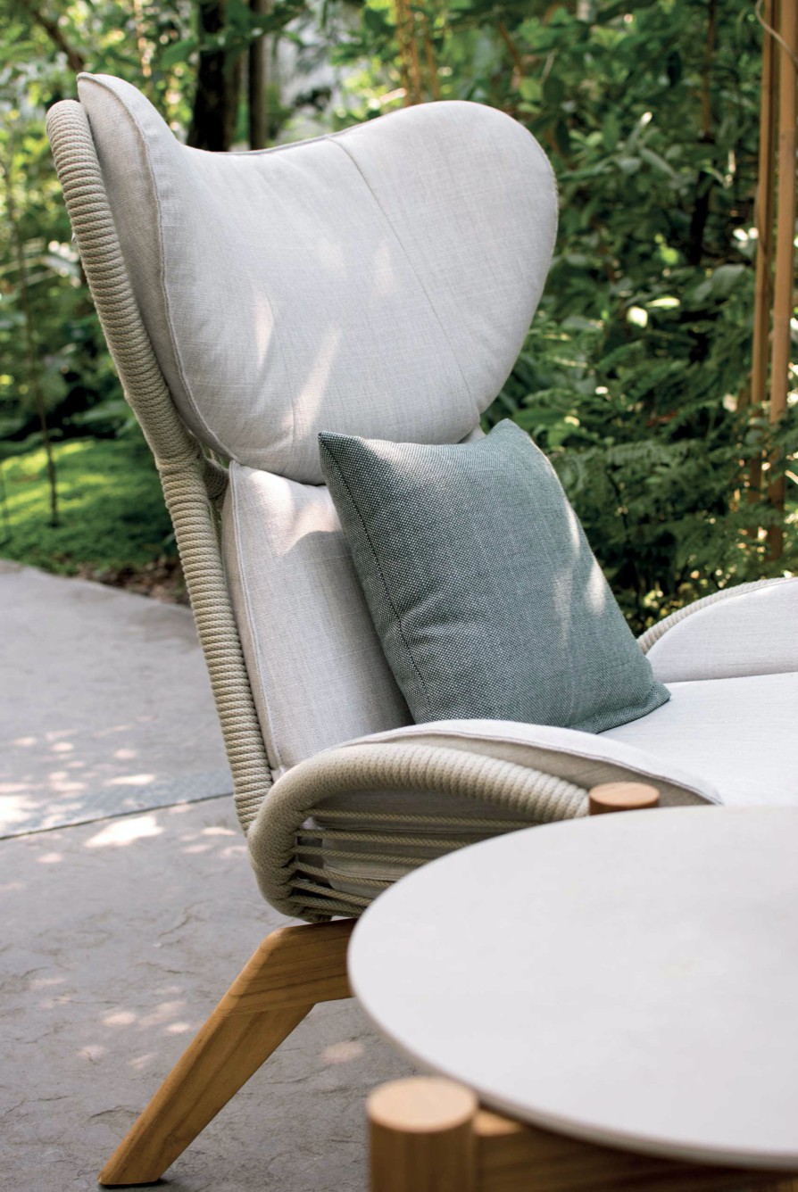 Poltrona con struttura in teak abbinata a corde intrecciate a mano in fibra acrilica di Teflon, a sezione tonda, resistenti all’acqua e di facile pulizia. Il materiale presenta un appeal morbido e raffinato simile ad intrecci tessili. Si caratterizza per la sua resistenza ai raggi UV e per la velocità di asciugatura.