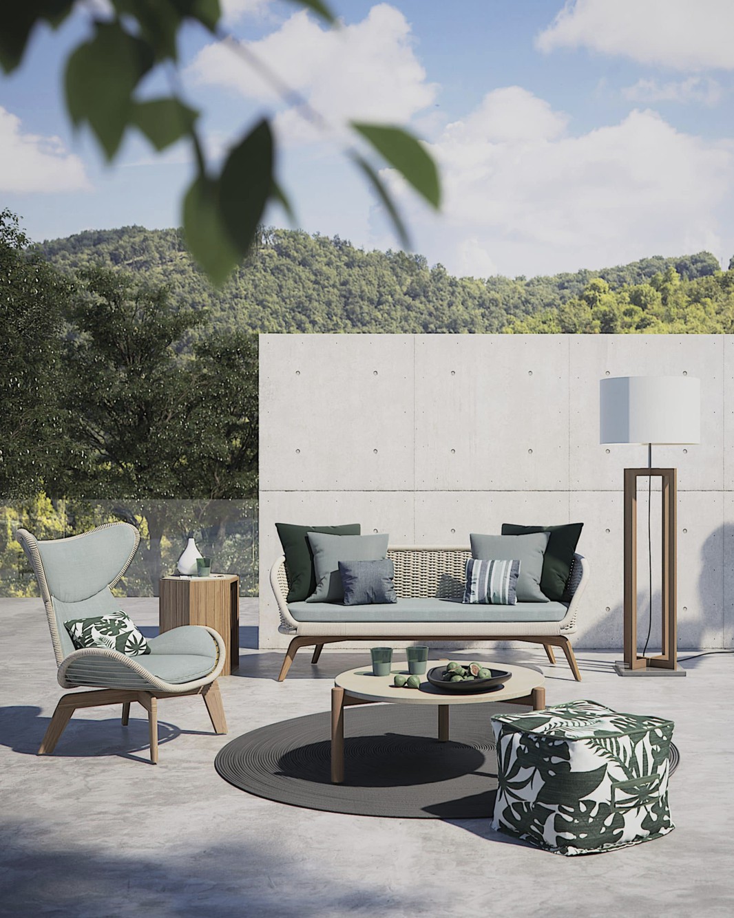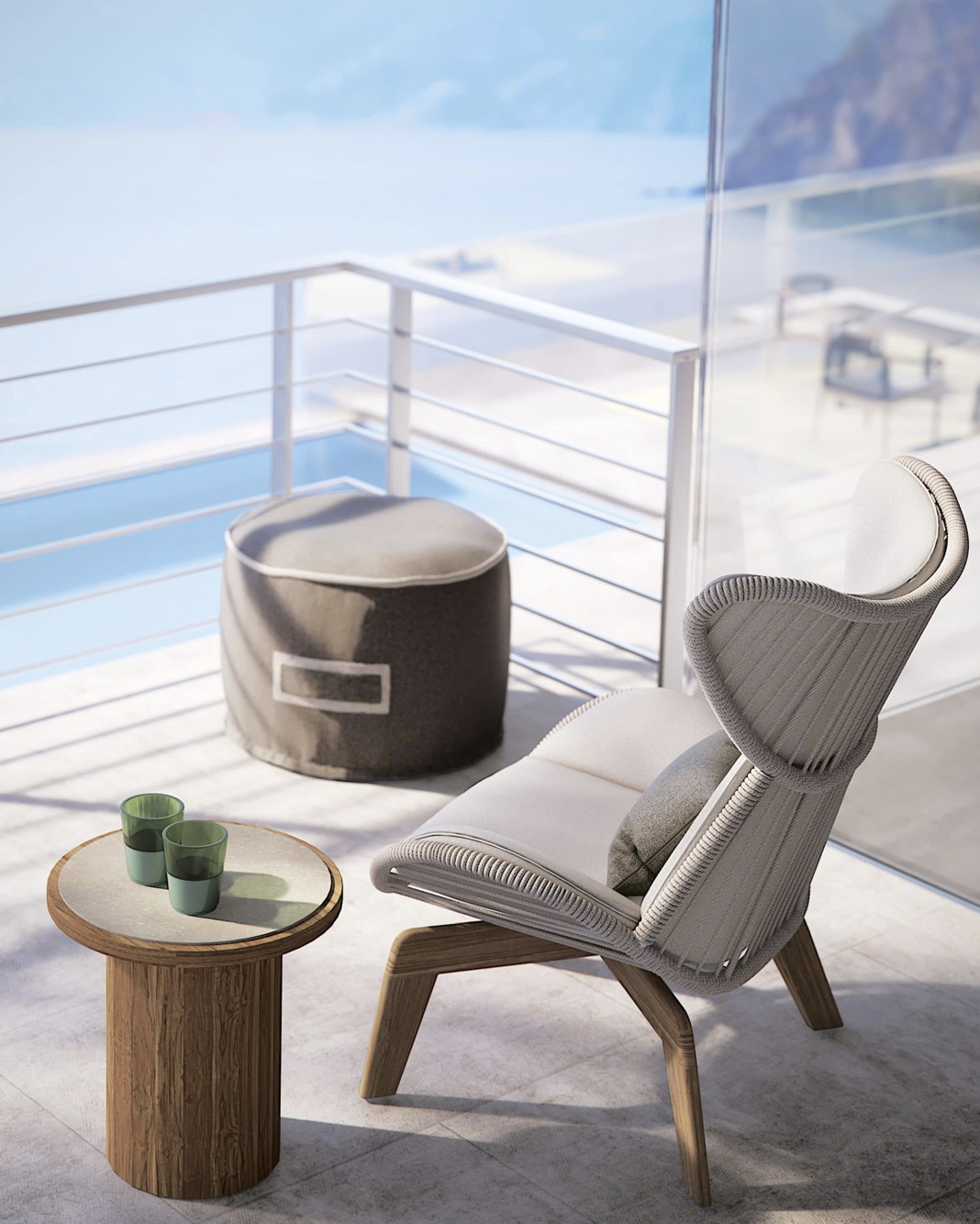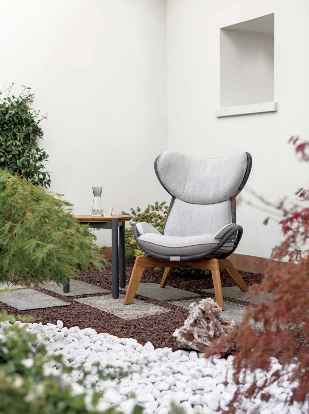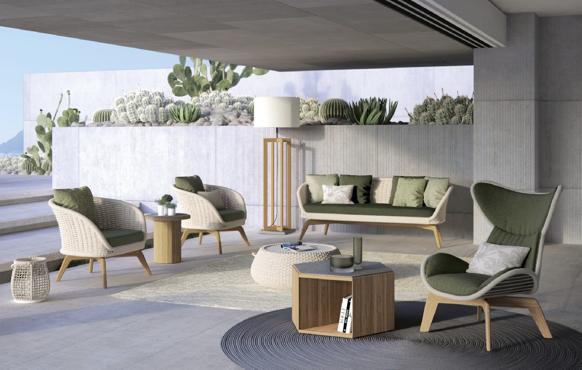 Poltrona con struttura in teak abbinata a corde intrecciate a mano in fibra acrilica di Teflon, a sezione tonda, resistenti all’acqua e di facile pulizia. Il materiale presenta un appeal morbido e raffinato simile ad intrecci tessili. Si caratterizza per la sua resistenza ai raggi UV e per la velocità di asciugatura.