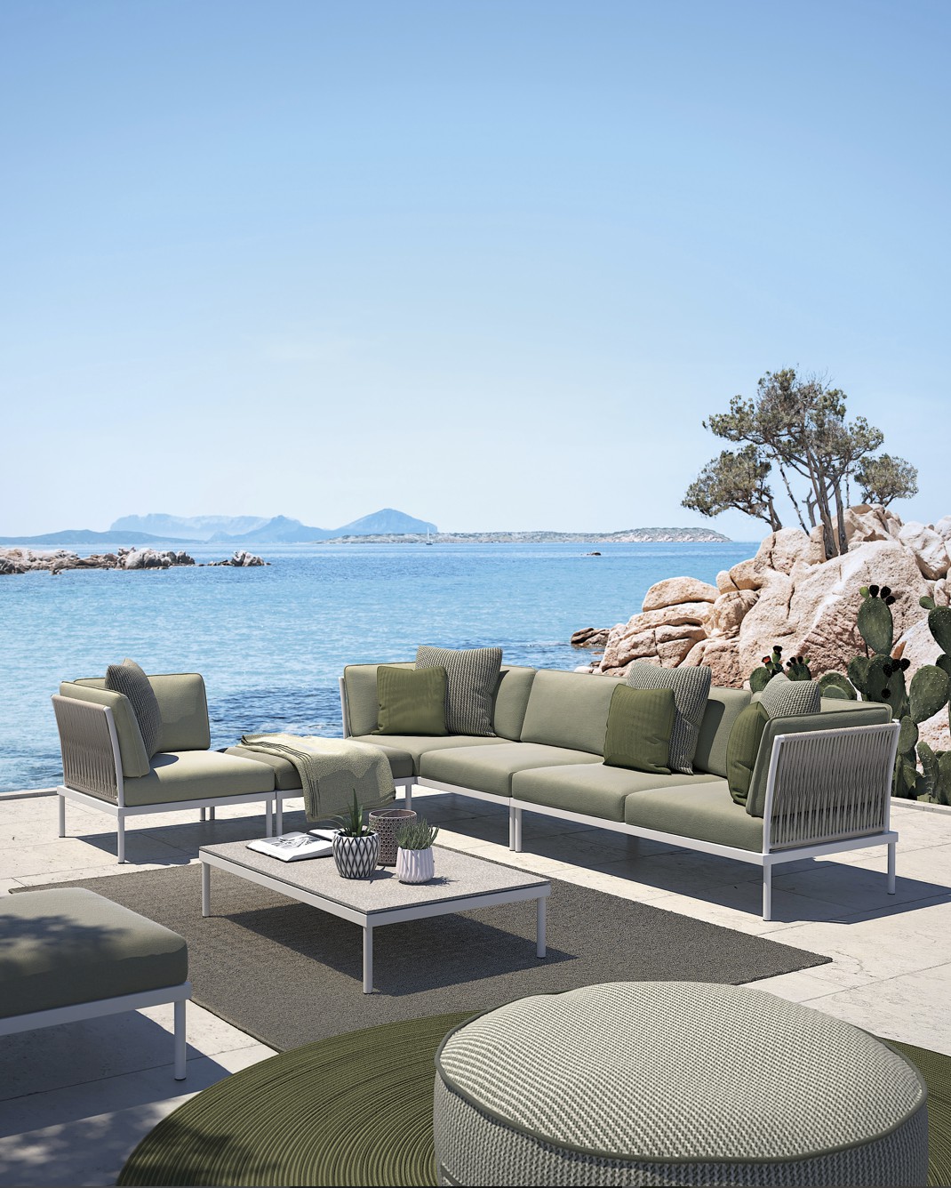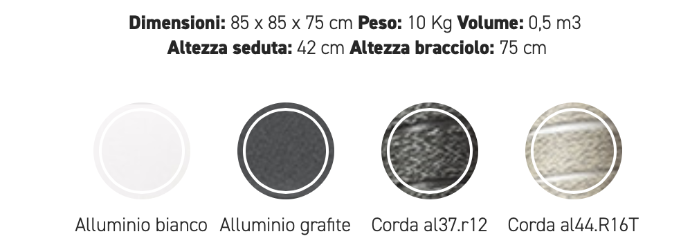 Struttura in alluminio verniciato epossidico per esterni, intrecciato a mano in fibra termoplastica acrilica Teflon, idrorepellente e di facile pulizia.