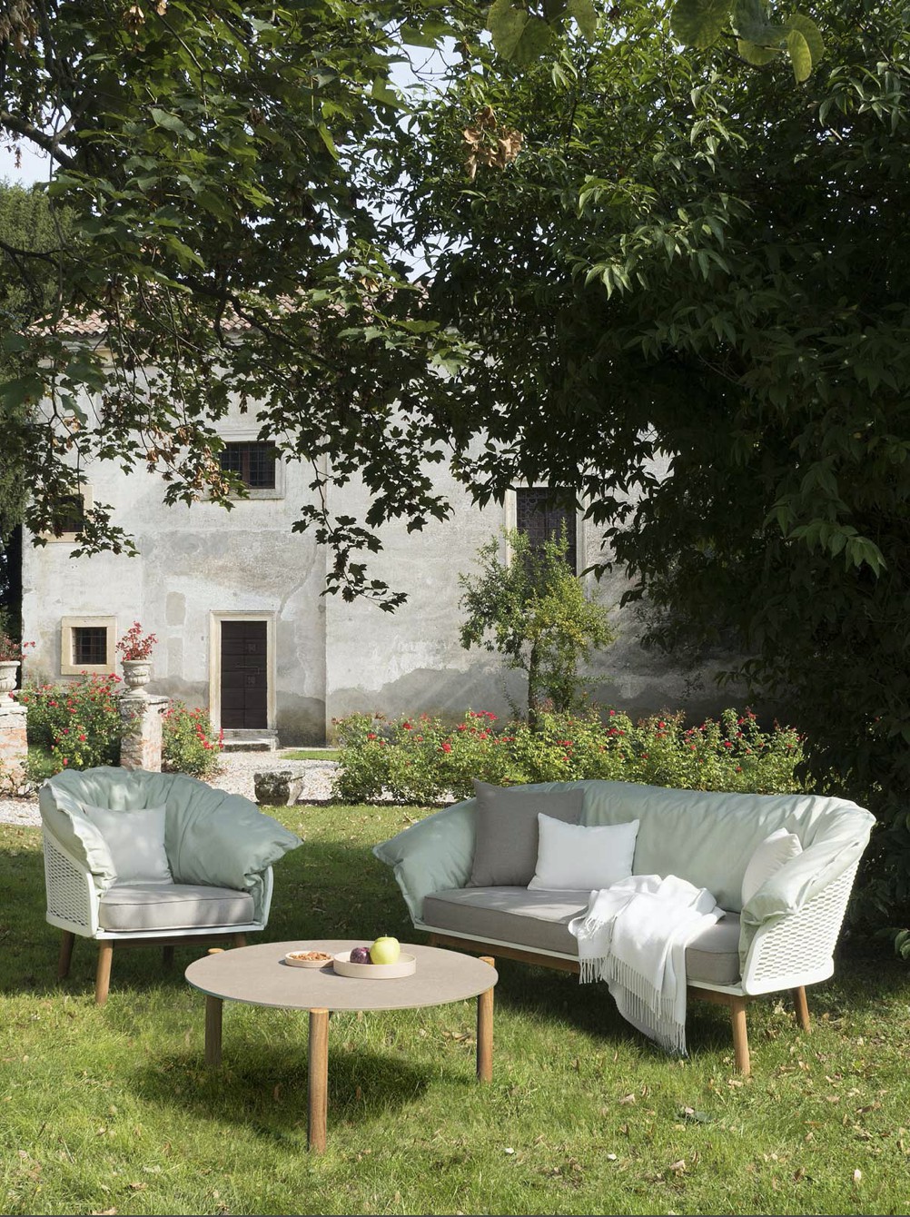Poltrona e divano interpretano questa doppia anima fatta da componenti robusti e materici caratterizzati da un’avvolgente scocca in alluminio che incorpora una cuscinatura ergonomica e morbida che si riversa verso l’esterno dello schienale come il petalo di un fiore.