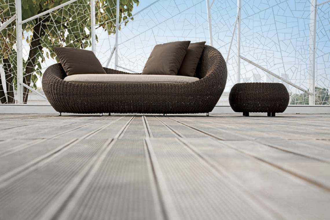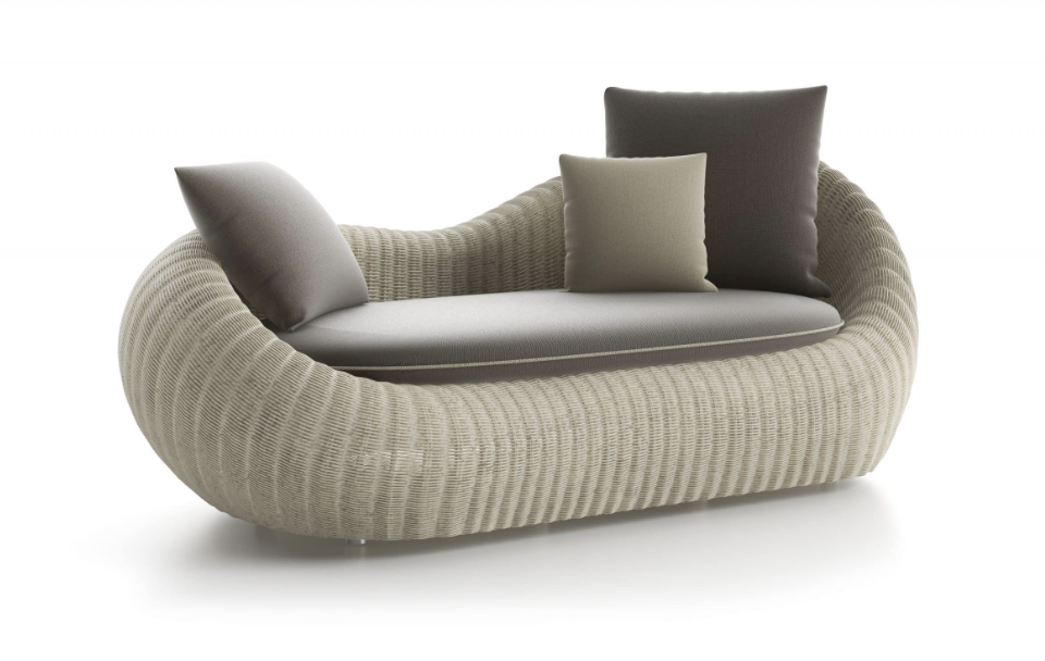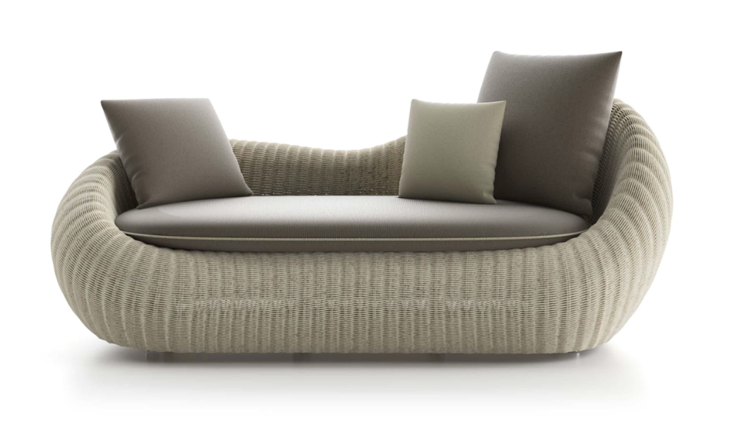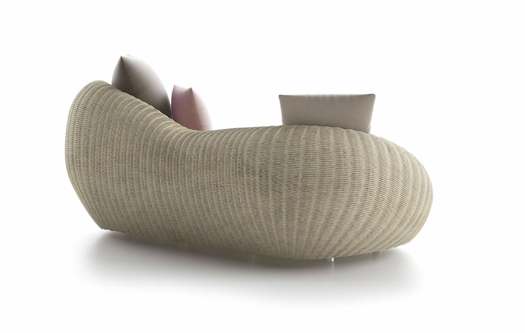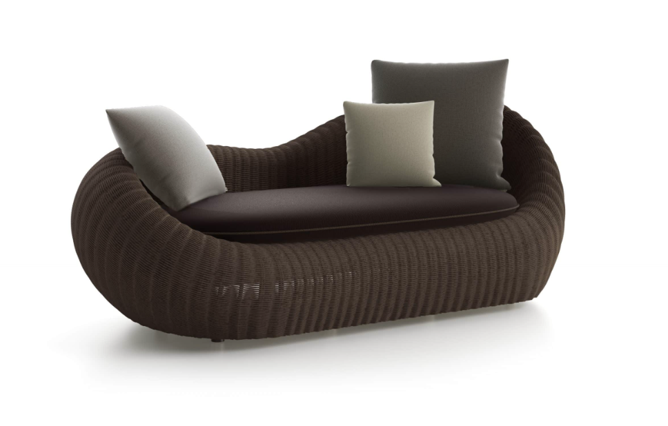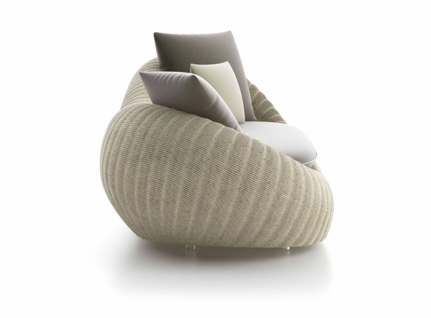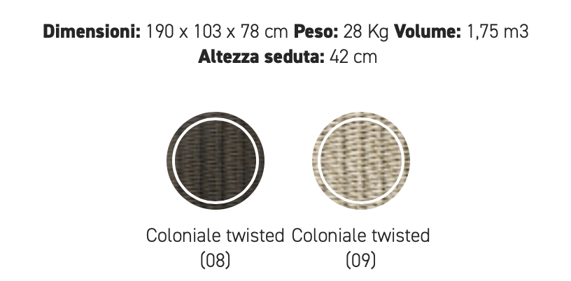 Strutture in alluminio verniciato epossidico per esterni. Intreccio in estruso di polietilene solidificato ad acqua, intrecciato a mano.