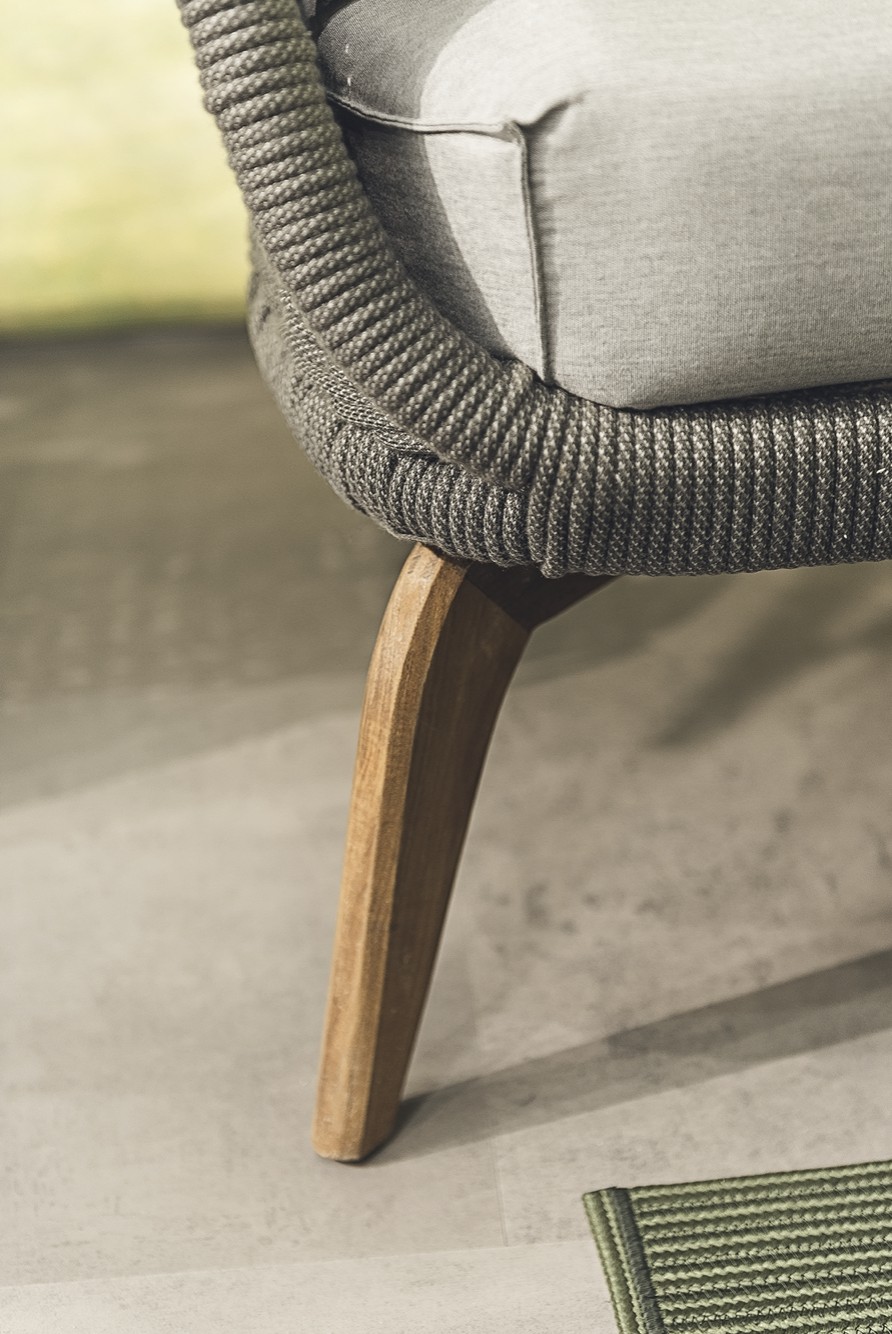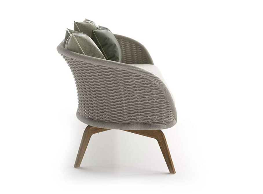 Divano con base in teak abbinata a corde intrecciate a mano in fibra acrilica di Teflon, a sezione tonda, resistenti all’acqua e di facile pulizia. Il materiale presenta un appeal morbido e raffinato simile ad intrecci tessili. Si caratterizza per la sua resistenza ai raggi UV e per la velocità di asciugatura.