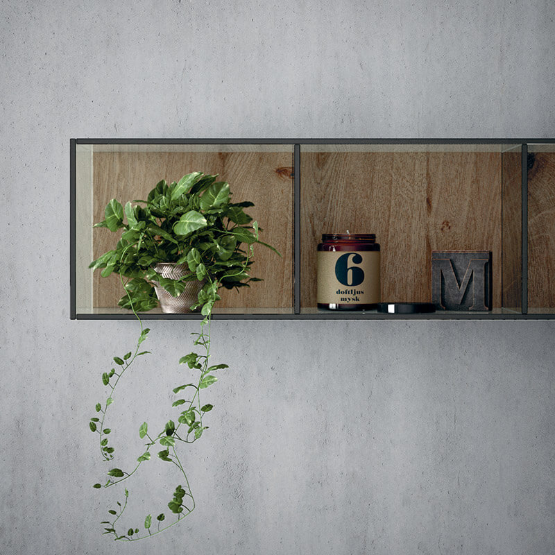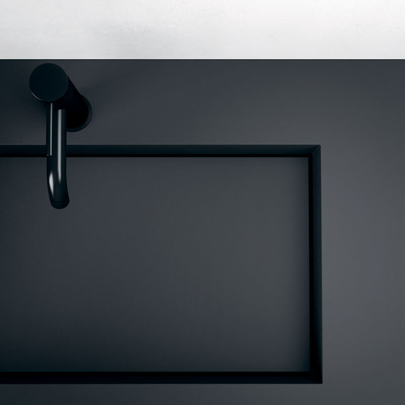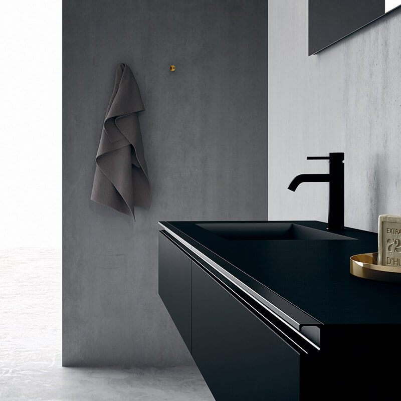 The monolith in super matt Fenix NTM? Nero Ingo is counterpoised with the base in Sabbiato Cortina wood with a customisable top. A modern, strong natured bathroom environment enriched by Opera accessories: pendant light, towel hooks, and floor mirror.