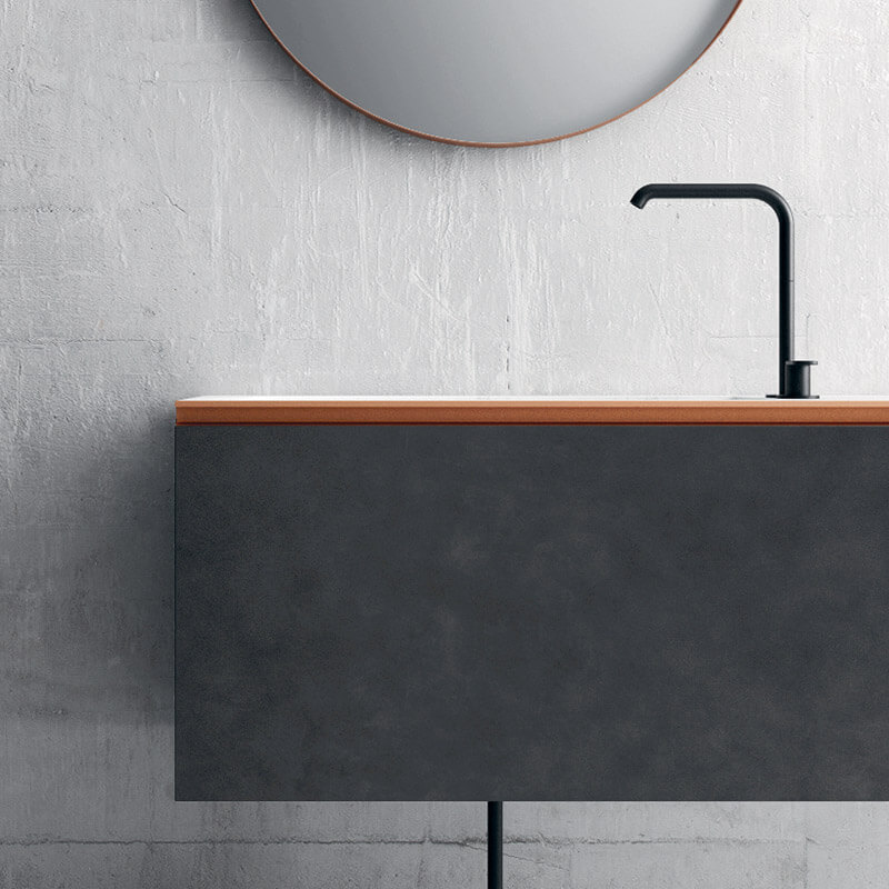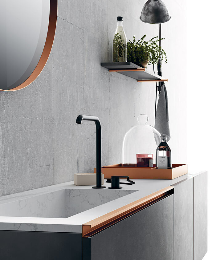 A washbasin unit with dark, intellectual nuances, thin and essential feet in burnished metal, recalling the matching Tubino light, a bright marble top coordinated with the base of the floor-standing towel rack.