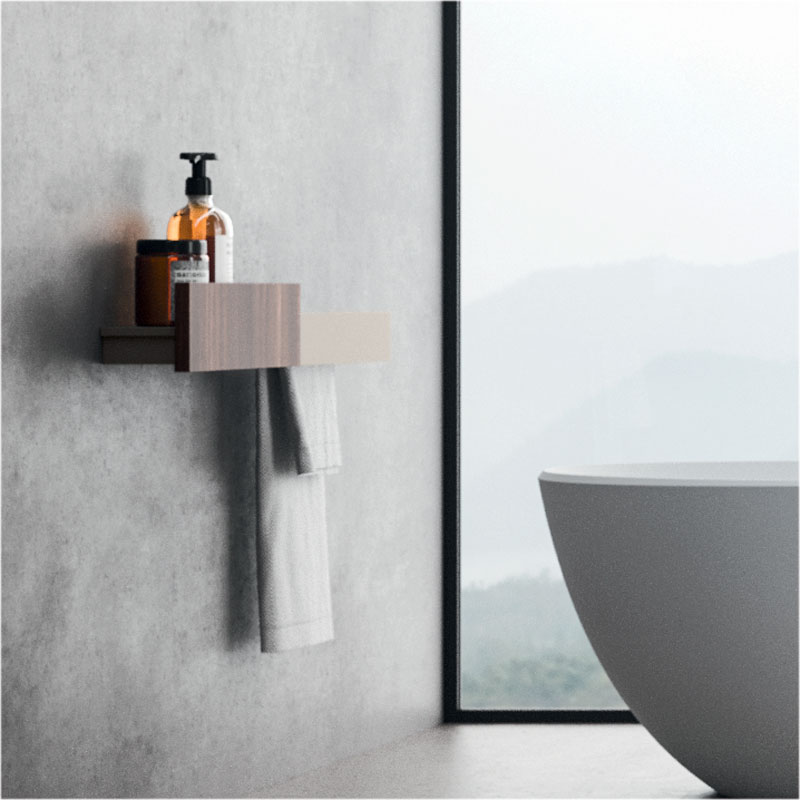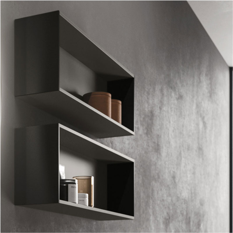The sophisticated Rovere Termocotto characterises the wall-mounted base unit and Day Box open storage elements H24 x 150 cm.