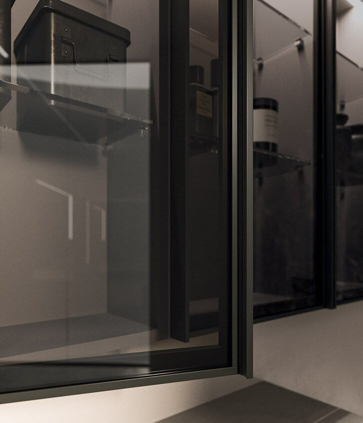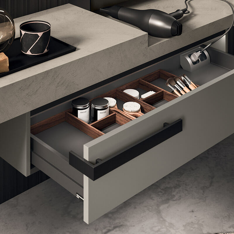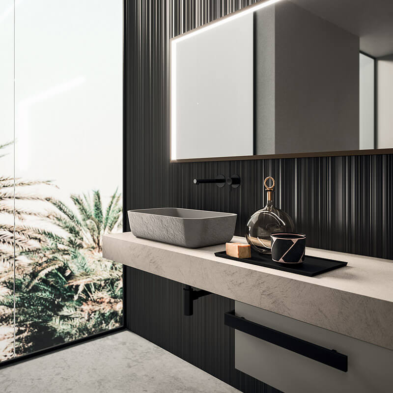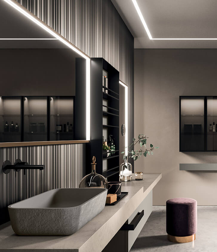 A free composition in the space, featuring wall-mounted tops with different thicknesses, enriched by the Day Box open storage compartments separating the two large Luxor mirrors. Also available in the corner console version to make the most of the space in the bathroom, creating a convenient vanity table.
