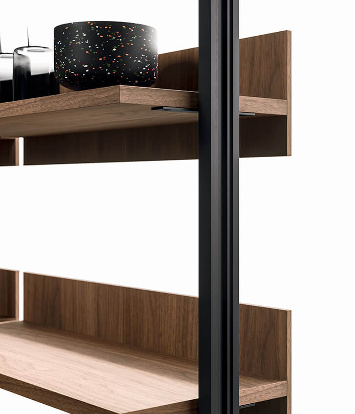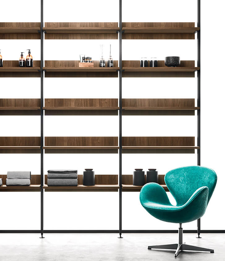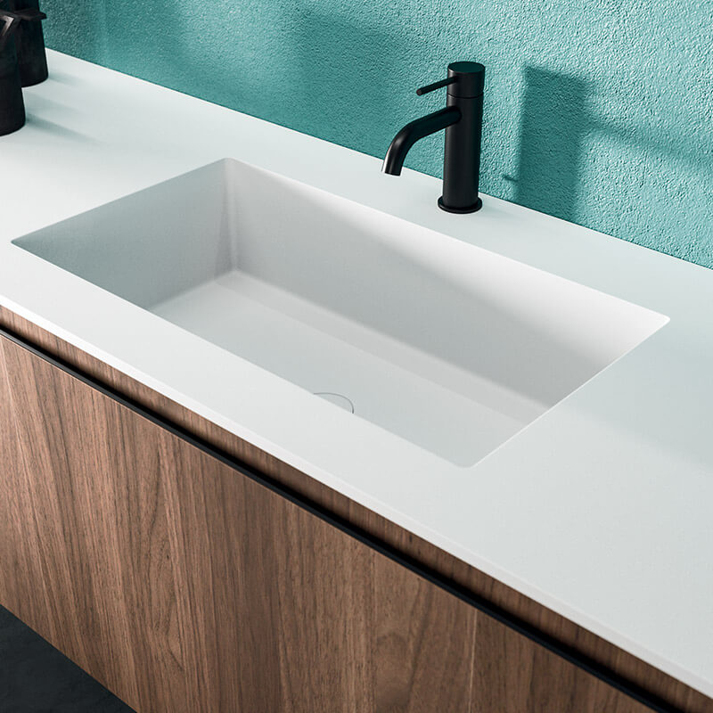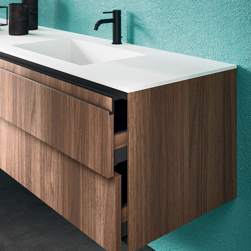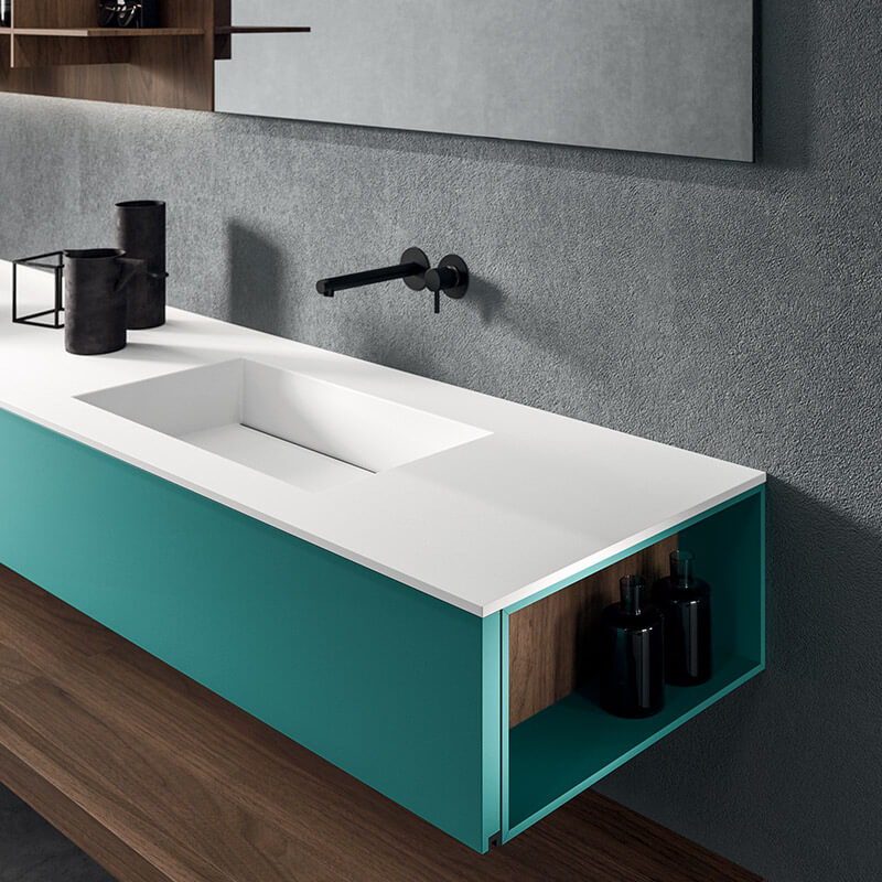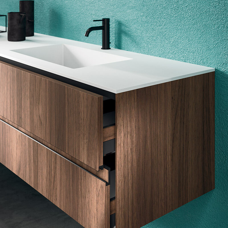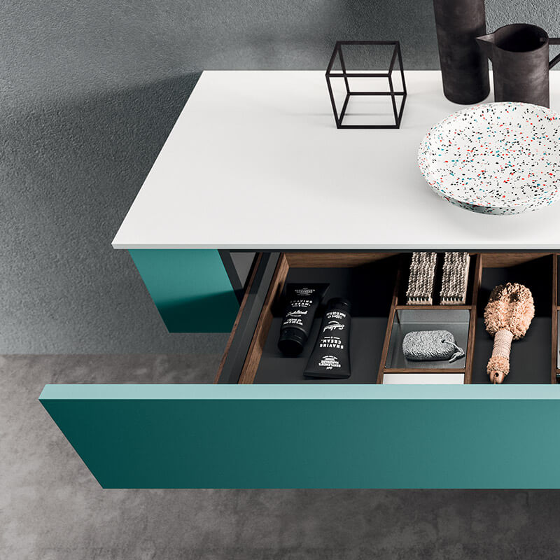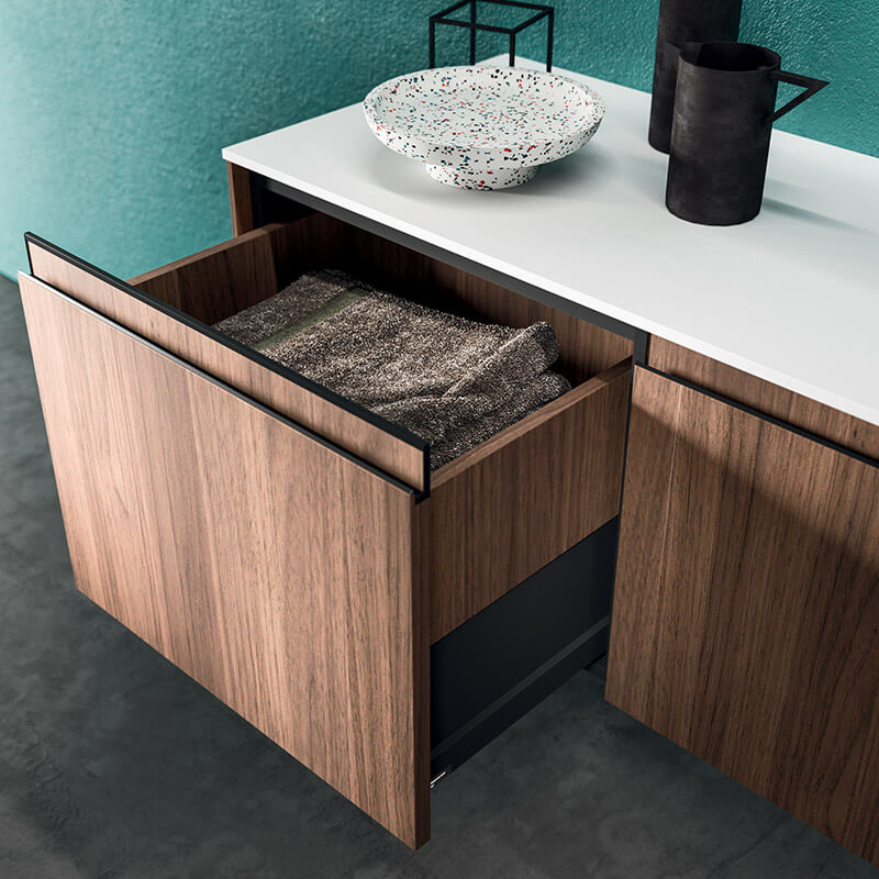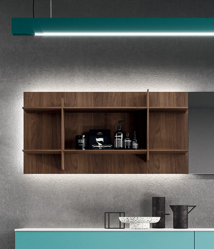 The integrated basin is the stand-out feature in this slimline composition, available in a range of variants. The concealed Up handle does not interfere with the linearity of the fronts, while the Vertical system and Lympha light offer elegance and vitality to the bathroom environment.