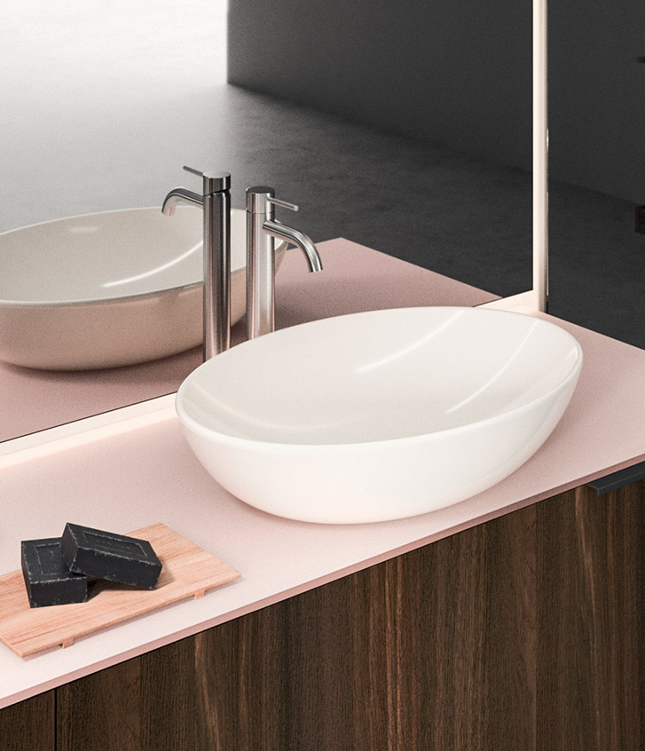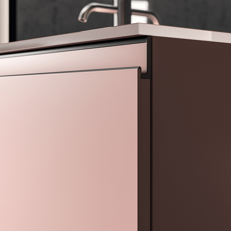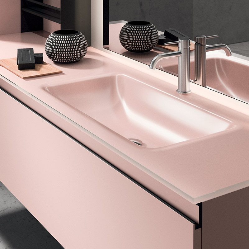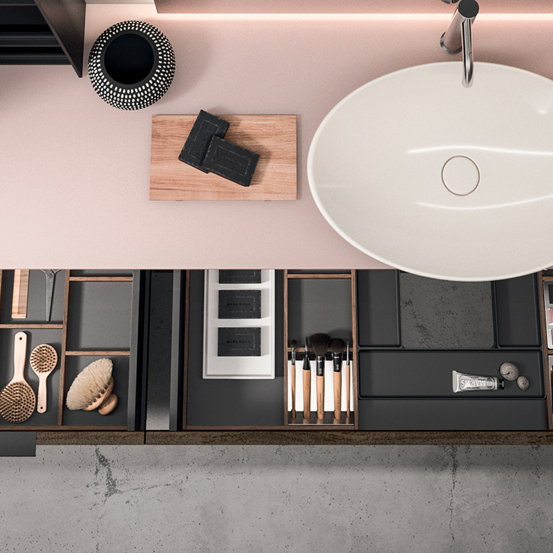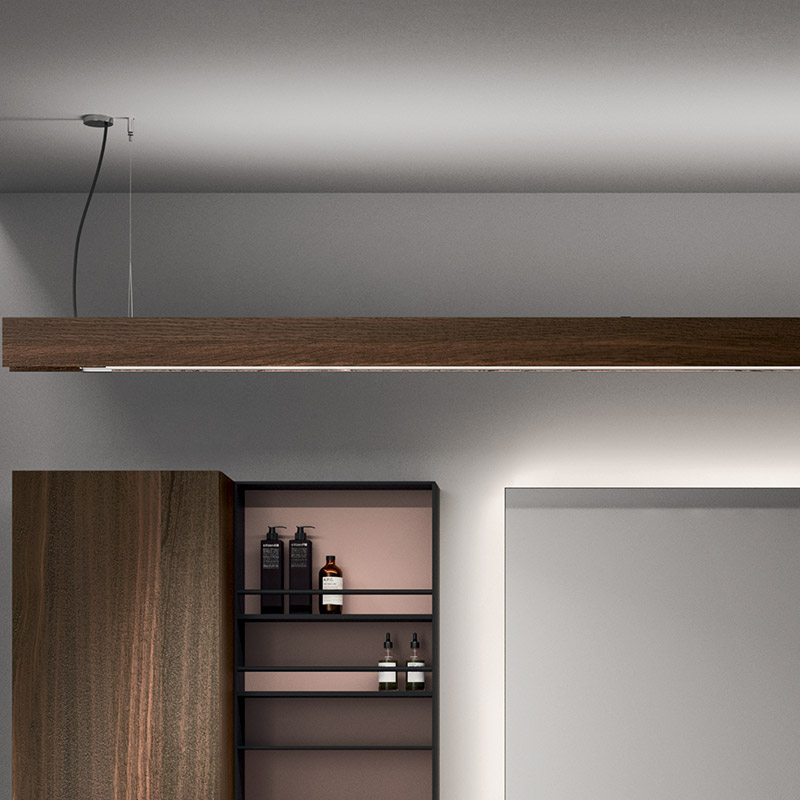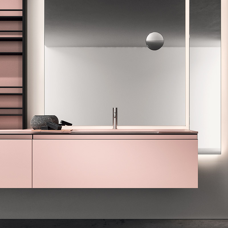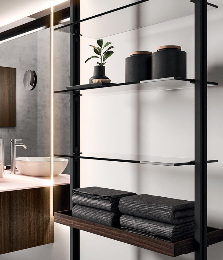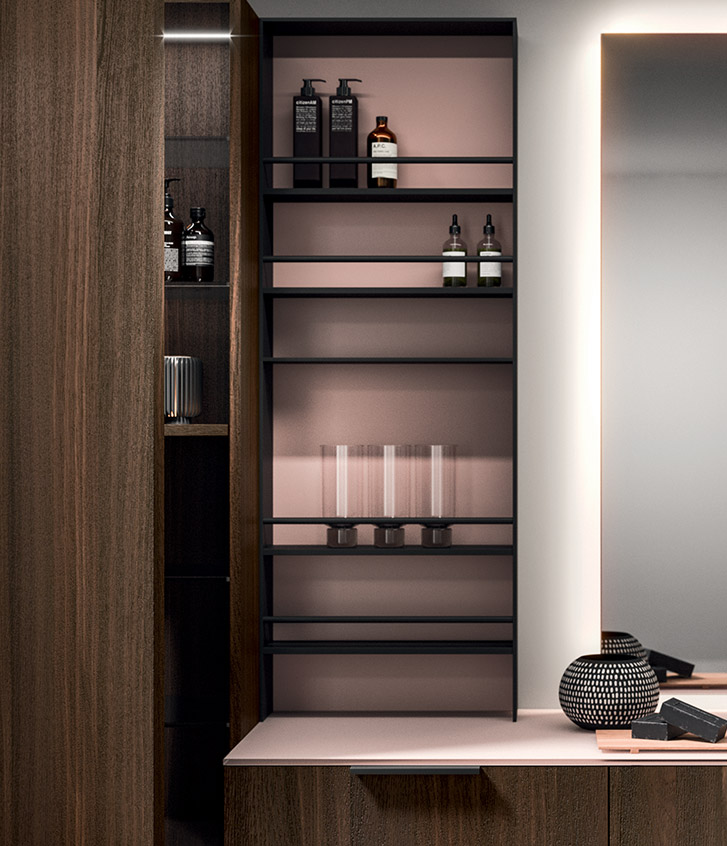 Plays on volumes, elegant suspended harmonies of reflections and textures. A composition characterised by concealed and visible storage modules, and timeless textural and colour contrasts.