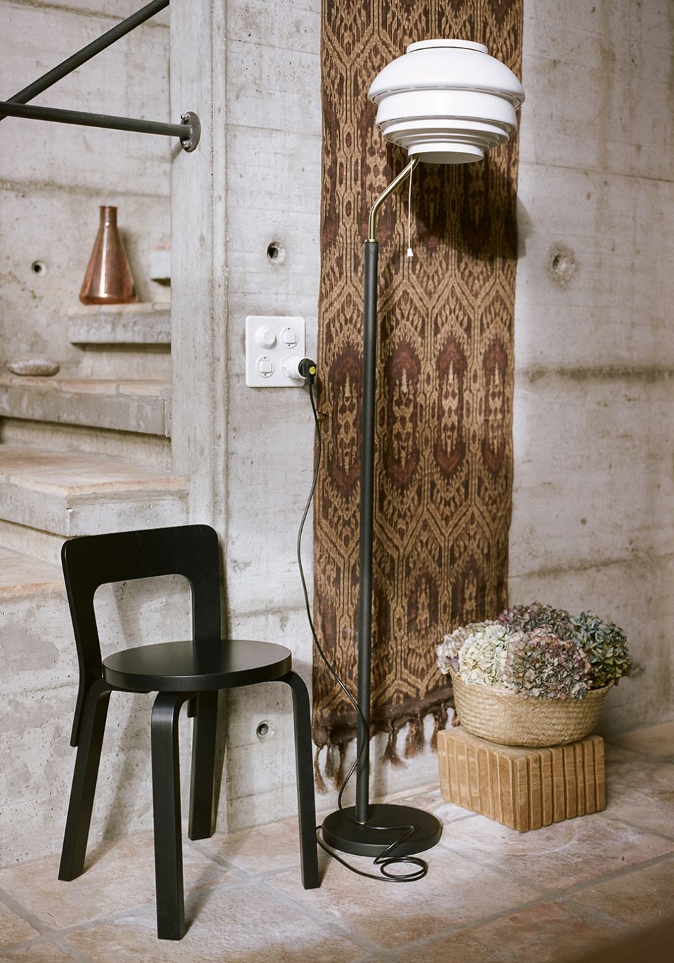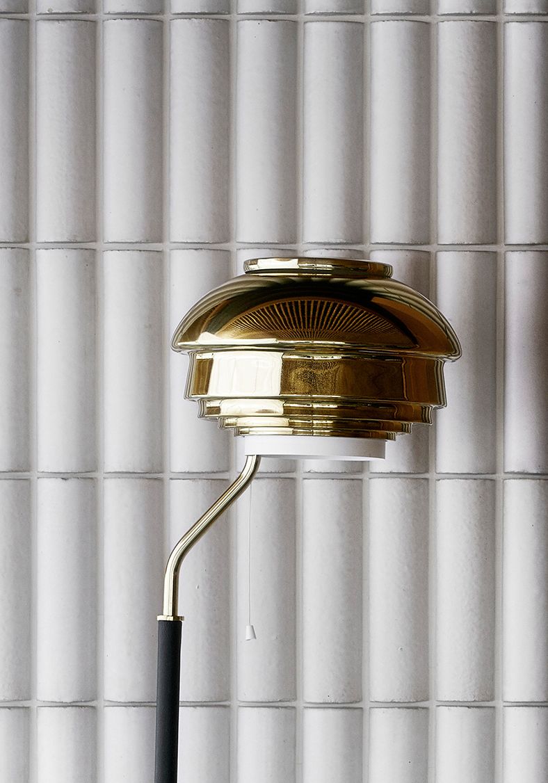 這款優(yōu)雅的落地?zé)舻氖謩?dòng)照明燈罩由精致的上漆金屬條制成,可通過均勻散射光來防止眩光。 這些條形成增加尺寸的同心圓,這些同心圓結(jié)合形成倒碗形。 細(xì)長的斜角脖子上有拋光的黃銅項(xiàng)圈,與支架在芬蘭手工縫制的黑色皮革飾面形成鮮明對(duì)比。 該燈由阿爾瓦·阿爾托(Alvar Aalto)于1955年為赫爾辛基國家退休金研究所設(shè)計(jì)。