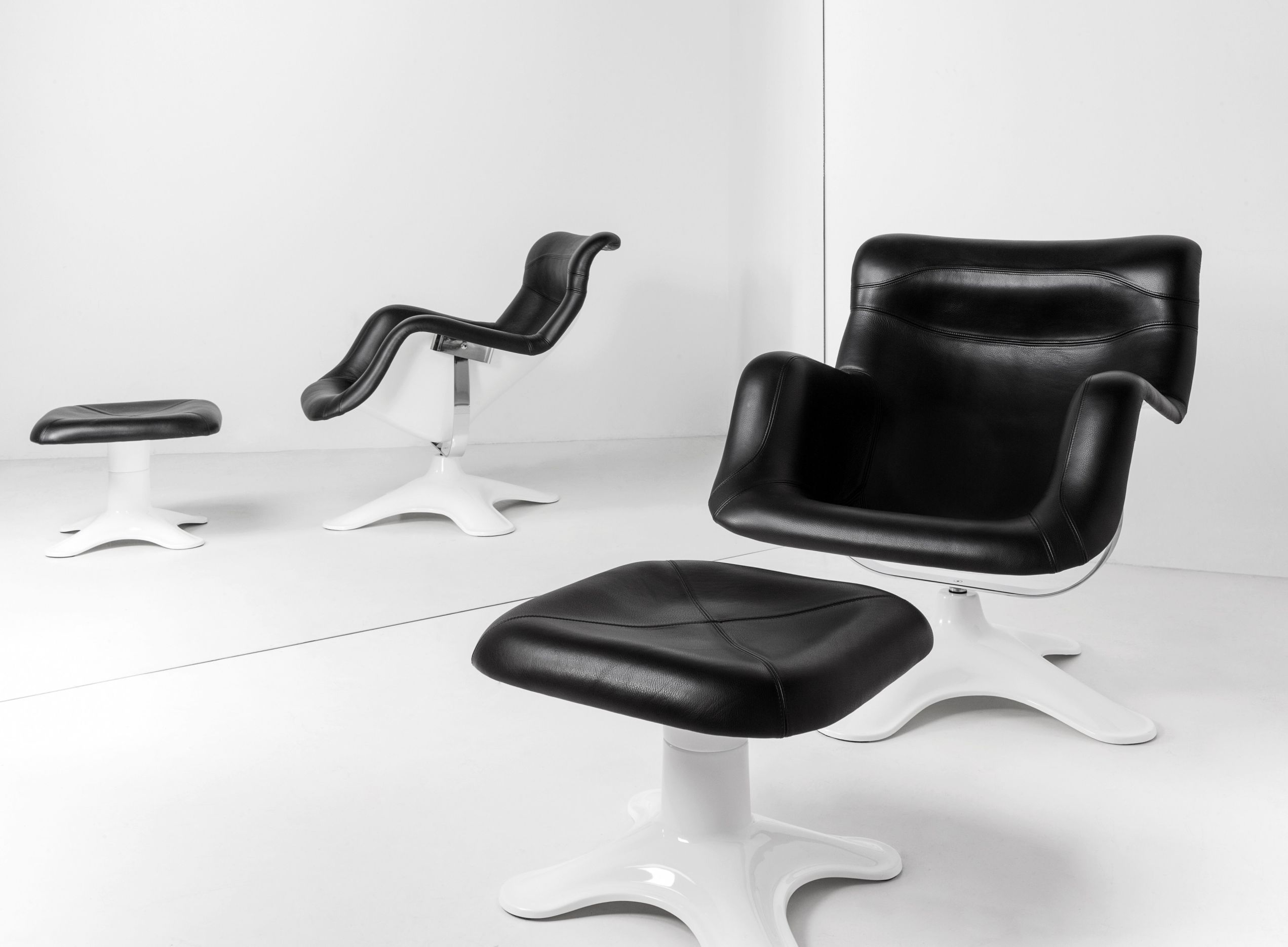 Karuselli Ottoman是Karuselli休閑椅的陪伴者,也是設(shè)計師Yrj?Kukkapuro對功能,人體工程學(xué)和有機形式的完美結(jié)合帶來終極舒適感的延續(xù)。 矮凳由位于白色玻璃纖維底座上的軟墊皮革上衣組成。