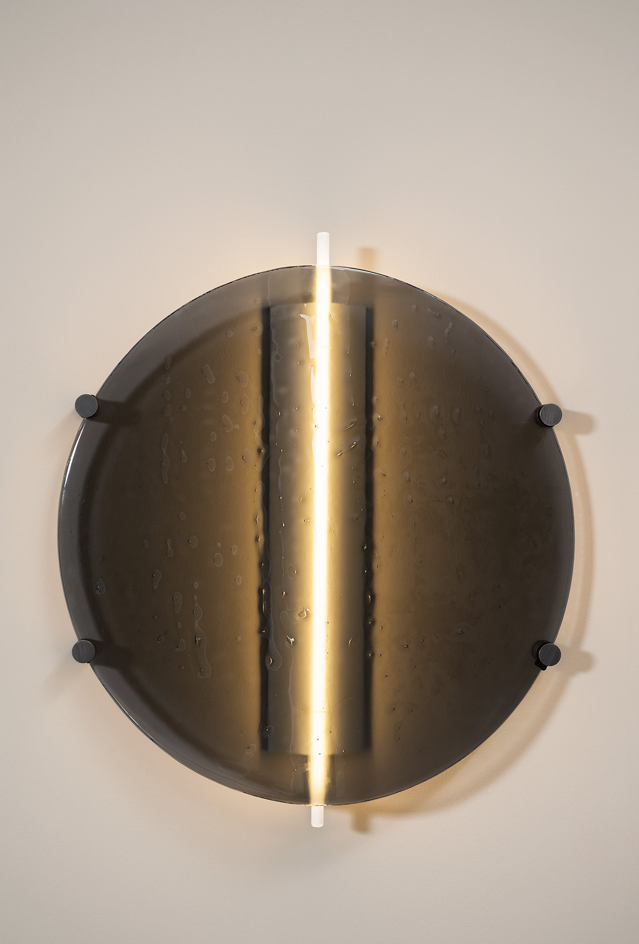 Fused glass lampshade carried out with a particular technique aimed to obtain imperfect surfaces.