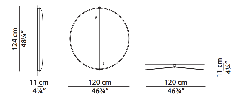 Matte black-varnished metal revolving structure with satin brass details with matte varnish. Rear aluminium metal sheets with leather covering. 12 mm bevelled perimeter mirror.