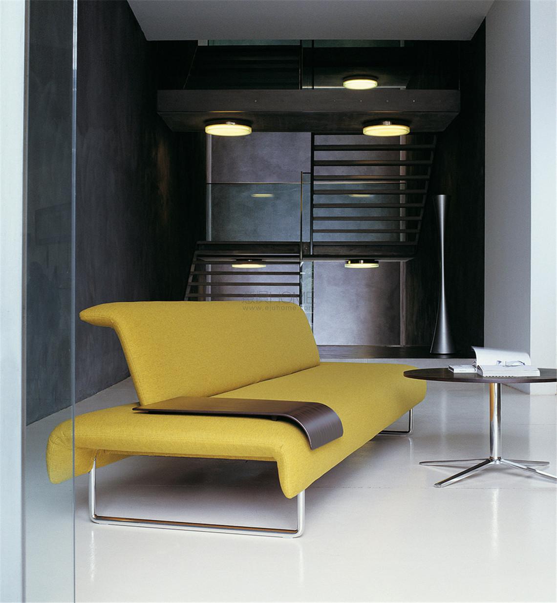 極簡主義和基本線條是這些長長的飾面坐凳的特征,它們或有或沒有靠背,這種設計傳遞出了一種舒適和輕盈的感覺。從正面看,它體積龐大,而側面則十分纖薄,仿佛是一個經過雕琢的模塊,而且它龐大的體積讓通過拋光金屬管展現出來的半空懸浮的效果更加突出。設計師為這個項目起名為Cloud,這完美濃縮了所有的這些特點。和座椅相比,靠背顯得很小。在靠背的頂部有一個彎折部分,當您坐下時,可以舒適地將手臂放在此處。一個呈四分之一圓的弧形連接將不同大小、有靠背或沒有靠背的凳子連接起來,打造不同長度和形狀的座椅,在公共區域打造原創的景觀。最后,可以在座椅上放置一塊典雅的木板,以作桌面或服務元素之用。