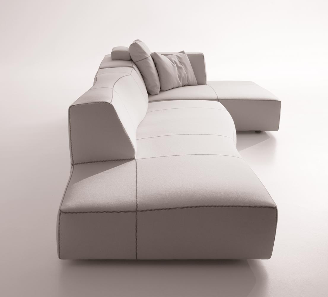 它給人的印象是曾經過某位藝術家的鑄模處理,但其實它的這種效果是來自于3D模型和數字化研究。它看似一個經過設計師切削、磨圓和鑄模的整體。不規則的形狀使其更加舒適,對比色的接合縫勾勒定義了設計和動作。Bend Sofa結合了手工技巧和技術,硬度和力量,同時豐富的型號使其在使用方面也相當靈活。它的原創性與非常詳盡的組合研究密不可分。其波紋狀的模塊的組裝可以從座椅、擱腳凳和轉角元素開始,它們可以實現各種可能的解決方案——從用于有限空間中緊湊的線性版本到復雜、范圍寬廣的布局。
