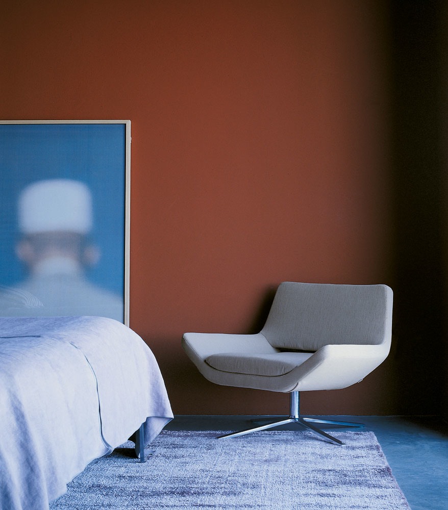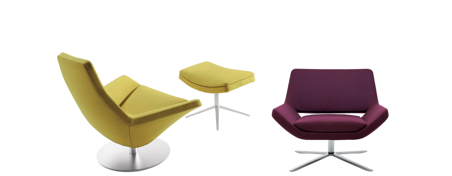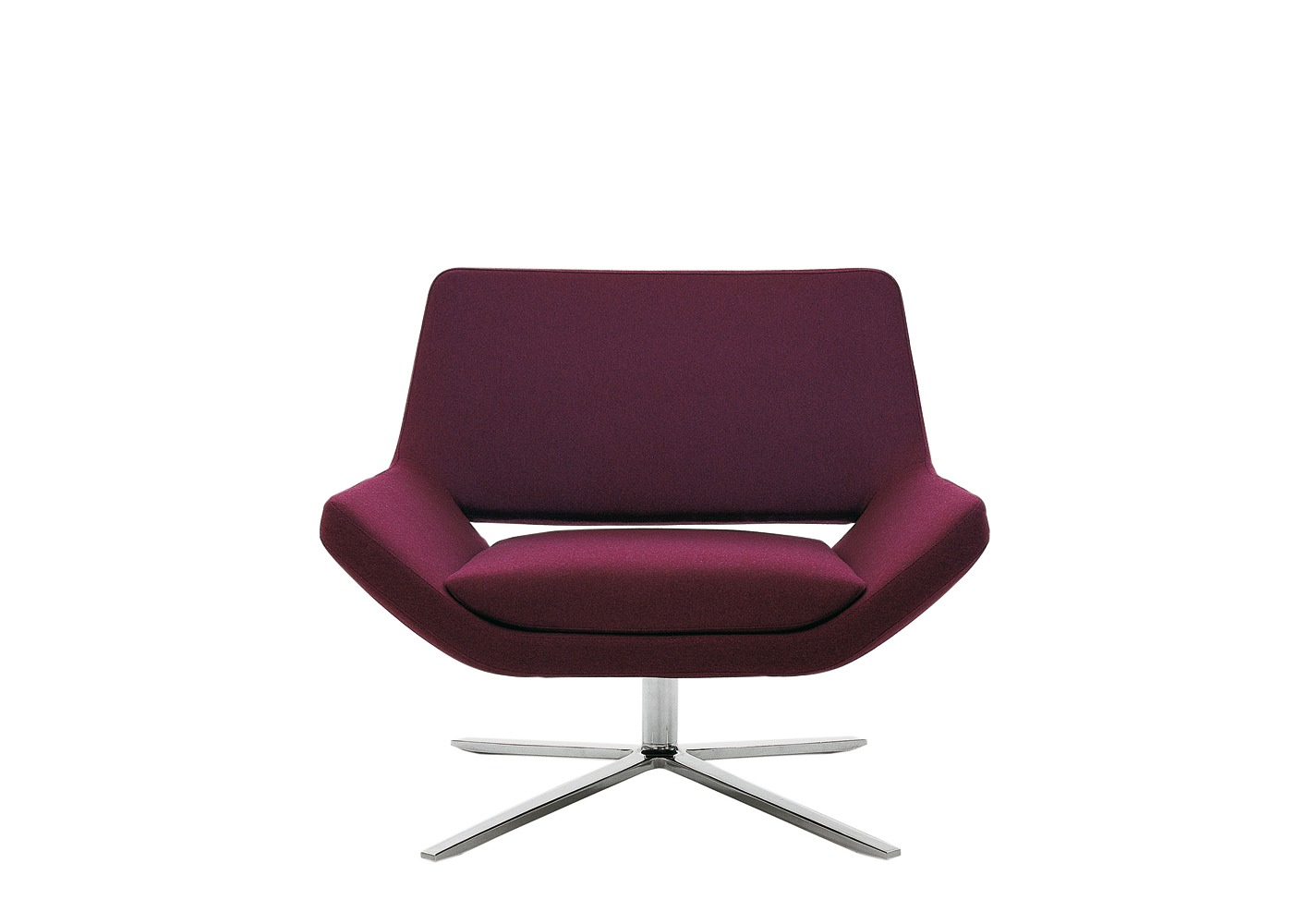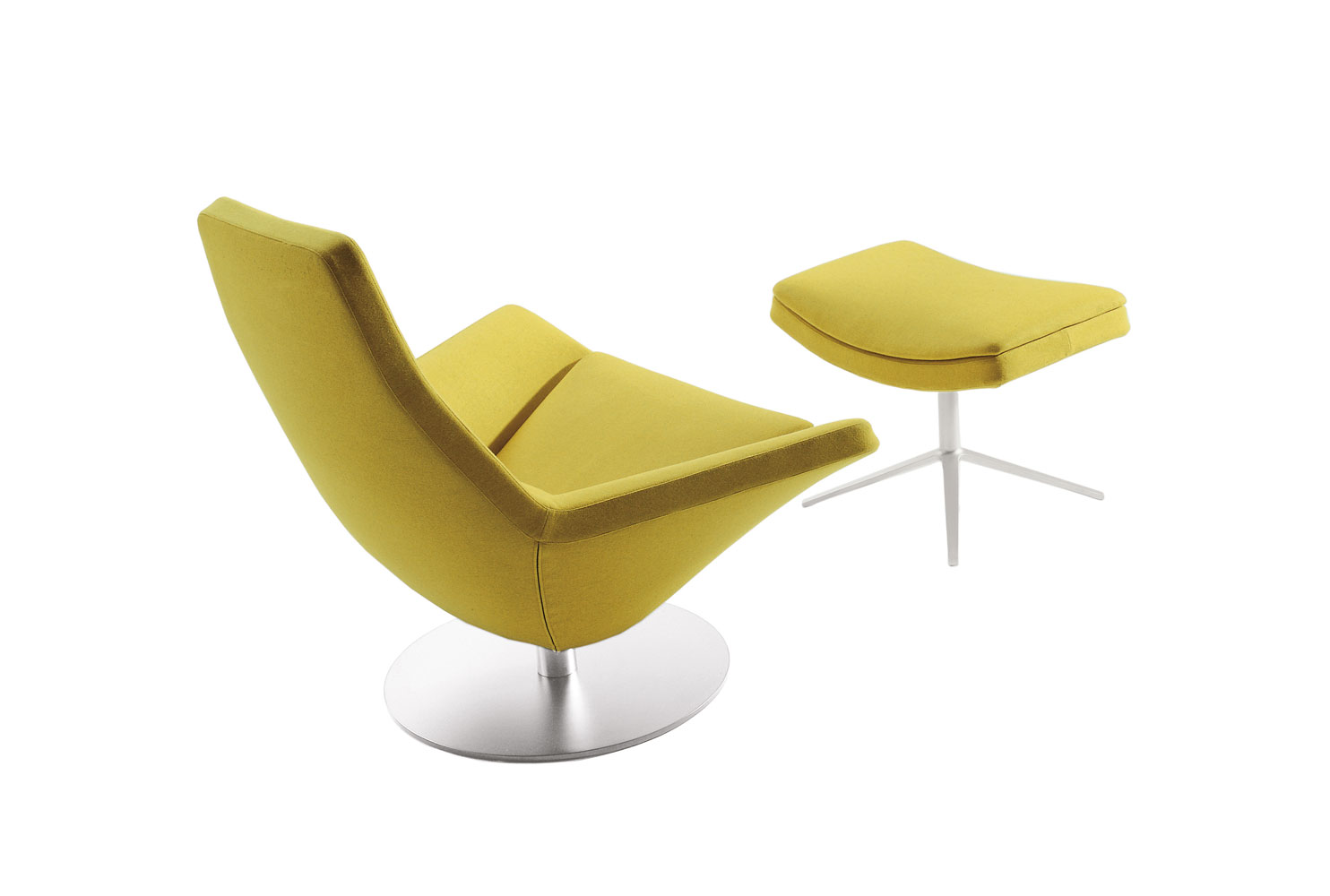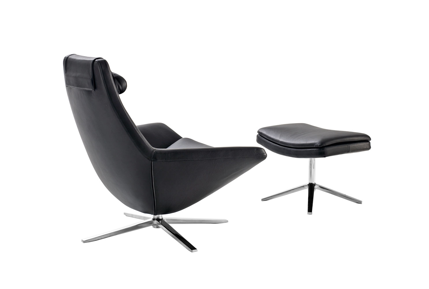 座椅與扶手之間的流暢連接是這款小扶手椅和休閑椅的主要標志。小扶手椅擁有鋁制旋轉底座和4根輻條,將優雅與舒適結合在一起。休閑椅體積較大,也有旋轉底座,還有匹配的擱腳凳,和一個帶磁鐵、可調整的頭枕。有兩種底座可選,一種帶有4根輻條,一種是圓形的,它們都是由拋亮光的鋁制成。