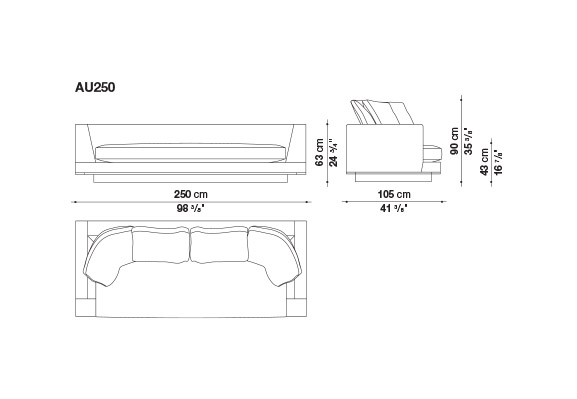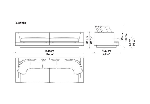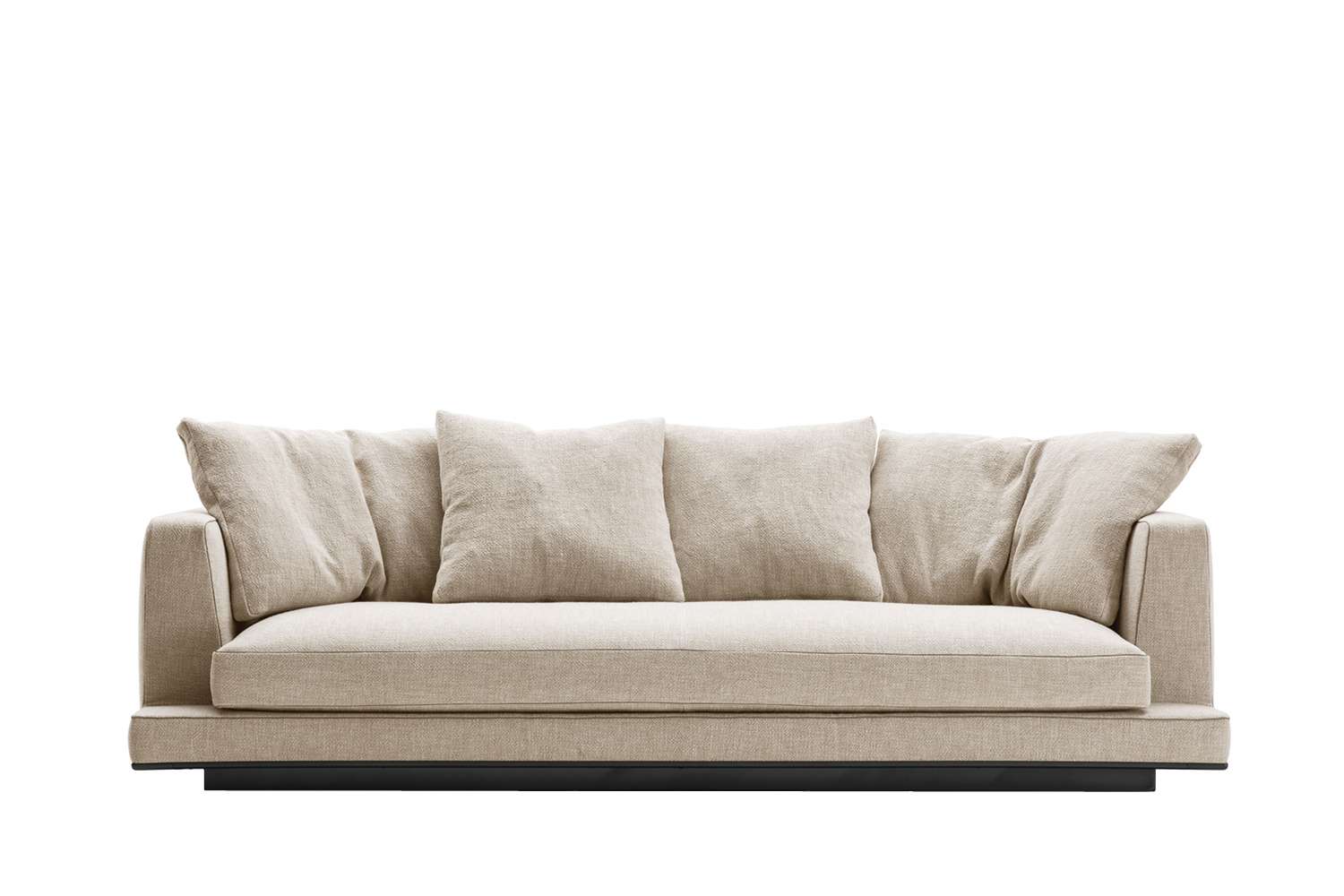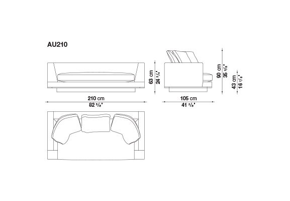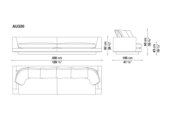 Geometric volumes raised off the floor and soft clean rigorous lines are the distinctive characteristics of Aurae sofas. This collection offers a high level of formal elegance, with linear seating in five dimensions with a generous depth (widths cm. 210-250-290-330-370 x depth cm.105), completed by soft backrest cushions to guarantee maximumcomfort. Carefully crafted tailored details on exclusive fabric upholstery are embellished with a faux leather trimthat defines the shape. In addition to fabric upholstery, leather covers with profile seams are available. The lower perimeter edge is available in different painted metal finishes: bronzed nickel, black chrome, graphite and amber.
