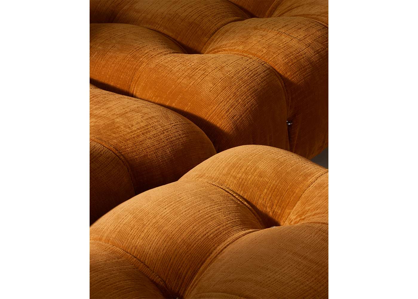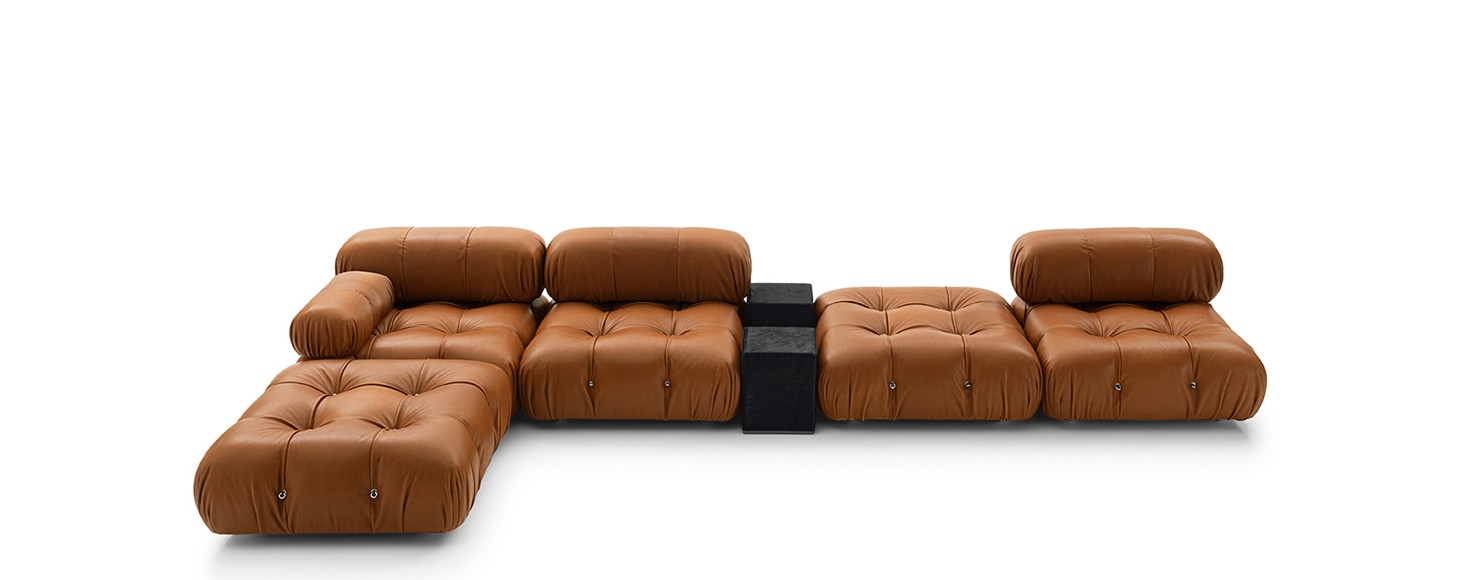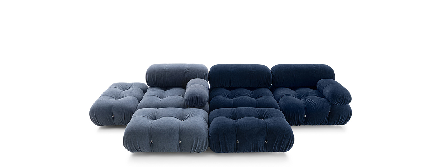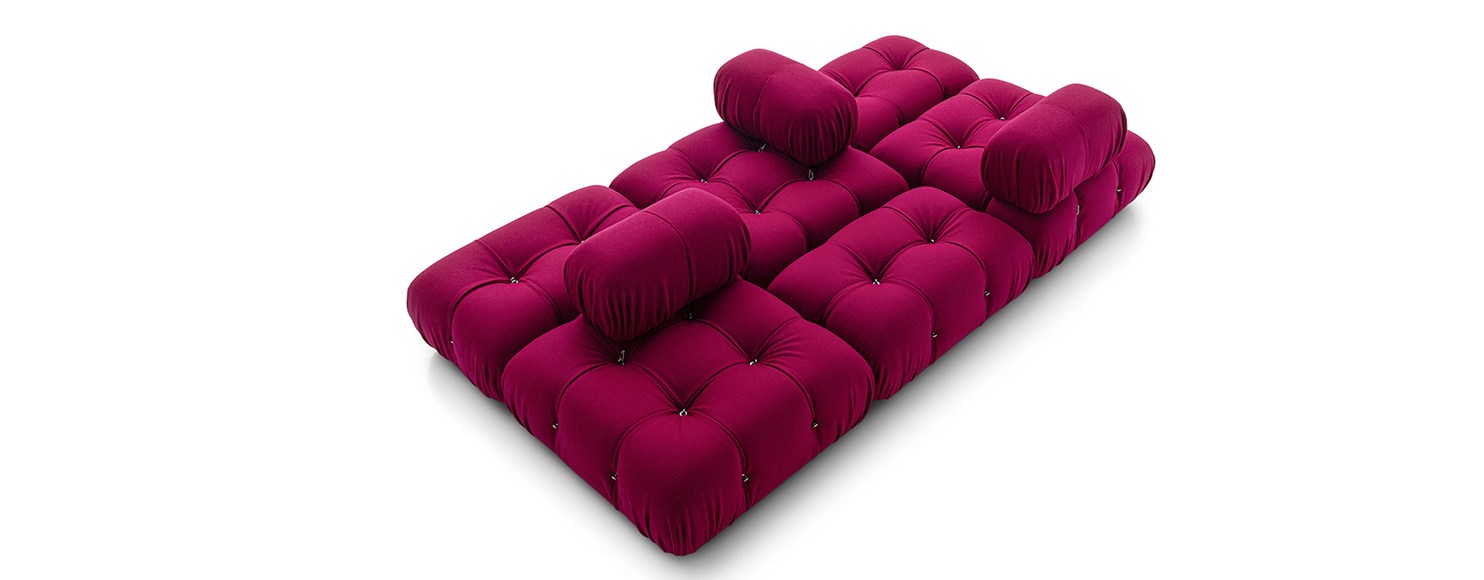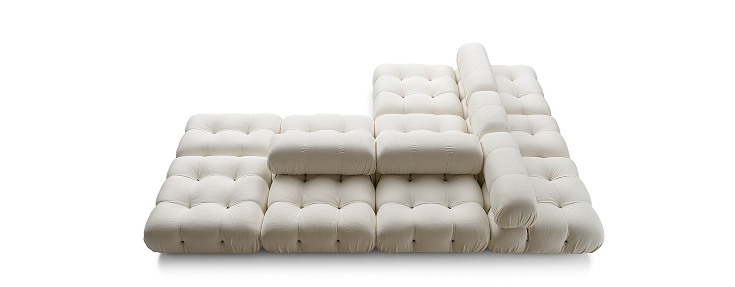 In its reissue, Camaleonda preserves the elements that have made it a contemporary classic. By mutual agreement, Mario Bellini and B&B Italia have decided to keep the cm 90x90 seat module, together with the backrest and the armrest, faithful to the original project, whose original cutting pattern was used for the new edition. The generous polyurethane padding that forms the characteristic capitonné design remains unchanged, still manufactured with the innovative system of cables, hooks and rings created by Bellini in 1970, which defines the characteristic look and modularity. Thanks to the tie-rods and the rings, in fact, the modules can be unhooked and recombined at will, allowing the sofa to adapt to an evolving taste and the dynamic needs of those using it. The fundamental characteristic of Camaleonda is its unlimited modularity, a geometric pattern that allows each element to become a sort of enormous pixel through which to define your home environment. By hooking and unhooking seats, backrests and armrests, you can enjoy the luxury of changing your mind as many times as you desire, moving and redesigning the space.