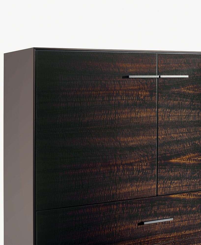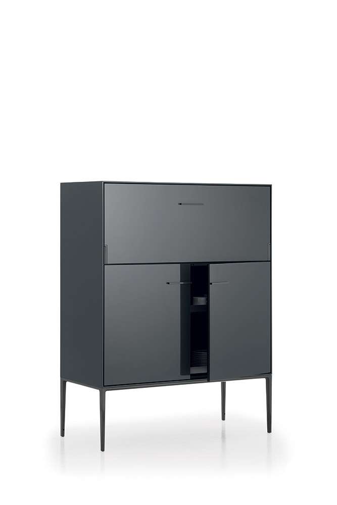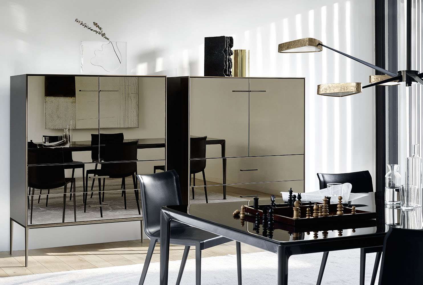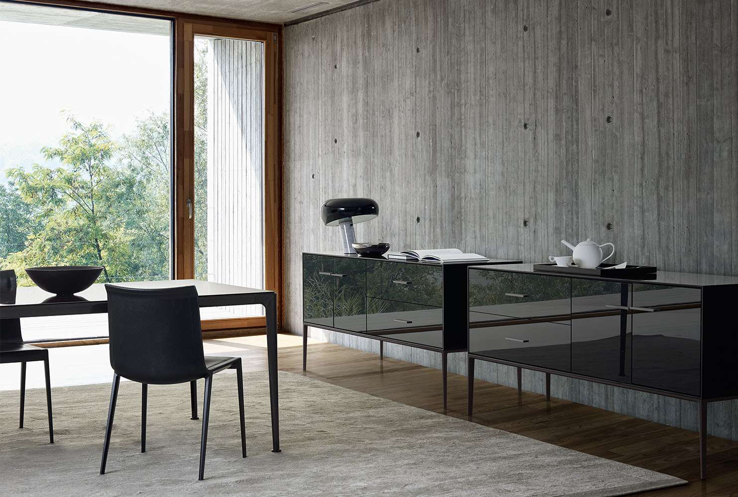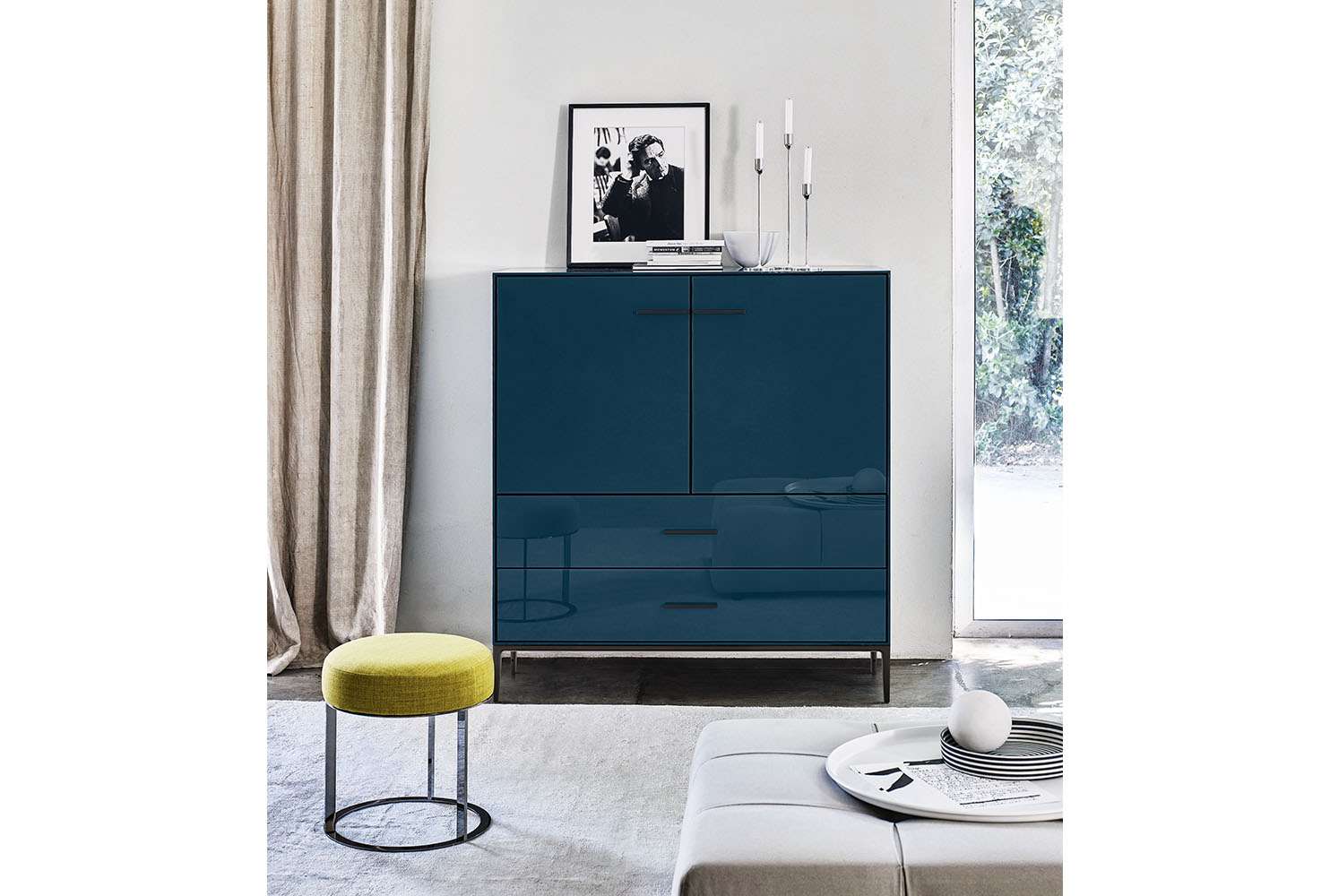 Eucalipto is the name of a series of units designed for the living room, dining room or wherever a special focus is required. Eucalipto enriches B&B Italia’s collection with a sophisticated touch suggesting original glamorous combinations. For the carcass acrylic finish that develops in three variants with different combinations for doors and drawers: black structure with doors and drawers in grey mirror, in black back-painted glass or in eucalyptus frisé wood with glossy finish; bronze structure with doors and drawers in bronzed mirror, in bronze back-painted glass or in eucalyptus frisé wood with glossy finish; teal blue structure with doors and drawers in grey mirror teal in teal blue back-painted glass or in eucalyptus frisé wood with glossy finish.