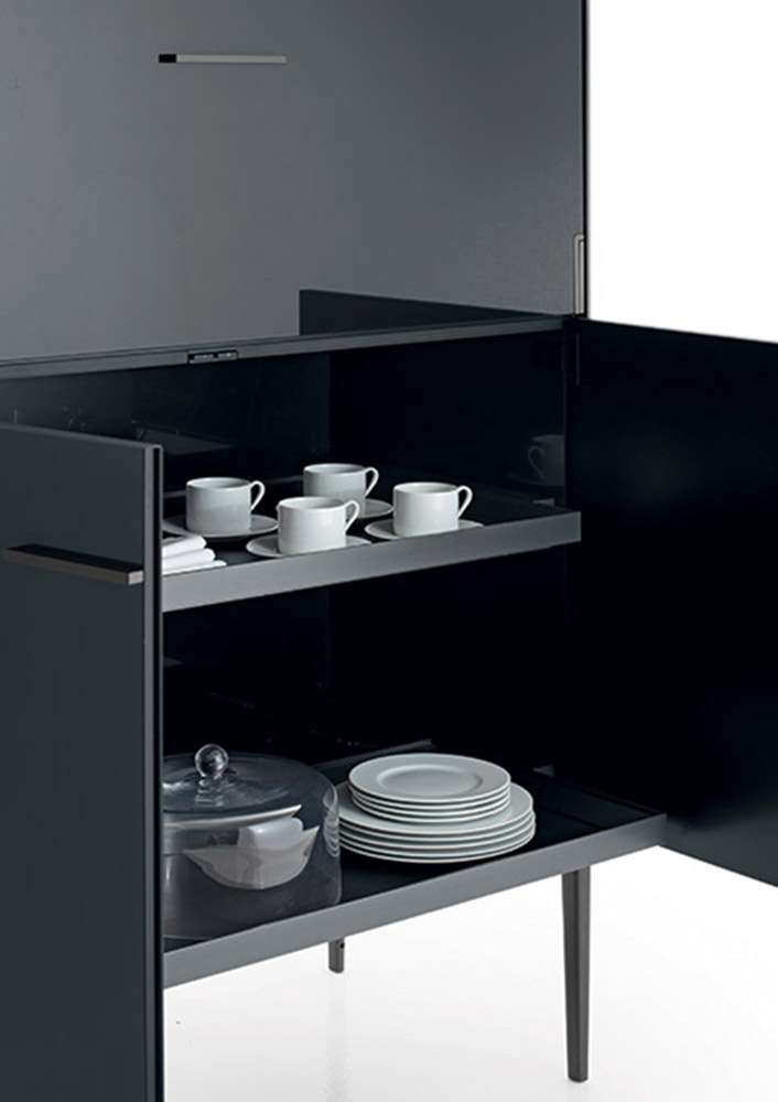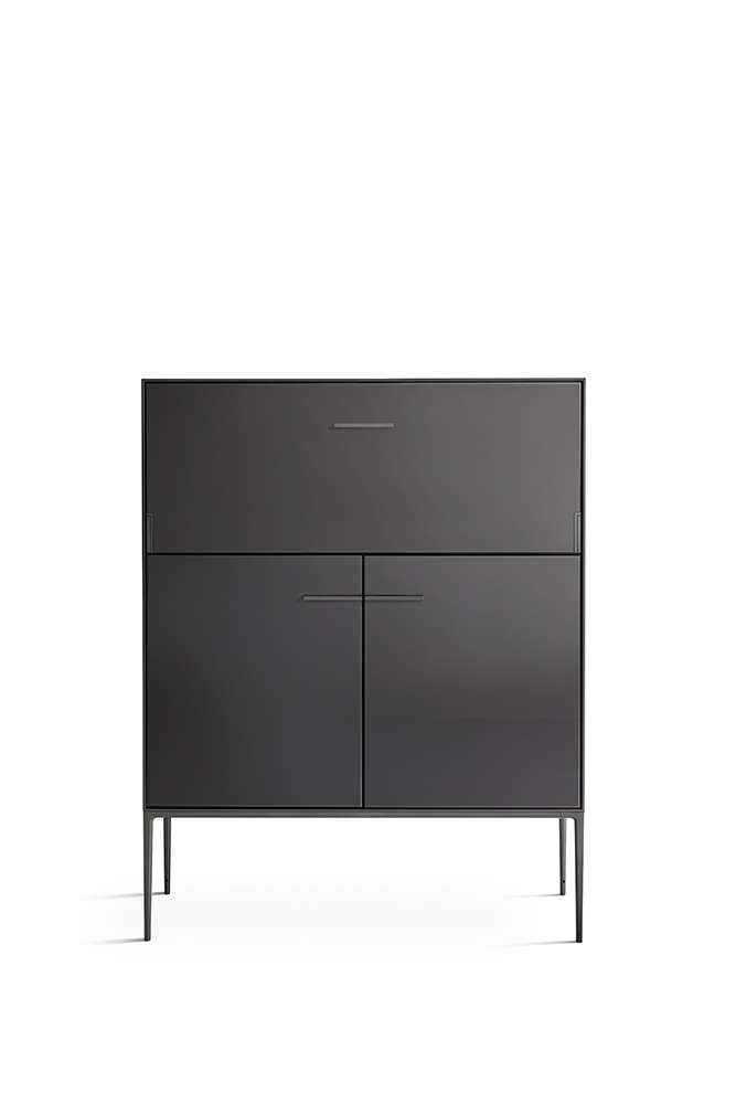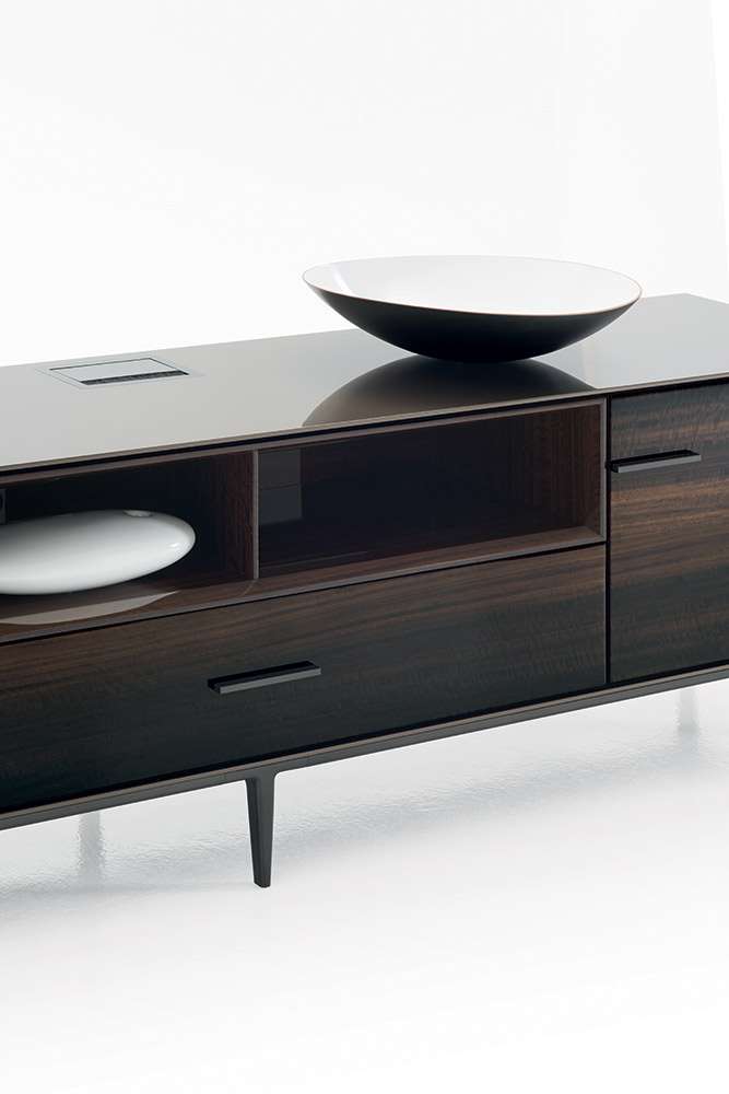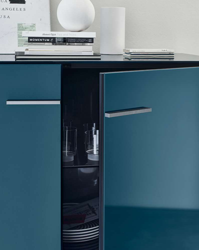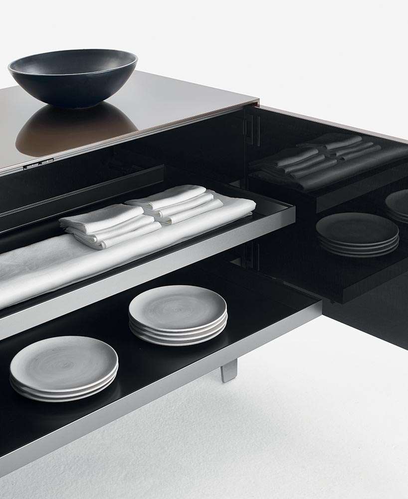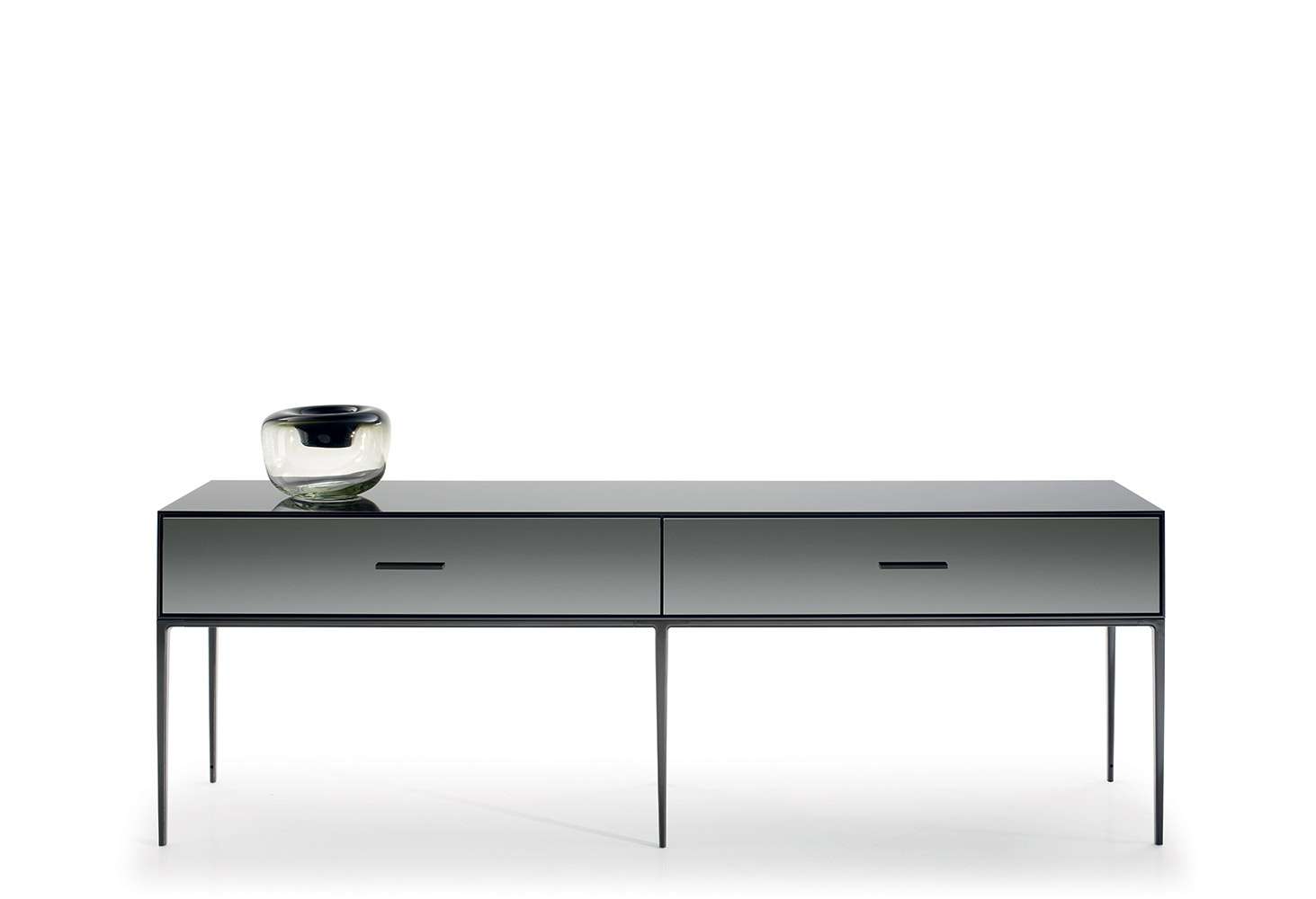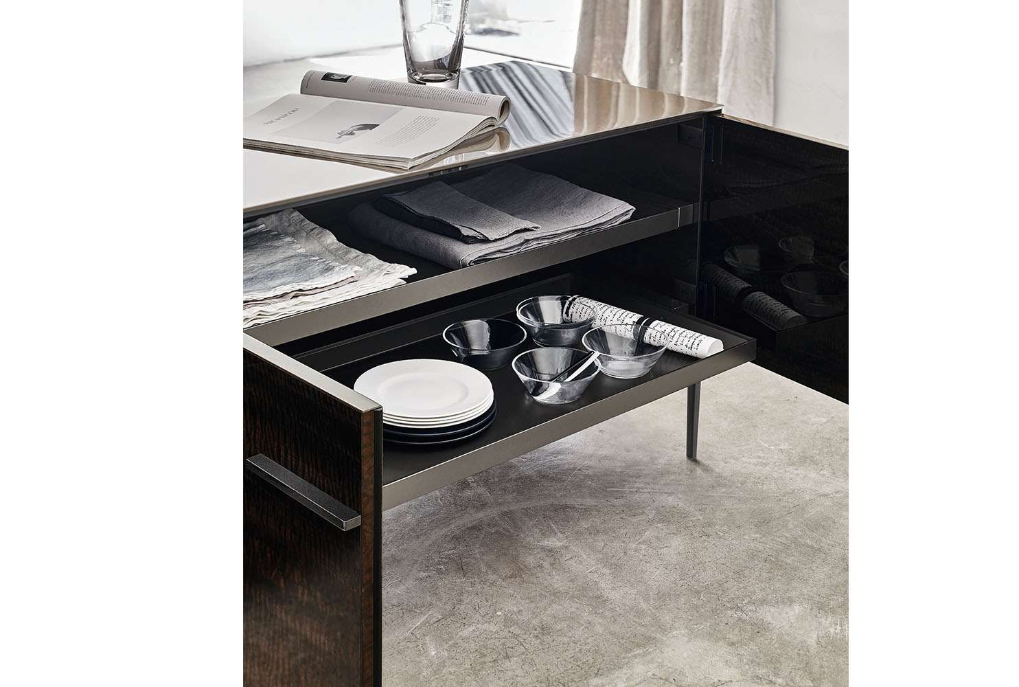 Eucalipto is the name of a series of units designed for the living room, dining room or wherever a special focus is required. Eucalipto enriches B&B Italia’s collection with a sophisticated touch suggesting original glamorous combinations. For the carcass acrylic finish that develops in three variants with different combinations for doors and drawers: black structure with doors and drawers in grey mirror, in black back-painted glass or in eucalyptus frisé wood with glossy finish; bronze structure with doors and drawers in bronzed mirror, in bronze back-painted glass or in eucalyptus frisé wood with glossy finish; teal blue structure with doors and drawers in grey mirror teal in teal blue back-painted glass or in eucalyptus frisé wood with glossy finish.