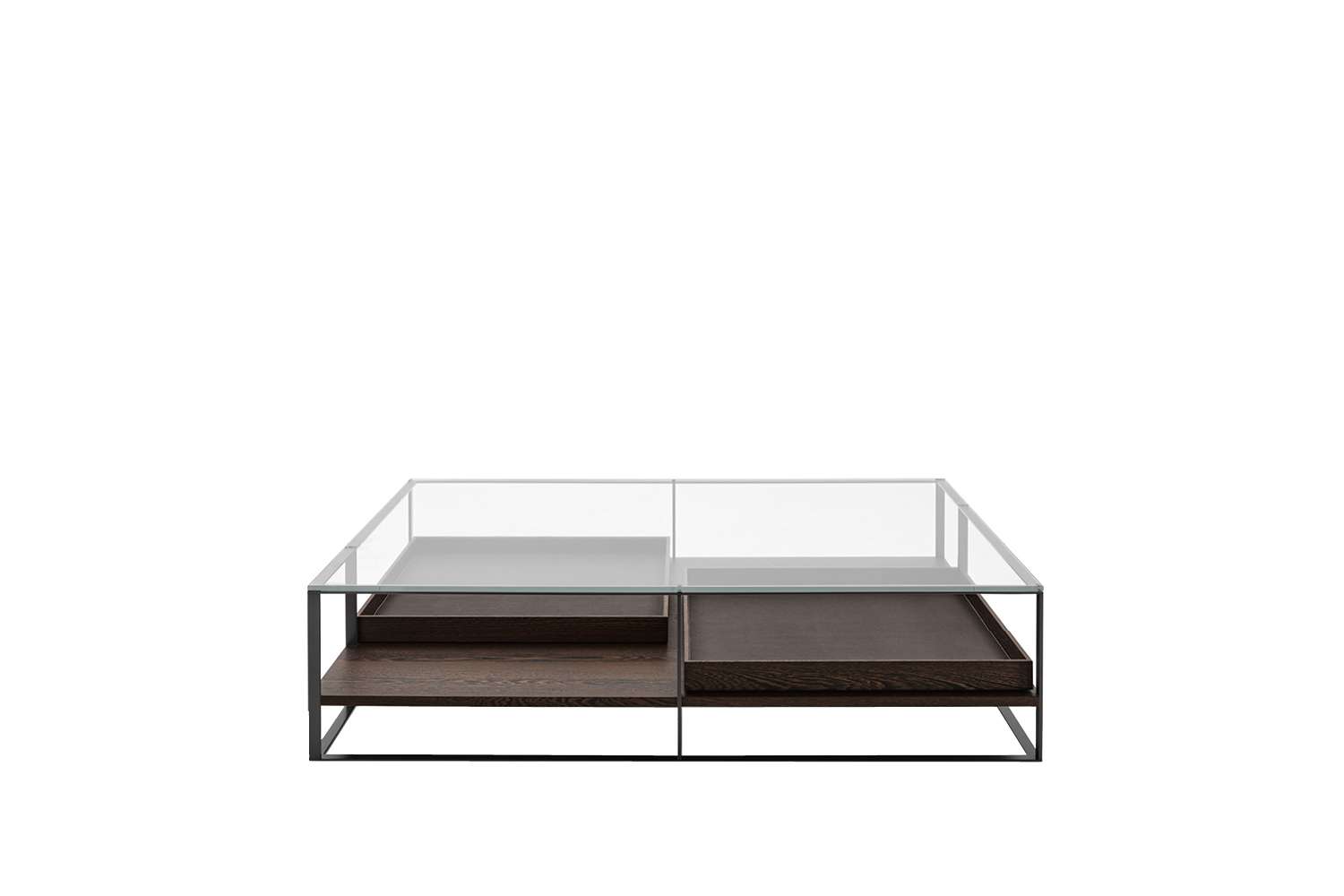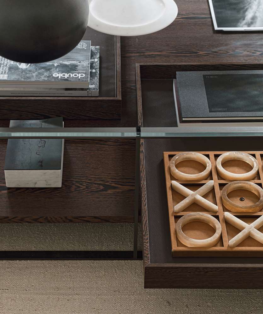 A series of cabinets display elements and low tables destined to safeguard and exhibit the most precious objects with great elegance. Ideal for both homes and commercial spaces, to be placed also in the centre of the room, these pieces allow their contents to be viewed, extracted and repositioned easily with perfect order. Cabinets are available in one size (cm.180x50x80h.) and in three different versions with extractable trays and drawers; the low tables are available in two versions (cm.90x130x43h. and cm.180x130x43h.), both with extractable trays. The entire range pairs tops in transparent extra clear glass with painted metal structures in sophisticated colours bronzed nickel, black chrome, graphite and amber. Shelves, drawers and extractable trays - the latter featuring a leather lining in colonial or dark brown leather - are available in natural wenge and oak in the different options in the collection brushed light, brushed black, grey, smoked oak.