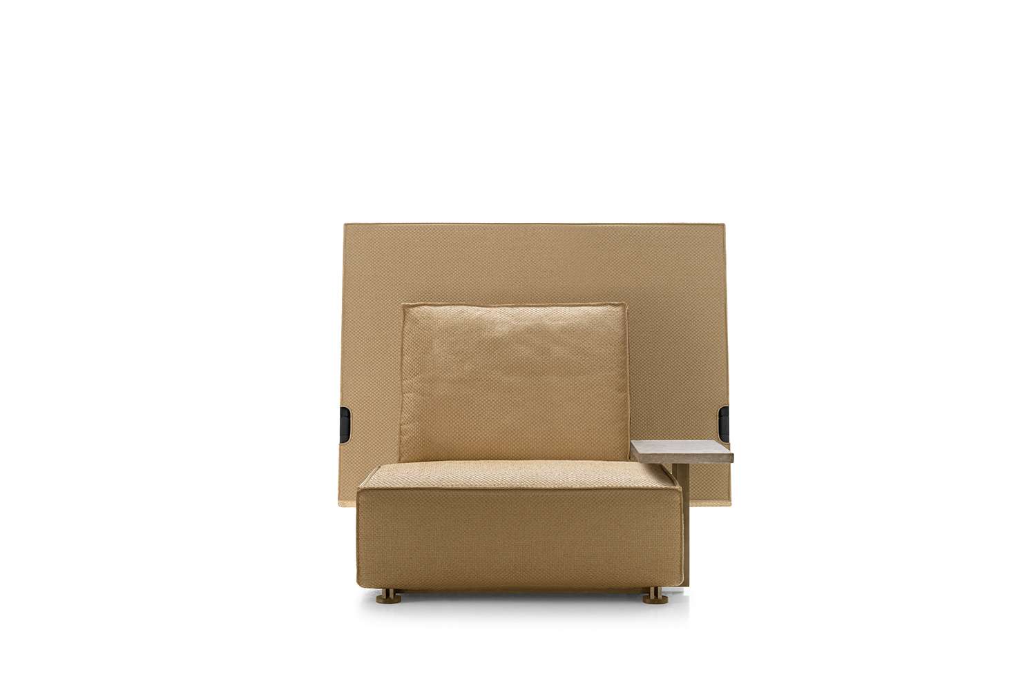 The very first collaboration between B&B Italia and Philippe Starck leads to the birth of a sofa and an armchair, both with impressive dimensions and a highly scenographic presence, that surprisingly combine an unusual shape and an unexpected function, with a name that really attracts attention. Oh, it rains! is a piece of considerable impact, destined to last over time and to be talked about, but also to be used in the most unexpected ways and contexts. Philippe Starck started his research for this project by going back to the origins of outdoor furniture, that of nomads and soldiers: desert tents and field equipment, colonial colors and very light materials, essential shapes with functions connected with rapid action. We notice Oh, it rains! right away for its large backrest. It isn’t a simple decorative element, though. It acts like a wall or a partition to create an intimate and private setting, and, when necessary, it folds down on top of the seat and - voilà - the seat and cushions are covered and protected. Colours and materials go hand in hand with the initial concept and the collection introduces colonial shades and raffia-effect waterproof fabrics.