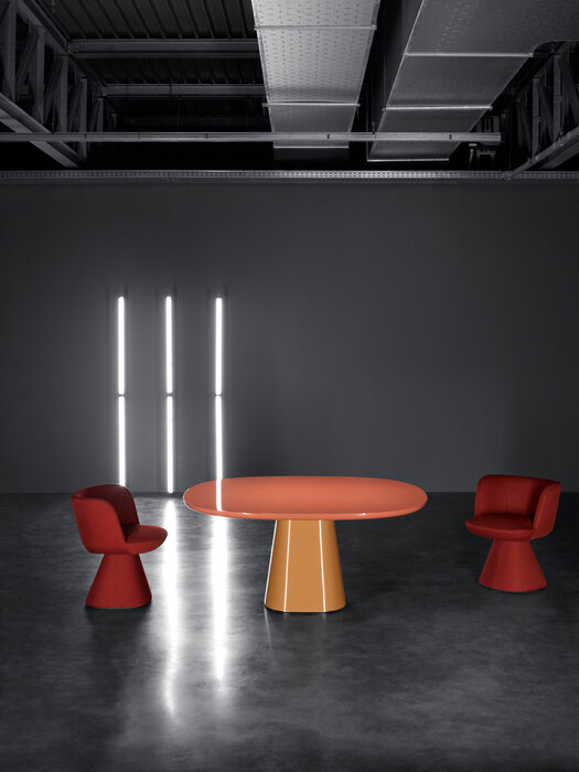 The Allure O’ table is presented as a heart-felt tribute to glamour interpreted in contemporary style. The graceful force of its design is clearly seen in the shape of the top and the balance between the control of straight lines and sinuosity of curves. In an interplay of elliptical geometric shapes that recalls the Madison mirror, designed by Monica Armani in 2017, this piece renews the reference of the shape of Jackie O’s iconic eyeglasses. Allure O’ is available with a square or rectangular top, both with bevelled edges, and each comes in two sizes to seat four, six, or even eight people. The section of the truncated pyramid base replicates the rigorous balance of the top with delicate proportions to create a level of harmony that can guarantee structural and visual stability. The finishes underscore the sophisticated elegance of the inspiring concept behind it. These pieces are available in glossy and matte painted finishes in many colours, and also in light and black oak wood. The top and base can also be finished in combinations of different colours. Furthermore, the table Allure O' can be enhanced with an upper marble top or with sophisticated glossy black glass.
