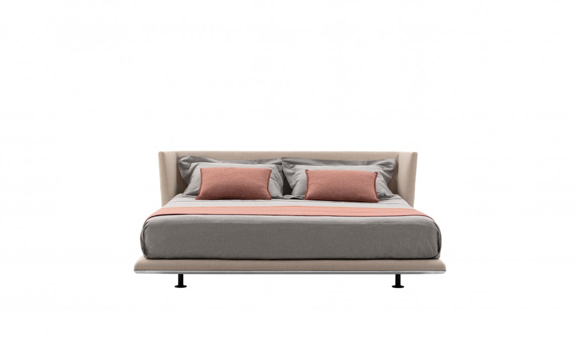 A brand new element in the Noonu archipelago is the bed. Its lines echo the design of the sofa, in particular the headboard, an element that instantly stands out for its understated grandeur, attracting the eye and enveloping the body. In pure Noonu style, the underlying frame is slightly suspended off the ground as if floating on the floor. At the base of the bed we find the usual metal profile in curved aluminium, available in bright brushed, black chromed and pewter grey versions. As with the whole Noonu range, the bed can be covered in leather or fabric. For ease of movement, the bed can rest on four fixed feet or on two fixed feet and two wheels, positioned inside the frame to remove them from view.