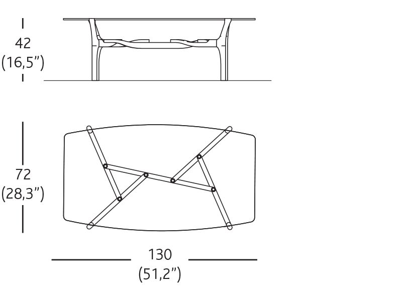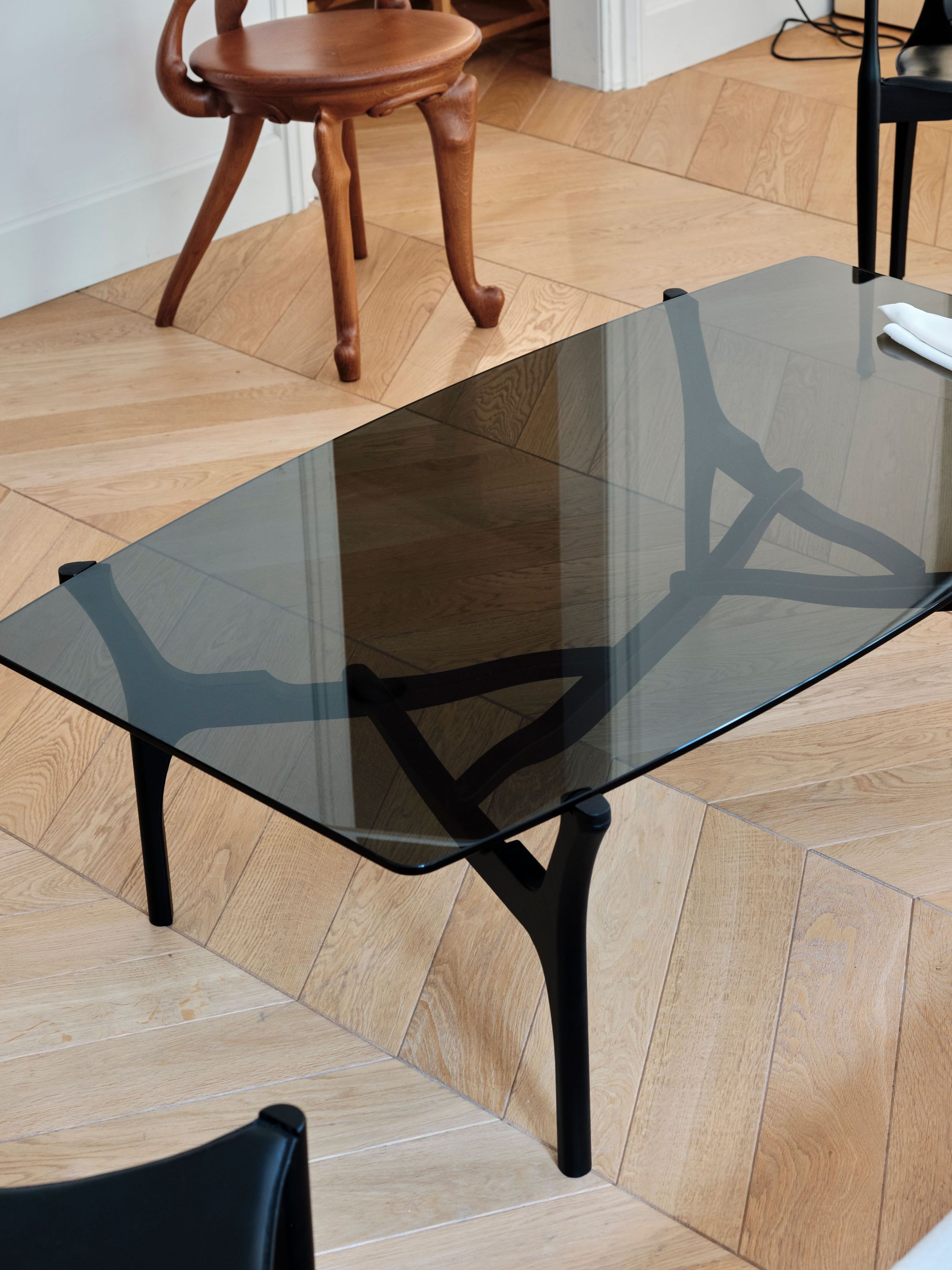Biomorphic wood triangulates on the side table and stabilises larger tables with a diagonal crossbar. The stabilising structure twists like entwined fingers, and legs come out of the table like bent knees.