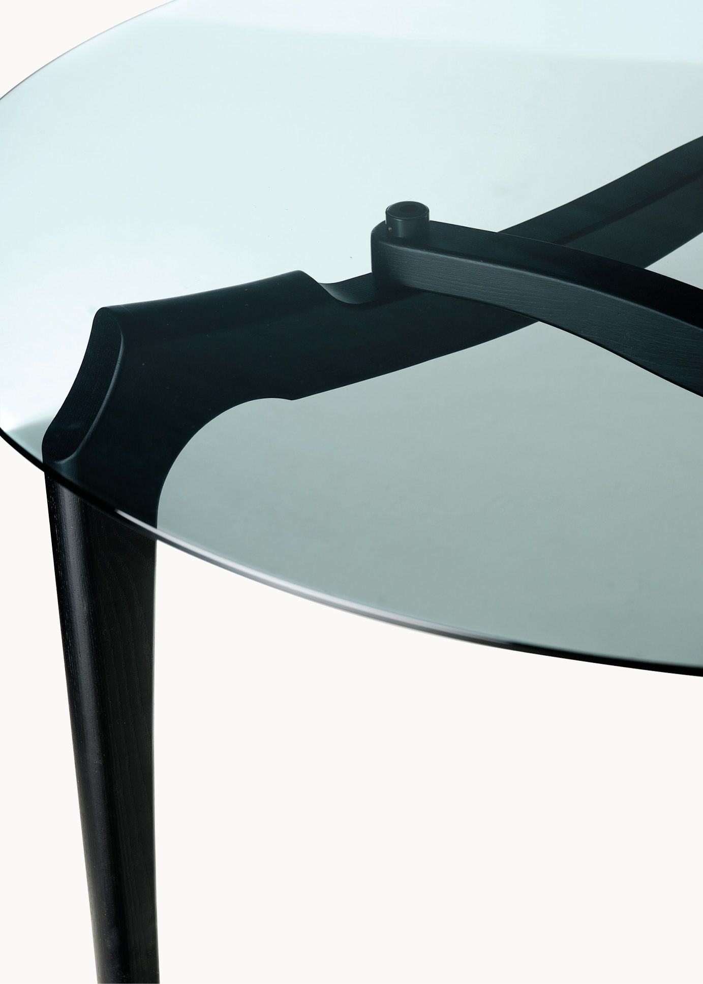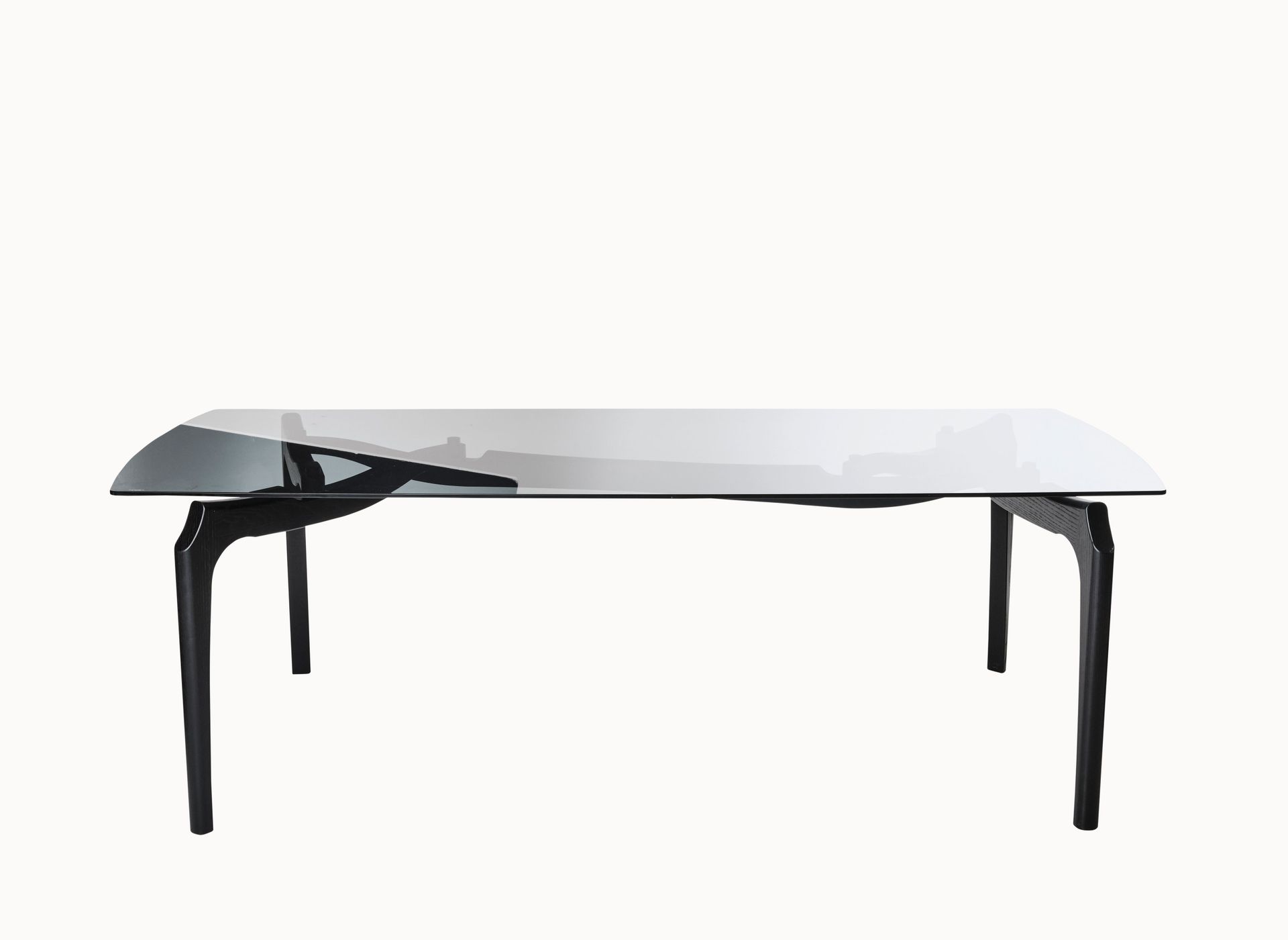 Biomorphic wood triangulates on the side table and stabilises larger tables with a diagonal crossbar. The stabilising structure twists like entwined fingers, and legs come out of the table like bent knees.