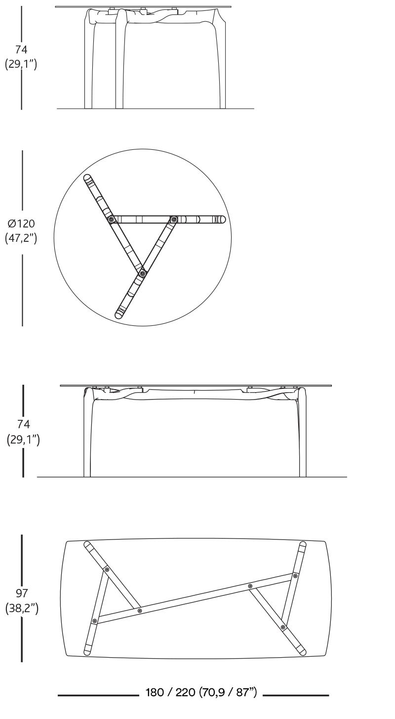 Cheekily calling to Carlo Mollino’s greater influence on Oscar Tusquets, these tables were named Carlinas. Their clear surface exposes the now-visual supporting structures. Like Mollino’s nature-informed pieces, the Carlinas boast punctuating twisting stretchers that hold the smoked glass tabletop.