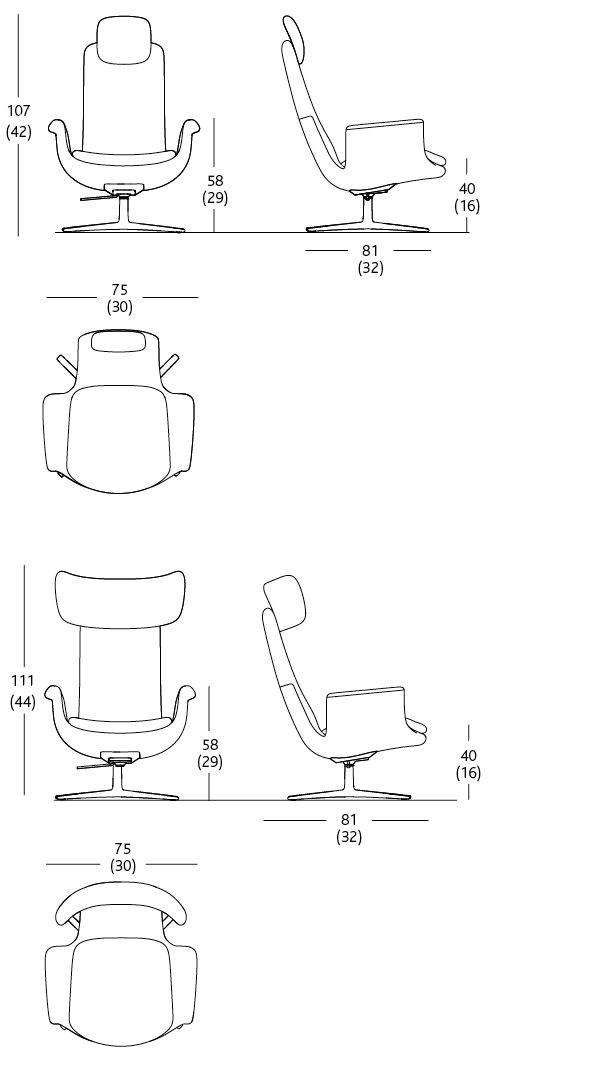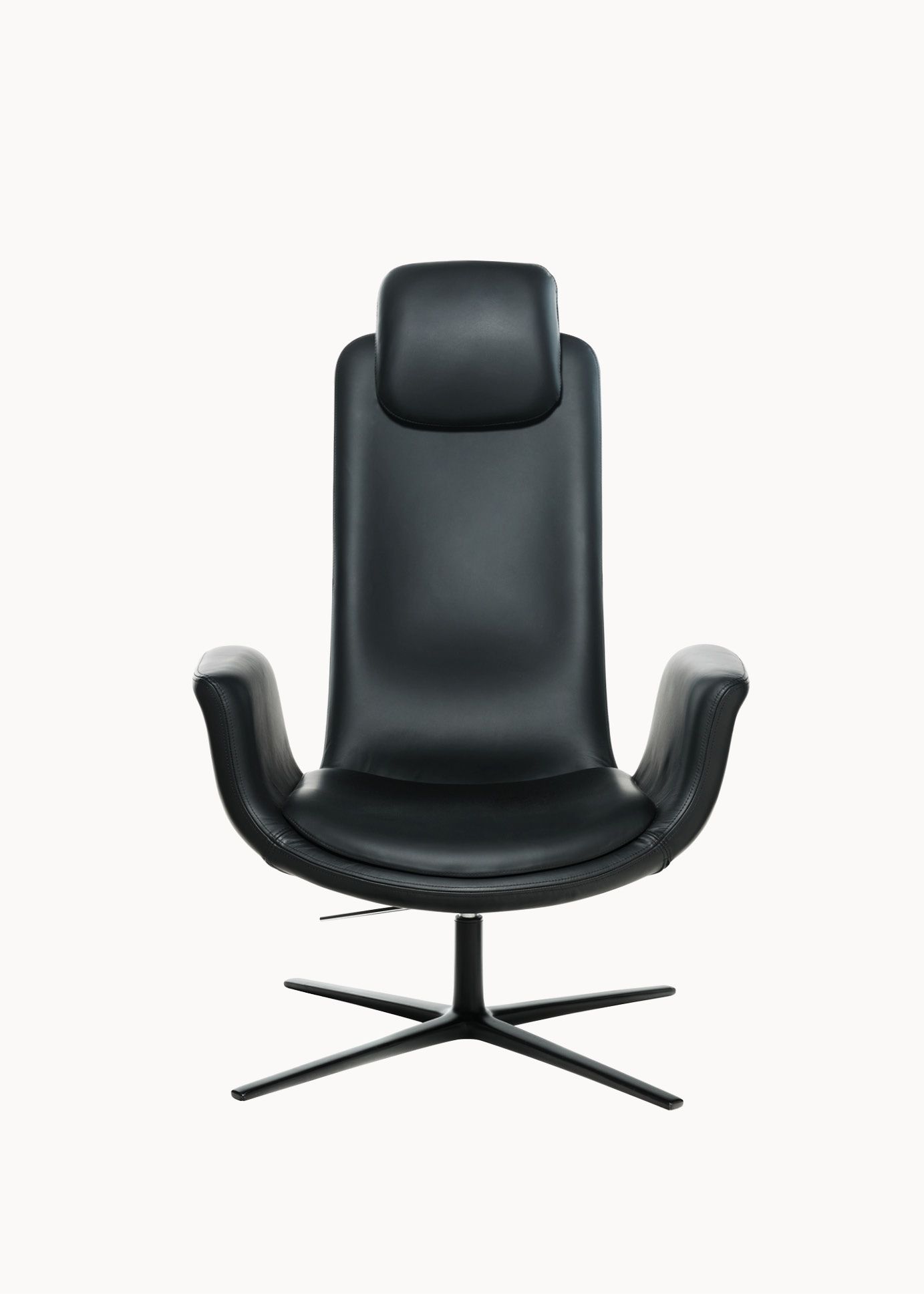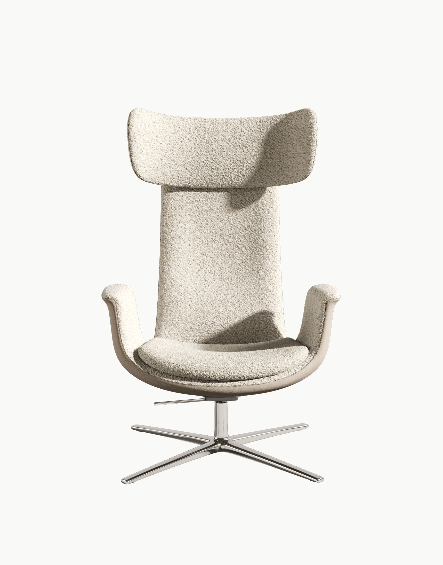 Odyssey could be described as autobiographical. Reflecting the journey from the designer’s native Ibiza to explore the nature of Space through his eclectic oeuvre. An expression of gravity-defying seating that envelops the human body. Its kinetic and sculptural qualities come together in a fluid silhouette. The adjustable headrest and tilting mechanism together with the curved forms recall futuristic Science Fiction.