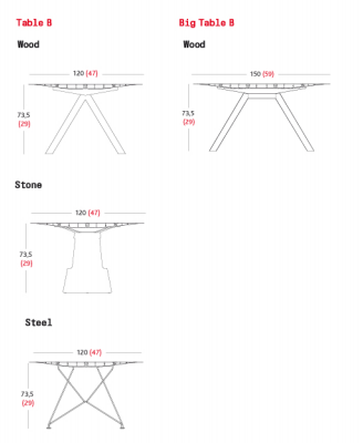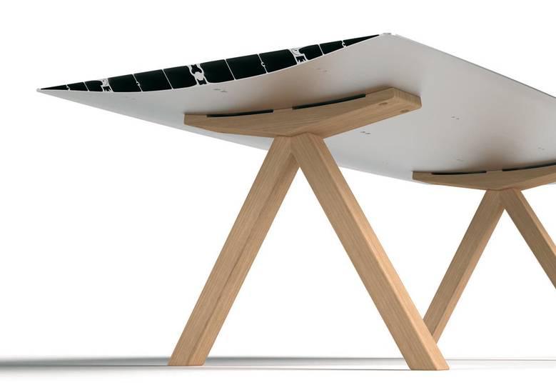 Sobre en extrusión de aluminio con bisel. La cara superior se puede aplacar con chapa de estratificado. Existen tres tipos de patas: en hormigón arquitectónico gris, varilla inoxidable y en roble natural con barniz al agua.