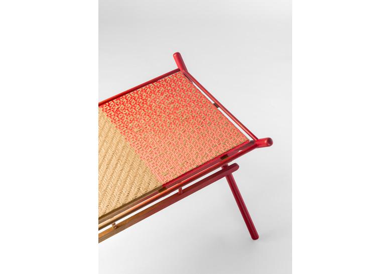 Estructura de roble macizo y bandeja tejida con cinta de papel craft y textil roja.
